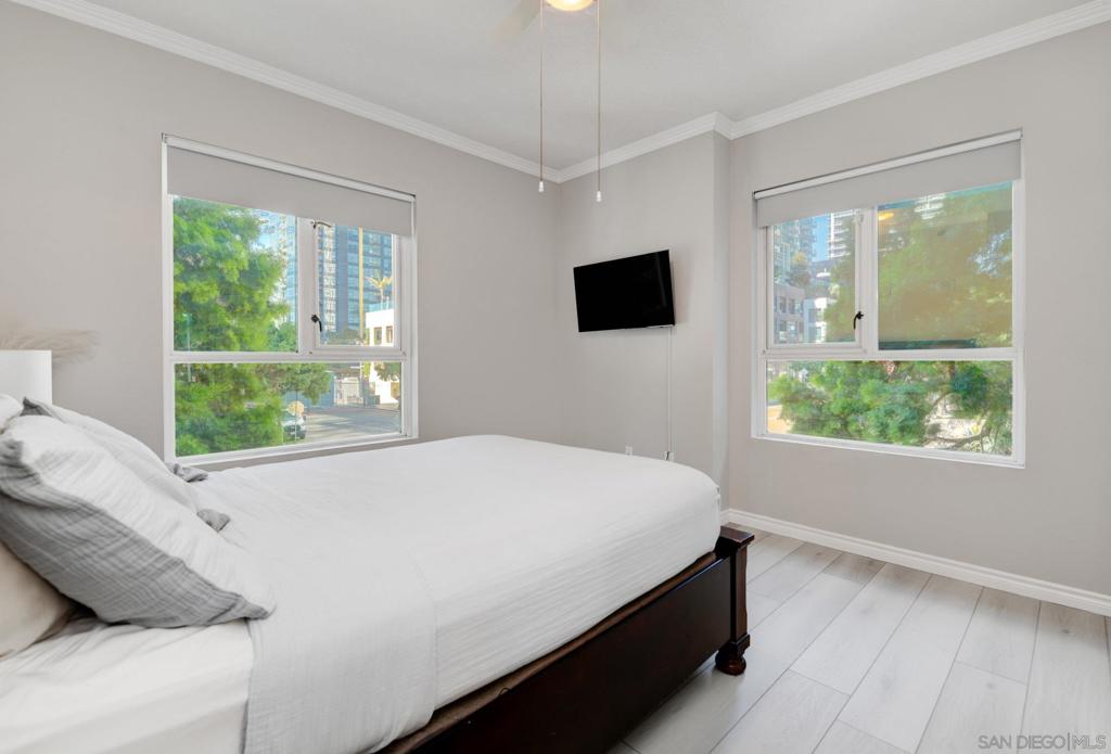 Discover this truly rare corner townhome unit in the sought-after Treo community! This private and rarely available corner unit offers convenience, privacy, and charm. With only one shared neighbor and extra windows throughout, this unit lives like a detached residence. Enjoy the ease of private walk-up access through your own street-level gated patio — perfect for pet owners and guests! Inside, soaring ceilings welcome you into a thoughtfully designed open floorplan. The main level features a modern kitchen with updated cabinetry, new stainless-steel appliances, fresh paint, stylish light fixtures, and a spacious island that flows into a dedicated dining area and private patio. The living room is warm and inviting with a cozy gas fireplace, there's a convenient half bath and plus ample under-staircase storage. Upstairs, you'll find two generously sized bedrooms with ceiling fans and each has its own en-suite bathroom, plus an in-unit stacked washer/dryer. The home includes one assigned parking space and a private storage unit, with easy access to rent a second parking space if needed. Treo residents enjoy an array of amenities including a pool, spa, fitness center, clubhouse, BBQ areas, and lushly landscaped courtyards. The community is pet-friendly with low HOA dues and an unbeatable walkable location. Located in the Columbia District, you’re just moments from the Trolley, Santa Fe Train Station, Seaport Village, Waterfront Park, and just steps from the vibrant neighborhood of Little Italy.