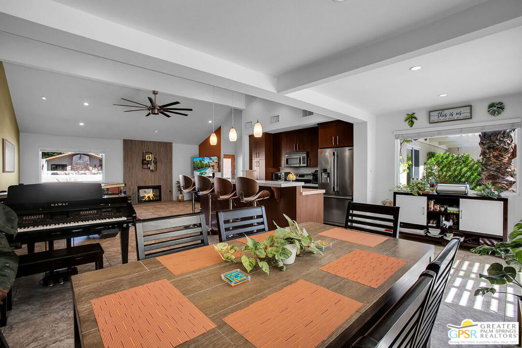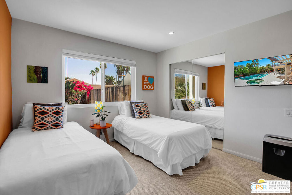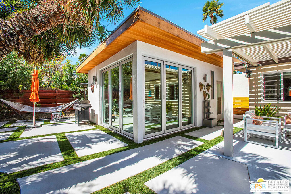 Experience the perfect blend of modern luxury and iconic design in this beautifully renovated and expanded 4-bedroom, 3-bathroom desert retreat originally crafted by acclaimed architect Hugh Kaptur. Offered fully furnished, this home is ideal as a stylish primary residence or a highly desirable vacation rental, especially with the addition of a charming detached casita completed in 2022. Inside, you'll immediately notice the exceptional craftsmanship and thoughtful finishes throughout. The open-concept great room is an entertainer's dream, featuring soaring ceilings, a cozy fireplace, and seamless flow between the spacious living area, dining space, and island kitchen with bar seating. The expansive primary suite is a true sanctuary, boasting a luxurious ensuite bathroom with dual vanities and a rain shower, plus a generous walk-in closet. Two additional bedrooms in the main house provide comfortable accommodations for guests or family. The recently added 300 sq ft casita elevates the resort-like atmosphere, featuring floor-to-ceiling glass doors that open to the lush yard and pool. Complete with its own full bathroom (with separate pool access) and a convenient kitchenette, the casita is the perfect hub for all your outdoor entertainment activities. Equipped with its own Eco air system, the casita can be incredibly versatile, also serving as an art studio, gym, or additional bedroom for guests or in-laws. Step outside to your private backyard paradise an inviting, updated saltwater pool and spa surrounded by mature landscaping and multiple lounging areas complete with fire table. This home is fully equipped with smart home technology, automated pool controls, a solar energy system, and EV charging, delivering energy efficiency and modern convenience. To explore the full list of upgrades and features, contact agent to schedule a private tour of this exceptional property or for a link to the virtual tour.