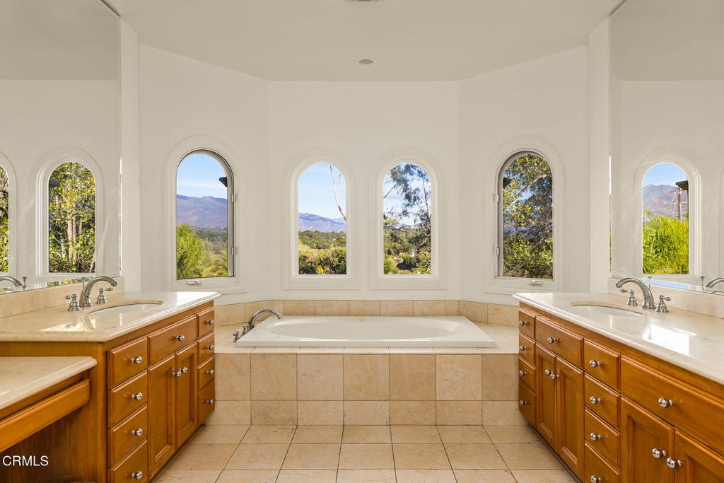 Elegant Mediterranean Estate - Located in the exclusive gated community of Rancho Matilija, this stunning home captures the serene beauty of Ojai with vistas from every angle. Bordered by the Ojai Land Conservancy and Ventura River, the property offers unmatched privacy and direct access to equestrian and pedestrian trails leading to the Los Padres National Forest and surrounding neighborhood paths. Enjoy sweeping views of the Ojai Valley and the iconic Topa Topa Mountains, the home features five spacious bedrooms and five bathrooms, including a primary suite with stunning views, a luxurious en-suite bathroom, and a large walk-in closet. Designed with comfort and style in mind, the open floor plan includes travertine flooring in the entry and kitchen, solid hardwood in main living areas, and three inviting fireplaces. Additional features include a three-car garage and an EV charger.Set on almost 3 acres with a vast variety of plants and trees including: citrus, palm, and olive trees, the backyard offers a tranquil escape with breathtaking views of Ojai's famous Pink Moment. Just minutes from Lake Casitas, downtown Ojai, and top private schools, the property is also within easy reach of Ventura, Carpentaria, Santa Barbara, and Los Angeles.Also available for lease for $14,500/month