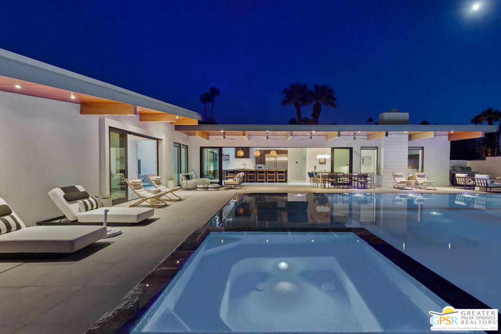 A rare blend of provenance and polish, this is classic Palm Springs style elevated. An original 1961 Alexander Company home, extensively renovated and reimagined. Authentic, clean mid-century lines honor its true architectural history. The floor-to-ceiling glass with a bright open layout showcases the spectacular, south and west facing mountain views from the main living areas. Timeless architecture meets modern comfort, featuring crisp finishes and a seamless indoor-outdoor flow that is ideal for desert living. Step inside to discover a beautifully appointed interior featuring stone and tile floors, illuminated by elegant chandeliers and recessed lighting. The expansive floor plan includes 4 bedrooms and 4.5 bathrooms. Three bedrooms are ensuite with walk-in showers and elevated finishes. The property features a chef's kitchen with Walnut cabinetry and high-end appliances. The large honed island anchors the kitchen and is perfectly located for indoor and outdoor living through the large stacking exterior doors. The smart home features will make everything a breeze with automatic blackout shades and integrated audio, lighting, and multi-zoned AC. Having owned solar panels with new doors and windows helps create a comfortable and efficient home. Outside, the private yard has large protective wood-clad overhangs complete with a 4-sided saltwater infinity pool with a heating and cooling system, an elevated spa, and a large tanning shelf. Enjoy evenings by the fire pit or relax on the private patios with mature landscaping. Patios off each bedroom are the perfect private places for family or guests to unwind and take in the views. This Modernism Week show home is a rare gem in one of the most coveted neighborhoods of Palm Springs.