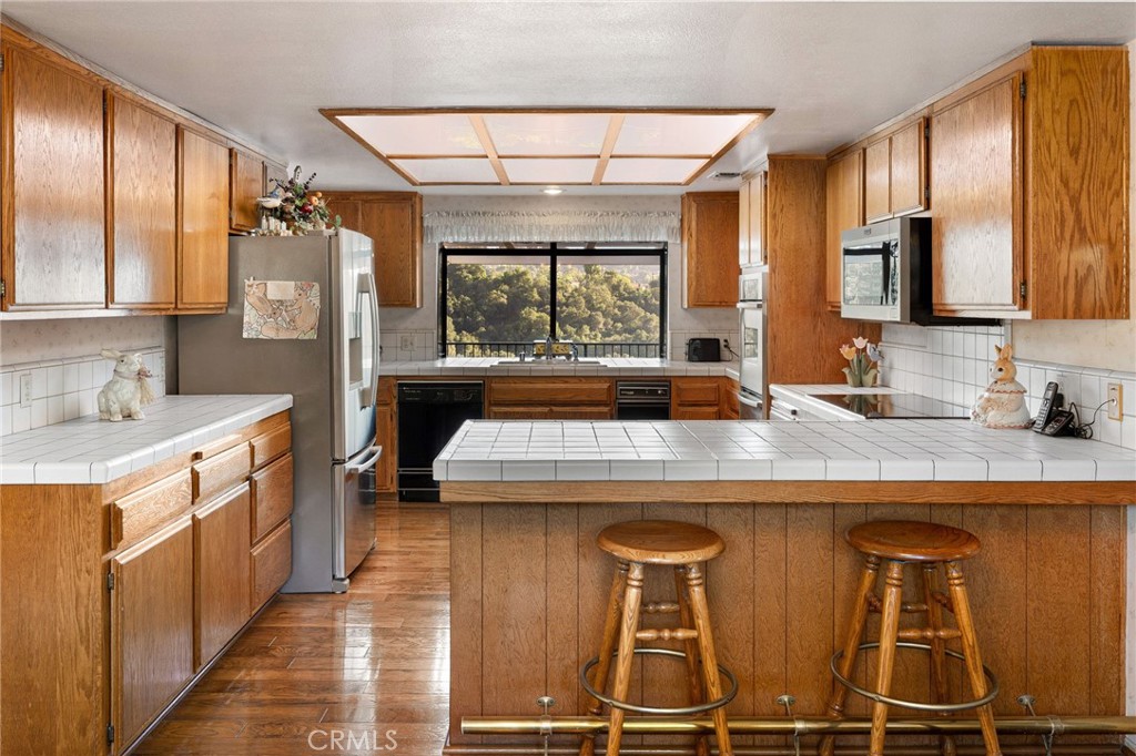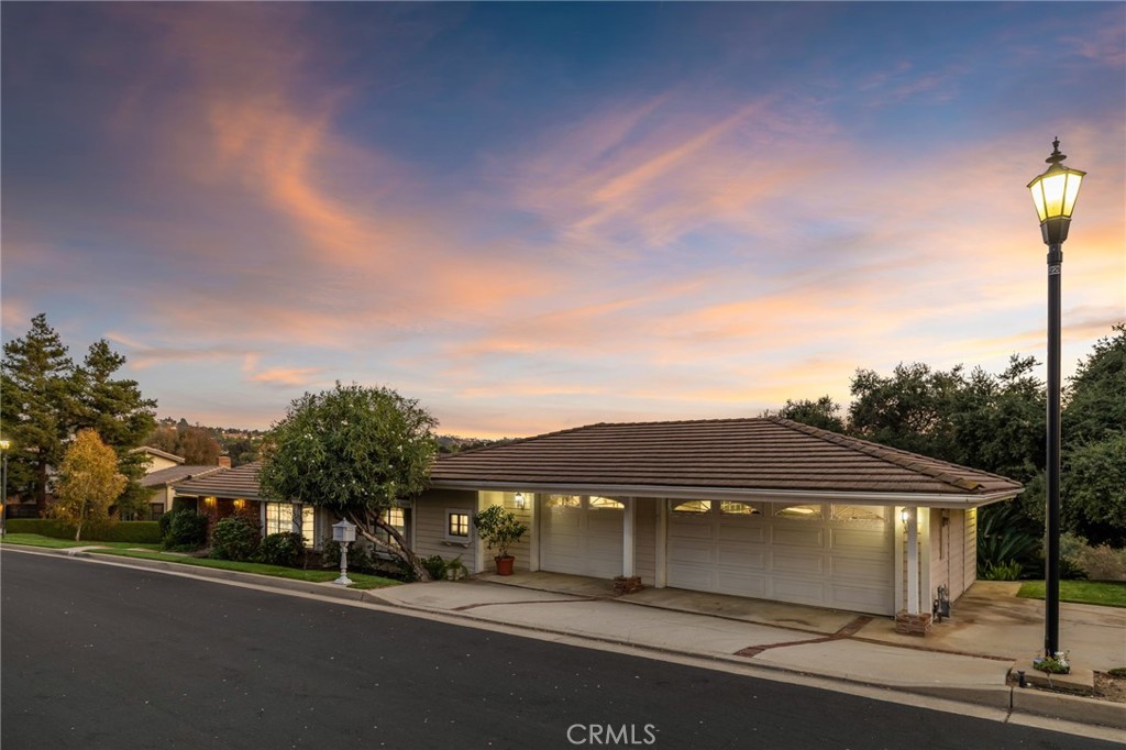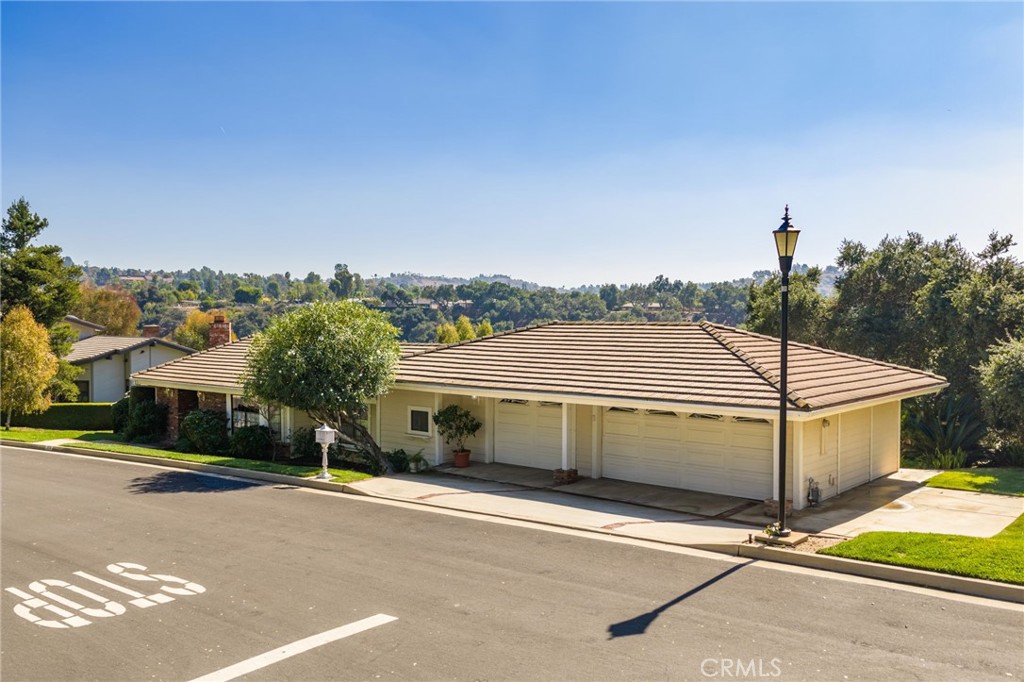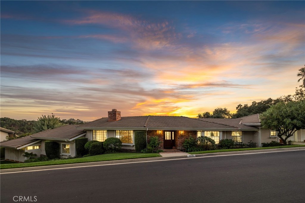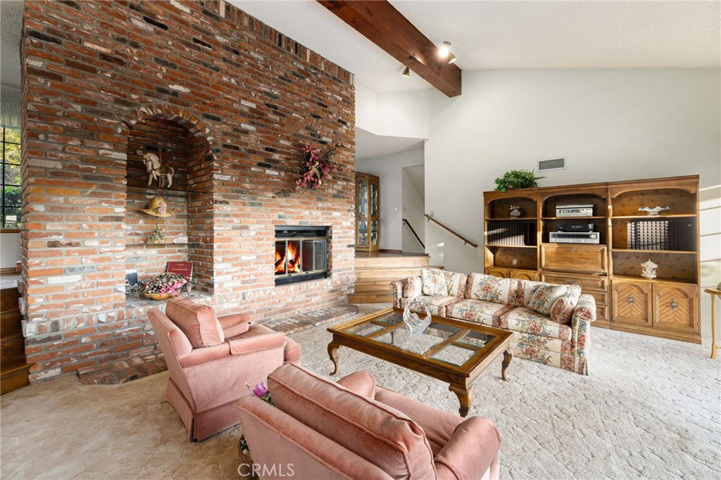 Custom-built home on a prime street with panoramic views and an oversized, horse-zoned lot. Exceptional curb appeal includes a sprawling brick façade, manicured lawn and landscaping, mature trees, and concrete steps to a covered brick porch with a wood-and-glass front door. Inside, hardwood floors lead to a formal dining room and a view-filled living room; the dining room opens through French doors to the back deck and overlooks the living room via an open wrought-iron railing. The living room showcases a full wall of glass framing sweeping vistas, a floor-to-ceiling brick fireplace, and a vaulted ceiling with exposed-beam detail. The spacious kitchen offers solid wood cabinetry, tiled counters and backsplash, stainless steel appliances, a view-facing garden window, and a peninsula with counter seating, while a breakfast nook sits at a bay window overlooking the front yard. A separate family room features a 12-foot sliding door to the deck, more views, a built-in bar, and a vaulted ceiling with an exposed beam. Two convenient half baths serve guests. Down the hall, the primary bedroom includes a ceiling fan, sliding door to the deck and views, a walk-in closet, and an ensuite bath with dual sinks, a tub with tile surround, and a separate glass-enclosed shower. Three additional bedrooms (one with built-ins, currently used as an office) share a full hall bath. An indoor laundry/mudroom with ample cabinetry opens to the backyard and connects to the attached three-car garage. Outside, a deck spans the width of the home to take in unobstructed views of the horse ring below, the canyon, hills, and beyond, while the side yards provide additional space with a rolling lawn and oak trees.