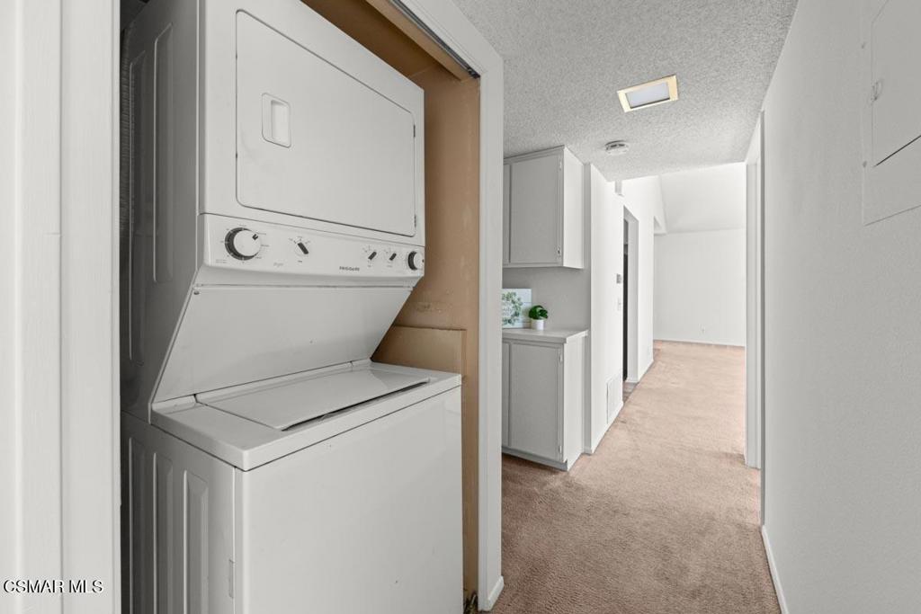 Charming and clean two bedroom two bath West Simi condo. Quiet upstairs unit features soaring ceilings, living room with cozy fireplace and mountain views. Recently upgraded with new kitchen dishwasher and gas range appliances, as well as kitchen and bathroom flooring. Interior has been freshly painted. Bathrooms have newer toilets. The large primary suite offers two closets and dressing area off primary bath. Stackable washer/dryer included making laundry a snap. Step out balcony off living area enjoys a lovely view of the surrounding area. Lovely community pool, spas, BBQ's, tennis courts and clubhouse. The HOA covers water, trash and earthquake insurance, The unit has an assigned carport which includes an extra storage cabinet. Conveniently located near shopping, recreation and entertainment. Far enough away yet close to freeway for an easy 118 commute.