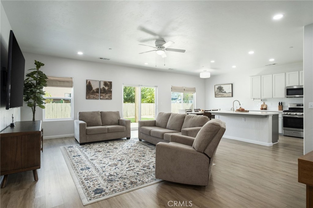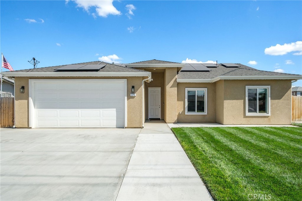 Move-in Ready Like-New 3 Bedroom 2 Bath Home in Southwest Hanford was built in 2023 and comes with OWNED SOLAR and includes 2 APN's (parcels) creating a very spacious lot! Designed with attention to detail and premium upgrades, the Open floor plan is accentuated by a modern kitchen showcasing a quartz countertop island and countertops with white subway tile backsplash, seamlessly integrating with the designated dining space. The layout boasts a strategic split-bedroom design, the primary suite near the laundry room on one end, and two additional bedrooms accompanied by a guest bathroom with a tub on the opposite side of the home offer both privacy and convenience. Noteworthy features include luxury Vinyl Tile flooring throughout the living room, kitchen, dining, hallways and bathroom areas, emphasizing durability and aesthetic appeal. A generously sized primary bedroom equipped with a substantial walk-in closet, ambient natural light from a rear-facing window, and an ensuite bathroom with dual sinks and a large walk-in shower offer the elegance one seeks at the end of a long day. An eco-friendly approach to modern living with fully owned Solar and an expansive backyard, the combination of two parcels, provides ample space for diverse landscaping and/or recreational projects, maybe even an ADU. Other key amenities include an on-demand tankless water heater, stainless steel appliances, a spacious two-car garage, and a professionally landscaped front yard are waiting for you to call it Home! Preferred Lender Seller credit available for potentially a 2:1 Interest Rate Buy Down with pricing strategy, call agent for details!!
