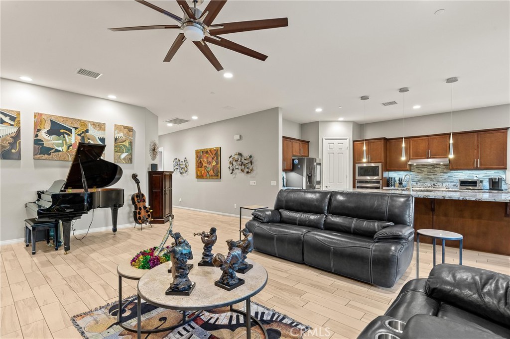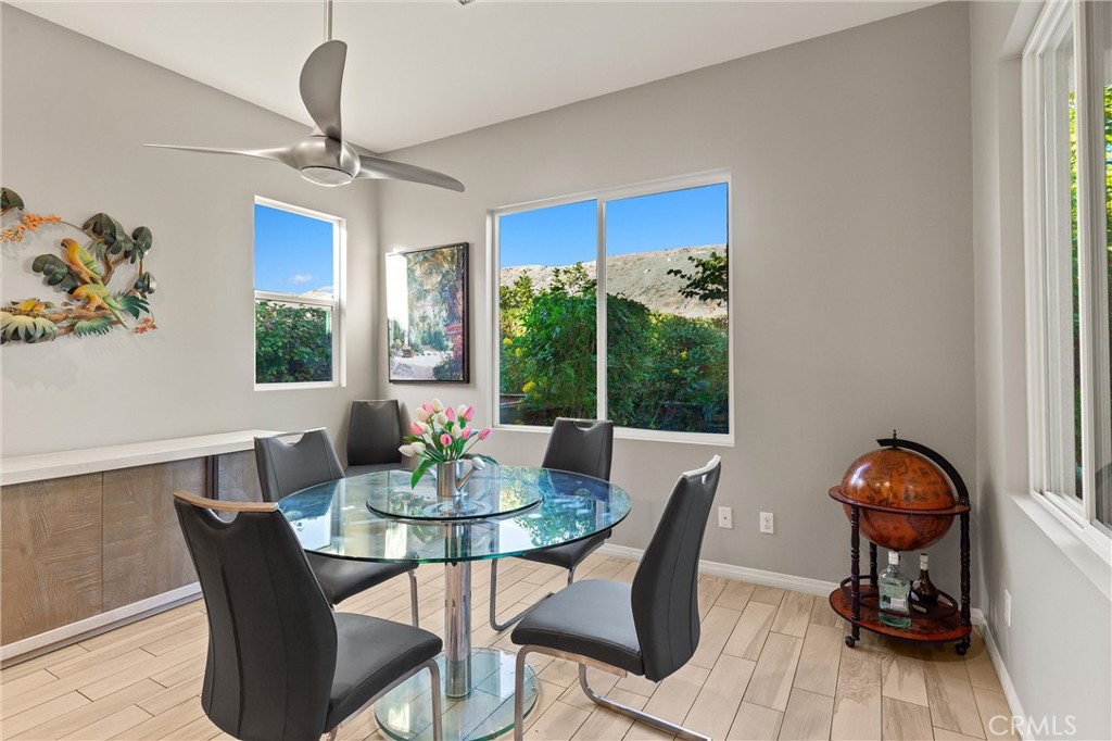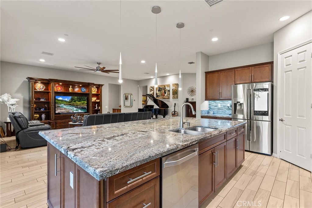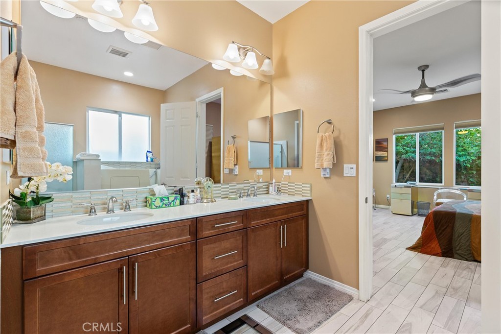 Welcome to resort-style living in Four Seasons Terra Lago, one of the Coachella Valley's premier 55+ active communities. This Pinion Flats model showcases elegant design & thoughtful functionality throughout its spacious, open floor plan. From the moment you enter, you'll appreciate the premium tile flooring that flows seamlessly throughout, complemented by plantation shutters & custom cabinetry that create a cohesive, sophisticated atmosphere. The flexible floor plan includes a dedicated library/study that adapts to your lifestyle, while the Jack & Jill bedrooms share a full bath & work beautifully as guest quarters or a private suite. The chef's kitchen serves as the heart of this home, featuring expansive granite countertops, custom backsplash, and premium cabinetry with designer pulls. High-end appliances are enhanced by thoughtful details like under-cabinet lighting, pull-out shelving, and custom pendant fixtures, while a walk-in pantry provides abundant storage. Your primary suite is a true retreat, offering motorized window treatments and a spa-inspired ensuite bath with double vanity, walk-in jacuzzi tub, & separate shower. The adjacent custom dressing room provides exceptional storage, and here's a brilliant touch—it connects directly to the laundry room, eliminating those basket-carrying trips down the hall. The oversized laundry room itself is a showpiece, featuring a utility sink, extensive upper & lower cabinetry, folding counter, plus washer and dryer. An additional large storage room adjoins the dressing area, so you'll never run out of space. Step outside to your private desert oasis, where mature citrus trees and a stunning Hong Kong Orchid tree frame the professionally landscaped patio. Gather around the fire pit under the soft glow of garden lighting, cooled by the overhead fan—it's the perfect setting for entertaining or quiet evenings. The two-car garage includes an attached golf cart garage, keeping everything protected & ready for your next adventure. The Four Seasons Terra Lago lifestyle extends far beyond your front door. The clubhouse rivals any luxury resort with its 22,000 sq ft state-of-the-art fitness center, ballroom, beauty salon with massage room, and indoor lap pool. Outside, the resort-style pool and spa beckon with cabanas, while bocce ball and tennis courts offer endless activities. With golf courses, dining, shopping, and freeway access all nearby, you'll enjoy the perfect balance of tranquility and convenience.