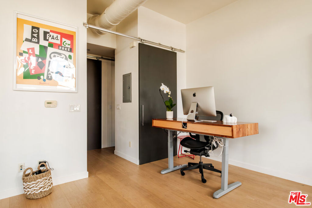 Welcome to this sun-drenched, industrial-chic corner unit in the coveted Broadway Lofts. This exceptional loft-style studio on the second floor blends urban sophistication with beachside ease, showcasing walls of glass that bathe the space in natural light from morning to sunset. Unit 205, a rare corner residence, is distinguished by its oversized wraparound deck with captivating city views -- a striking extension of your living space that invites seamless indoor-outdoor living and effortless entertaining. Beyond the entry, an open-concept layout unfolds with soaring ceilings, wide-plank floors, and distinctive loft-inspired detailing. The sleek Italian kitchen, complete with Boffi cabinetry and Caesarstone countertops, flows elegantly into the expansive living and sleeping areas. The well-proportioned sleeping area includes a generous walk-in closet, while the modern bathroom features clean lines and premium finishes. Residents of Broadway Lofts enjoy the peace of mind of a secure-access building, with key fob entry required for all common areas, elevators, and parking. Additional highlights include in-unit laundry, central air, and secure side-by-side parking for two vehicles with ample storage space. Enjoy access to a rooftop viewing deck with panoramic city and mountain vistas, as well as the everyday convenience of Cafe Lovi just steps from your front door. Perfectly positioned just blocks from Memorial Park, Santa Monica Brew Works, Ralphs, Co-Op, Bergamot Station, and an array of shops and restaurants, this home epitomizes Santa Monica living -- stylish, walkable, secure, and distinctly private.