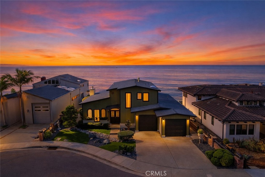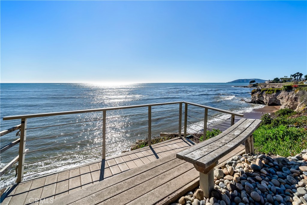 Perched dramatically above the Pacific along Shell Beach’s coveted Shoreline Drive, this Contemporary Coastal retreat captures panoramic ocean views from every room. Thoughtfully redesigned with an emphasis on natural light, clean architectural lines, and seamless indoor-outdoor flow, this residence perfectly balances refined sophistication with relaxed seaside living. The open-concept main level welcomes you with vaulted beamed ceilings and wide-planked flooring that carries throughout the space. Walls of glass frame endless blue horizons and open to a glass-enclosed deck designed for entertaining, dining al fresco, or simply soaking in breathtaking sunsets over the Pacific. The great room centers around a sleek linear fireplace and flows effortlessly into the dining area and gourmet kitchen, where custom cabinetry, a sea-glass mosaic backsplash, and dramatic natural stone countertops reflect the ocean’s hues. Stainless steel appliances, modern lighting, and a stylish breakfast bar complete this elevated culinary space. Upstairs, the primary suite offers a serene private escape with vaulted tongue-and-groove ceilings, a contemporary see-thru fireplace, and sliding glass doors leading to a private balcony overlooking the coastline. The spa-inspired ensuite bath features radiant floor heating, marble and glass finishes, dual vanities, and a large walk-in shower that evokes a luxurious retreat. A custom dressing area with built-ins and mirrored cabinetry provides abundant storage and elegance. Two additional bedrooms on the lower level open directly to the backyard, each featuring sliding glass doors that invite in sea breezes and uninterrupted ocean views. The guest bath is beautifully appointed with sleek tilework, dual vanities, and a walk-in shower with a rainfall fixture. Outside, the blufftop yard offers a front-row seat to the ever-changing coastline. Low-maintenance landscaping, mature plantings, and multiple seating areas create a tranquil environment for relaxing or entertaining above the waves. Supported by its own seawall, the home provides peace of mind and enduring protection from coastal erosion—an invaluable asset on the bluffs. Located in one of Shell Beach’s most desirable enclaves—just moments from oceanfront dining, boutique shops, and coastal trails—this residence embodies the essence of Central Coast living, where architecture and ocean converge in timeless harmony.