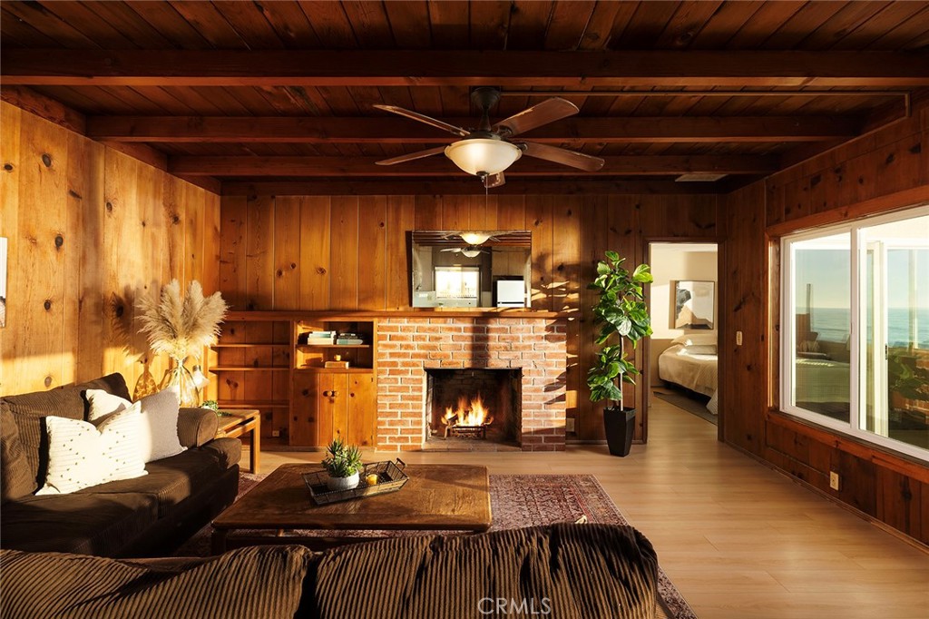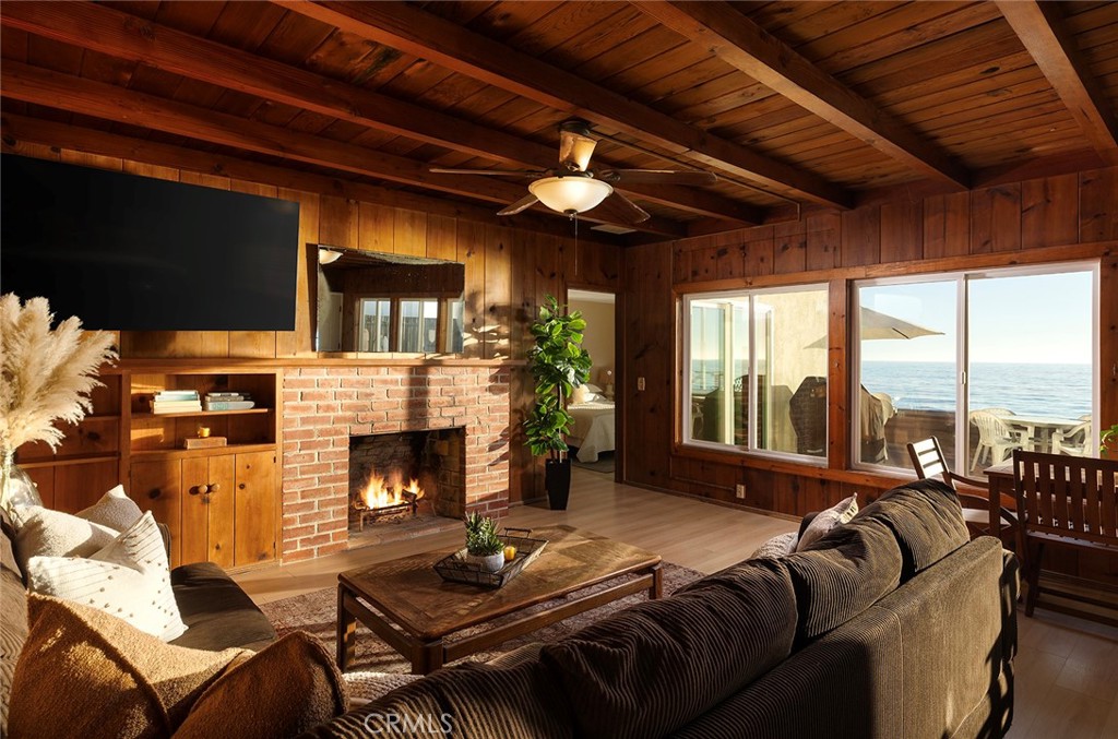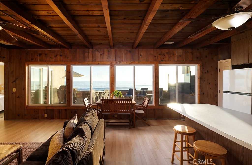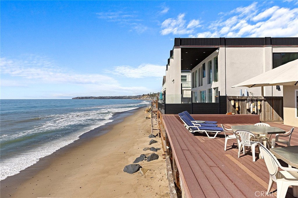 Where classic California lives forever by the sea. Preserved with care and perched directly on the sand, this mid-century beach cottage along Dana Point’s guard-gated Beach Road offers a glimpse into coastal living as it was meant to be—simple, soulful, and endlessly relaxing. Behind the seawall and the sound of the surf, original details tell the story of the home’s 1940s heritage: beamed wood ceilings, paneled walls, and a breezy open layout that connects every moment to the ocean just beyond the deck. Wide windows frame Catalina views, while natural light drifts across warm laminate floors and a palette that feels both nostalgic and current. Three bedrooms and two baths unfold on a single level, offering effortless flow from morning coffee to sunset gatherings. The kitchen remains open to the main living area—where family, friends, and salty air naturally converge. Step outside to the expansive deck and watch the tide roll in from your private stretch of sand—your front-row seat to dolphins, color-soaked skies, and the rhythm of coastal life. Situated halfway between Los Angeles and San Diego—but a world away—Beach Road offers a level of privacy and tranquility rarely found along the Southern California coast. Unobstructed front-row views focus on breaking waves and the azure Pacific Ocean, while Catalina Island, city lights, San Clemente’s pier, and Dana Point’s rugged Headlands draw the eye up and down the shore. Homeowners along this exclusive stretch own to the median high-tide line, creating an unmatched connection to the sand and sea. With a single-car garage and four-car parking pad, this is one of the few places where convenience and serenity meet at the water’s edge. Whether preserved in its current vintage beauty or reimagined as a modern retreat, life here remains centered on the sea—a rare opportunity to experience the heritage of true California beachfront living, timeless and always within earshot of the waves.