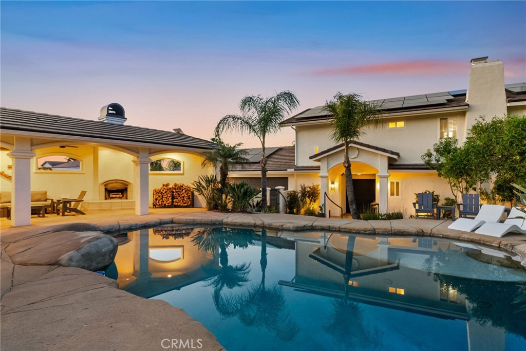 Welcome to 22883 Calcutta Drive, an exquisite retreat nestled on the prestigious golf course in the exclusive Canyon Lake community. This magnificent 3,800 sq. ft. residence, set on a rare double lot, effortlessly combines sophistication and comfort with its four expansive bedrooms and three and a half luxurious bathrooms. The heart of the home, a recently updated kitchen, is a chef’s dream with sleek quartz countertops, large island that seats six, high-end stainless steel appliances, ample storage with a walk in pantry, and an elegant wet bar featuring a wine fridge and ice maker. Designed for the ultimate in entertaining, this home boasts a seamless indoor-outdoor flow through pocket doors that open to a spectacular backyard paradise. Revel in the resort-like amenities, where a pristine pool takes center stage alongside an inviting cabana. Lavish guests with culinary delights from the state-of-the-art barbecue area, while evenings promise relaxation and entertainment on the patio, complete with a cozy fireplace and outdoor television for endless enjoyment. Guests will be in complete comfort in the stand alone casita with it's own private entrance. Modern conveniences, such as new Tesla solar panels, enhance the lifestyle experience, complemented by ample parking options including a garage, guest parking, and RV parking. Additional features include a soft water system, filtered water, new roof and access to all the amenities that Canyon Lake has to offer. This exceptional property offers an unparalleled opportunity for those seeking a vibrant lifestyle of luxury and leisure.
