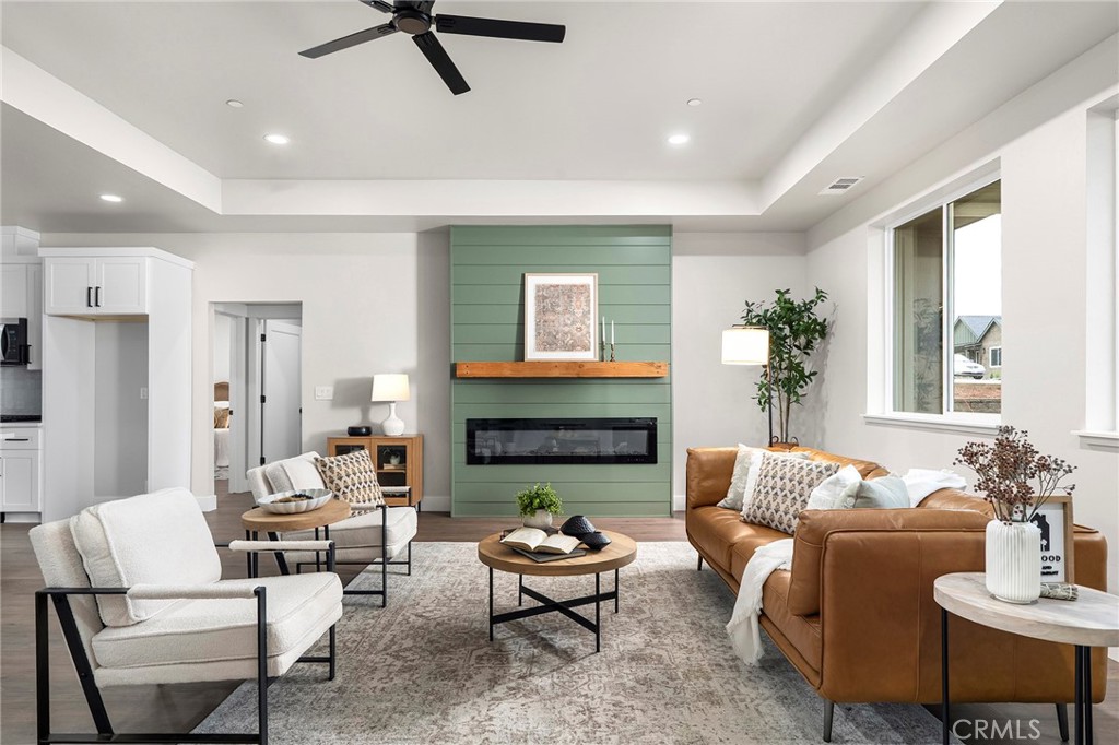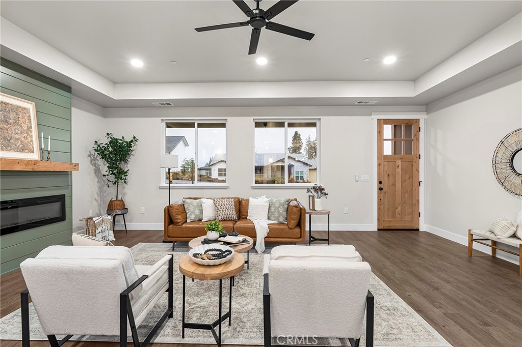 Modern design meets small-town charm here! This beautiful 3-bed, 2-bath home sits on one of Paradise’s most desirable, newly built streets—lined with gorgeous stick-built homes. Gone are the days of wondering what might be built next door; Madrone Way offers peace of mind and a true sense of community. If this home isn’t the one, come see what else is available on Madrone! Step inside and you’ll immediately be greeted by 9’ ceilings throughout, with 10’ tray ceilings in both the living room and the primary suite. The finishes set this home apart, with the green fireplace serving as an instant showstopper. The open-concept layout is perfect for entertaining, featuring a spacious kitchen with an L-shaped island and plenty of room for barstools—ideal for gatherings and everyday living. This split floor plan places two bedrooms, a full bath, and the laundry room on one side, while the primary suite enjoys its own private retreat on the other. The primary bathroom feels like a spa getaway, showcasing a striking wet room with a tile shower and soaking tub, all enclosed in glass for a sleek, modern touch. From the primary suite and back patio, enjoy beautiful sunsets that fill the sky each evening! Outside, you’ll love the fully fenced backyard, perfect for pets, play, and privacy. The location is unbeatable—tucked on the west side of town with a short drive to beloved Bille Park and easy access to Skyway, making it simple to reach anywhere in Paradise or beyond in minutes. Built by American Dream Construction, a trusted local builder known for quality and craftsmanship, this home includes an extra 6-months to the standard 12-month fit & finish warranty for added peace of mind. Plus, a brand-new, OWNED solar system (installed during escrow) for added efficiency and savings. For peace of mind, American Dream is one of the only builders in Paradise going above and beyond current wildfire safety standards. Each home is fully wildfire-prepared, featuring 5 feet of defensible space, Class A fire-rated roofing, ember-resistant Vulcan vents, and non-combustible gutter systems and downspouts—offering both beauty and resilience in one exceptional package. With great curb appeal, landscaping, fencing, a two-car garage, and thoughtful design throughout, 717 Madrone Way is a home you’ll love coming back to every day. Not to mention, SageSure quoted this property under $1900/yr - NO CA FAIR PLAN NEEDED!