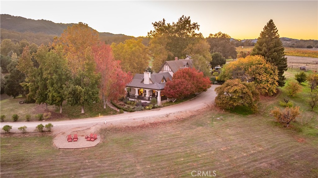 There is a place, tucked among the rolling hills of Paso Robles Wine Country, where time slows and the air carries the soft perfume of oak and vine. This magical estate, set on approx. 38.2 gently sweeping acres along coveted Vineyard Drive, is a haven of warmth, charm, and grace. The main residence, resting gracefully among the trees, radiates timeless character and sophistication. Inside, every detail has been thoughtfully crafted — three spacious bedrooms, three full baths, one three-quarter bath, and one half bath designed for comfort and ease. The kitchen is a gathering place, featuring a cozy breakfast nook with a Dutch door opening to the sunlit backyard and multiple seating areas. A formal dining room invites evenings of conversation, while the family room with a spectacular indoor/outdoor stone fireplace and multiple double doors spills onto a wraparound porch overlooking vineyards, oak groves, and rolling hills. Nearby, the Carriage House mirrors the Main Home’s craftsmanship. Upstairs offers open-concept living, balconies with stunning views, a kitchen, two bedrooms, and two bathrooms, while below provides an office, hobby room, and workshop. With a B&B License, the Carriage Home is both opportunity and invitation — to host, share, and live fully. Every window frames rolling hills, manicured gardens, and golden sunsets. On the porch, evenings pass beneath stars, the stillness broken only by crickets and a whispering breeze. In the heart of Paso Robles Wine Country, life takes on a slower, sweeter rhythm. Mornings bring the scent of lavender and distant quail; evenings, a glass of local wine and lantern glow. This is more than a home — it is a story of beauty, serenity, and timeless California spirit.