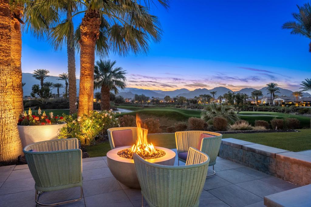 Welcome to a stunning residence in Andalusia Country Club, where exquisite upgrades and thoughtful craftsmanship create a refined yet inviting living experience. With breathtaking views of the Santa Rosa and Coral Mountains beautifully enhanced by the unique interiors crafted by Nicholas Lawrence Design, this home is a masterpiece of style and comfort. The entrance makes an impressive statement with feature walls forming a private courtyard, custom oak doors, and a calming stone water fountain. As you enter the main residence, the living room dazzles with an open fireplace framed by a striking marble surround and complemented by a bespoke art installation. Updated with a linear air system, recessed ceiling lights, and motorized blinds, the room perfectly balances elegance and functionality. For guests, the private casita offers a serene retreat with fireplace and kitchenette. The kitchen is both beautiful and practical, highlighted by a marble feature wall, and custom white oak shelving with integrated lighting. The primary suite is a tranquil haven, showcasing extensive white oak built-ins and a black marble fireplace adding a touch of opulence. The backyard is a true outdoor haven, designed for both relaxation and entertaining. A covered loggia with a cozy fireplace and tile flooring from the interior invites seamless indoor-outdoor living. Enjoy incredible views of the 14th green and 15th fairway of the Rees Jones designed course as you lounge by the expansive saltwater pool, complete with sunbathing decks for ultimate leisure. Evenings come alive around the fire pit, creating the perfect gathering with friends and family, while the built-in BBQ offers everything you need for alfresco dining. Come live the life you've always imagined!