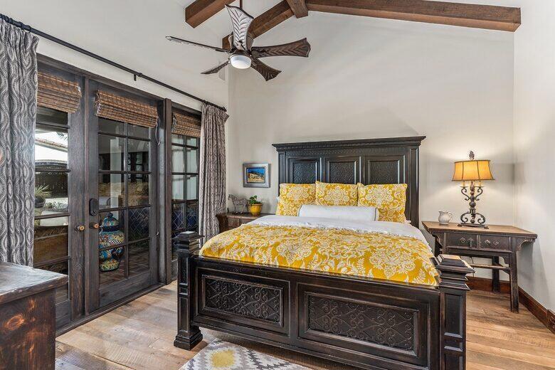 Experience lakeside luxury in this stunning custom Spanish Hacienda, nestled on a quiet swim cove with a private beach, covered boat dock, and Ski Nautique! This gated estate offers a 3BD/4BA main home plus a 1-2BD guest casita. Enjoy hand-carved mesquite doors, vintage timber-beamed ceilings, and authentic Spanish tile throughout. Entertain with two outdoor kitchens, an infinity-edge pool and spa with swim-up bar, fire pit, and tiled fountains under 30+ majestic date palms. The guest casita boasts over 2,000 sqft with breathtaking lake and mountain views, a master suite with coffee bar, fireplace, and full amenities. only 22 minutes from Palm Springs, 5 minutes to the FAMOUS Coachella Concert, and a mere 12 minutes to the Thermal Private Airport. Come and experience what everyone is talking about--visit this exceptional property, embrace the lifestyle it offers, and envision the lakefront living you've always dreamed of. Your oasis awaits, just a short drive from the excitement of Palm Springs and the renowned Coachella Concert. exceptional retreat for those seeking beauty, privacy, and resort-style living!