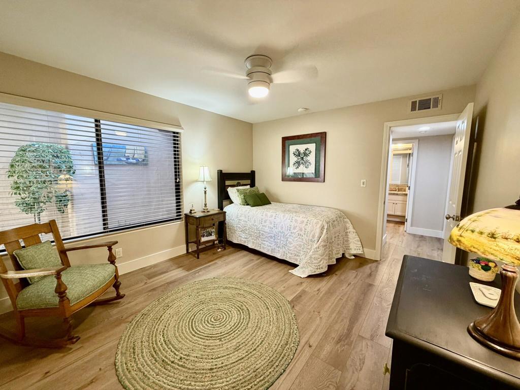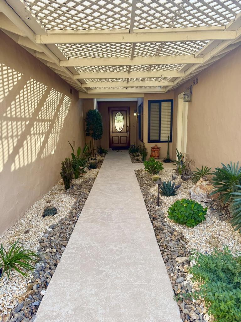 Beautifully Updated Home with South-Facing Mountain Views!Light, bright, and move-in ready! This upgraded home features vaulted ceilings, wide-plank flooring, and an open layout that captures stunning south-facing mountain and fairway views through expansive sliders. The remodeled kitchen offers stainless steel appliances, stone countertops, and ample cabinet space. Spacious primary suite with dual skylights. Second bedroom includes a trundle bed--perfect for guests. Additional living/den area provides flexible use of space. Stylish furnishings, modern lighting, and clean, well-maintained interiors throughout. Enjoy seamless indoor-outdoor living and breathtaking desert scenery!