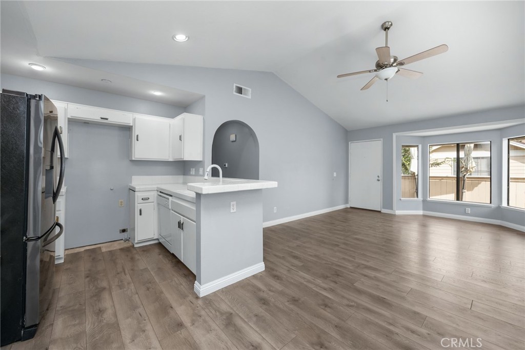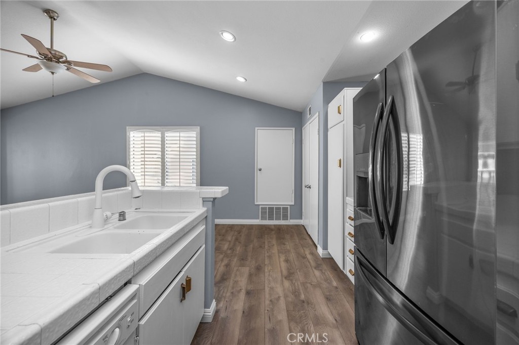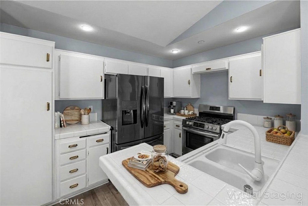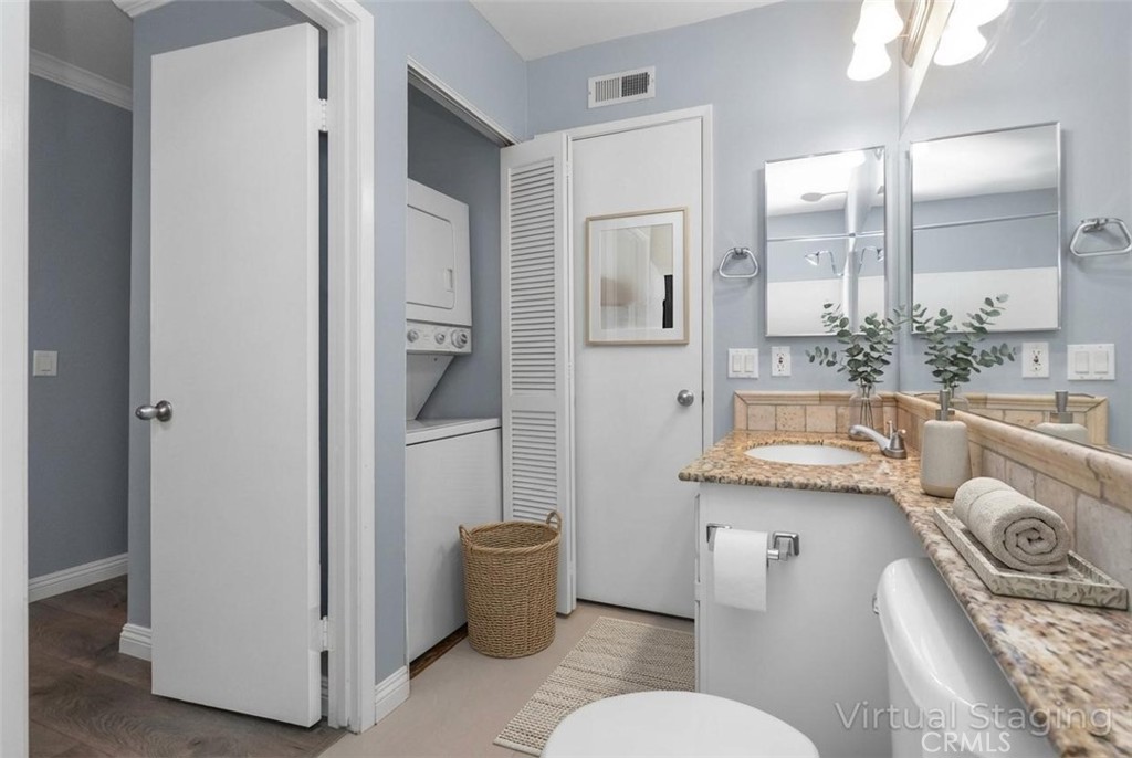 A charming 2 bedroom 1 bath condominium located in Stanton inside the gated community of Crosspoint Village. The condo is located further in from the Boulevard and streets and offers a much quieter location. The condo is has vaulted ceilings, laminate flooring and recently painted inside. This a great quiet and peaceful community with HOA amenities including several pools, spa, hot tubs and a green belt and lots of trees around the community. The home is on the second floor with a large master bedroom with a walk in closet and a large vanity next to the bathroom. There is a large landing at the entrance of the home.