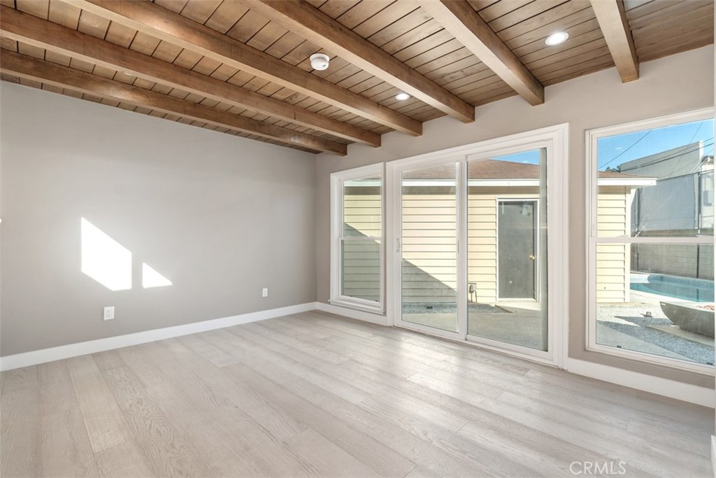 Turnkey Gem! Single Story 3 Bedroom, 3 Bath, pool home located on a quiet corner lot with complete remodel from roof to flooring! All new electrical, Pex piping, new roof, new flooring, new baths, new kitchen and newly plastered pool. Enter into an open concept living/family area complete with in-wall electric fireplace, eating area and entertainers kitchen with a 9 foot quartz counter peninsula. The kitchen also has new cabinets, new high end Frigidaire stainless steel appliances, pot filler at the stove, steel sink, disposal, and reverse osmosis water system. All 3 bathrooms have new vanities, fixtures, toilets, tiled showers/bath and LED lit mirrors. New paint and tile/vinyl plank flooring throughout. New quiet AC/heat pump system with attic condenser, new ducting, attic electric fan with thermostat. Fully upgraded electrical system with new electrical panel, 220V outlets (garage EV charger + stove) and new electrical outlets and switches. Enjoy time in the backyard with 9ft deep pool complete with new heater, filters, and gas fire pit for those cool evenings. Security system includes exterior cameras, window and door alarms around pool access, doorbell camera. Exterior upgrades include a new 30 year roof, new sprinkler system, exterior lighting, spanish style tile porch, and new front door. Conveniently located near CSLB, shopping and entertainment, and nearby freeway access. So many features that you have to see to believe!
