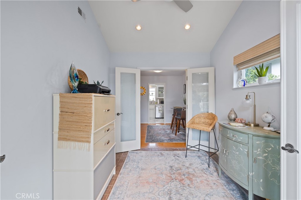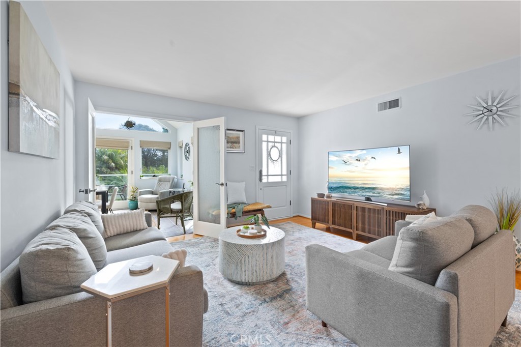Settle into this bright and beautifully maintained single-level home in highly coveted Southwest San Clemente, an area celebrated not only for its premier beachside lifestyle and close proximity to local beaches, but also for its active community and culture. Featuring two bedrooms, two bathrooms, and a versatile den that functions perfectly as an office or private retreat, the layout adapts effortlessly to your needs. Natural light fills the home, especially in the main living area enhanced by souring ceilings, elevated windows, and access to a sunny front balcony. A second living space provides additional room to unwind or entertain. The kitchen offers a clean, coastal aesthetic, complete with quartz countertops, custom cabinetry, tile flooring, and stainless steel appliances. Situated on a street-to-alley lot, the property delivers true single-level living with direct, no-stairs access from the alley into the back patio and straight into the home. The rear patio, equipped with retractable awnings, creates a comfortable outdoor area for relaxing afternoons or casual evening gatherings. Additional highlights involute central heating, dual-pane windows, ceiling fans, an interior laundry area, and a two- car garage with epoxy flooring and built-in storage. The generous front deck extends your living space outdoors, ideal for outdoor dining or taking in the coastal breeze. Just minutes from downtown San Clemente, the pier, beach trails, world-class surf-breaks, Dana Point Harbor, and a variety of local restaurants and shops, this home embodies relaxed yet refined Southern California costal living.