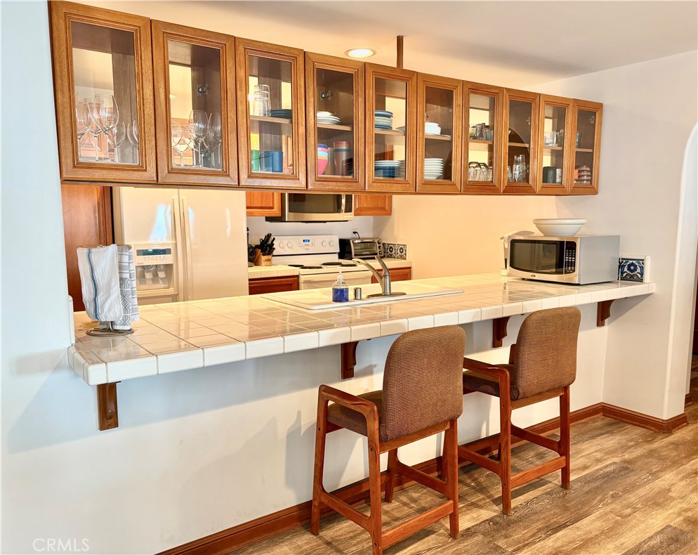 Stunning two-level Hamilton Cove Villa with an ocean view from every room! This 2BR/2BA villa offers approximately 1,660 sq. ft. of well-designed living space within the desirable Hamilton Cove gated community. The main level features a spacious entry with a storage closet, leading to a fully equipped kitchen with original tile, mahogany cabinetry, and a bar-height breakfast counter. A designated dining area with built-in cabinetry sits just off the kitchen. The living room has abundant natural light through wood-trim windows and double French doors that open to a private balcony offering an unparalleled view of both the ocean and the cove. Additionally, the living room has a queen sleeper sofa and plenty of room for relaxing and entertaining. A pocket door provides privacy for the main-level bedroom, or can be opened for a flowing abmiance. This bedroom includes 2 mirrored closets and French doors to the balcony. The main-level has a three-quarter bath with tiled counters, an adjacent laundry closet has washer, dryer and storage for convenience. A staircase from the entry leads to the lower-level primary suite, with French doors to private balcony, and additional private access to/from the property. The spacious "spa like" bathroom features a double vanity, soaking tub, and a separate shower and water closet. The villa is tastefully furnished and includes a Yamaha golf cart. Hamilton Cove amenities include a heated pool and spa, fitness center, 18-hole putting course, croquet court, sand volleyball court, pier, dock, some moorings and a beach area with built-in BBQs and picnic tables. HOA dues apply.