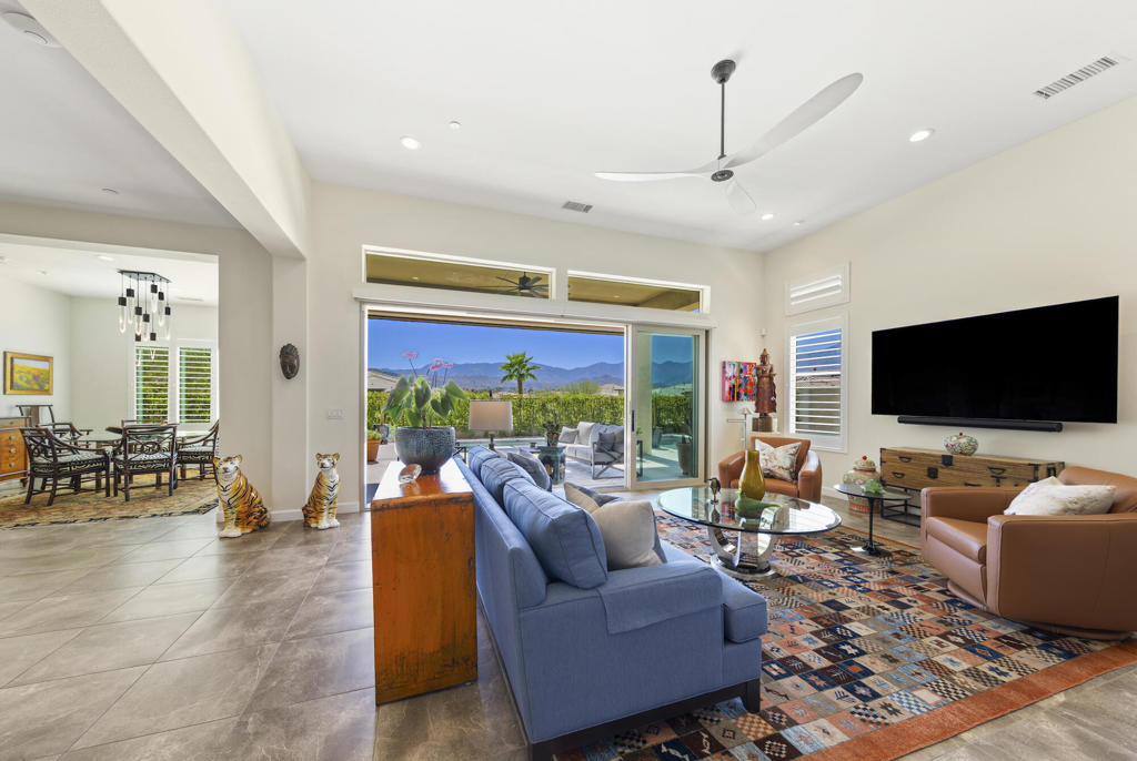 Desert Resort Living! Welcome to this stunning SERENITY model with OWNED SOLAR and situated on an elevated corner lot to capture panoramic MOUNTAIN VIEWS. Featuring high ceilings and walls of glass, the home exudes luxury the minute you step into the rotunda foyer from the courtyard. The open floor plan centers on a sleek kitchen with KitchenAid appliances, granite countertops and an expansive island that flows into the living area with a MULTI PANEL SLIDING DOOR SYSTEM opening to a resort style backyard for true indoor/outdoor living. Enjoy the sparkling PebbleTec pool and spa plus side patio with pergola for BBQ and al fresco dining. Two private ensuites are well separated for privacy and the luxurious primary suite with spa like bath and custom walk-in closet opens to the pool and fabulous mountain views. The office/den with french doors and custom built-ins can also be used for a third sleeping space. Conveniences include a wine fridge, laundry room with sink and the garage features a built-in workshop, lots of storage, a water softener, tankless water heater plus its own A/C unit and insulated garage walls/ceiling. With all the finest finishes and details, this home has been meticulously maintained and is ready for you to enjoy. Del Webb Rancho Mirage is the premier 55+ community with walking trails, incredible views and so convenient to upscale shopping and dining. Residents enjoy a low HOA fee that includes cable and internet, Clubhouse, pools, tennis courts, pickleball, putting green, fitness center and endless activities. Call today to schedule your private showing and see the best view at Del Webb.