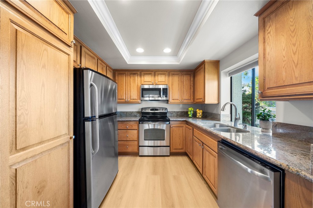 NICELY UPDATED • NO STEPS! A rare opportunity to own a well-maintained, move-in-ready, ground-floor condo. This inviting home features a generous living space with an open layout, new flooring, and fresh paint throughout the living area, kitchen, and bedroom, offering comfortable daily living and easy accessibility—all on one level. The updated kitchen showcases recessed lighting, granite countertops, stainless steel appliances, and a new microwave—perfect for effortless living. Relax on your private patio, a welcoming outdoor extension of your home. Ample parking plus a one-car garage with extra storage, just steps from your front door. Enjoy a turnkey lifestyle in the highly sought-after La Mirada Landmark 55+ guard-gated community with 24/7 security patrols. Set amidst lush, landscaped green acres, the community offers a socially active clubhouse, pool, spa, tennis courts, BBQ and picnic areas, workshops, fitness center, scenic walking trails, and endless opportunities to make new friends. Golf lovers will appreciate the nearby La Mirada Golf Course, and Westridge Plaza provides easy access to dining and shopping. In a prime location close to everything, this home perfectly combines convenience with low-maintenance living. Experience bright Southern California living, where every day feels like a vacation. Schedule your showing today and discover the lifestyle this home has to offer. A 3D tour is available here: https://my.matterport.com/show/?m=kAxKj7mVDUN
