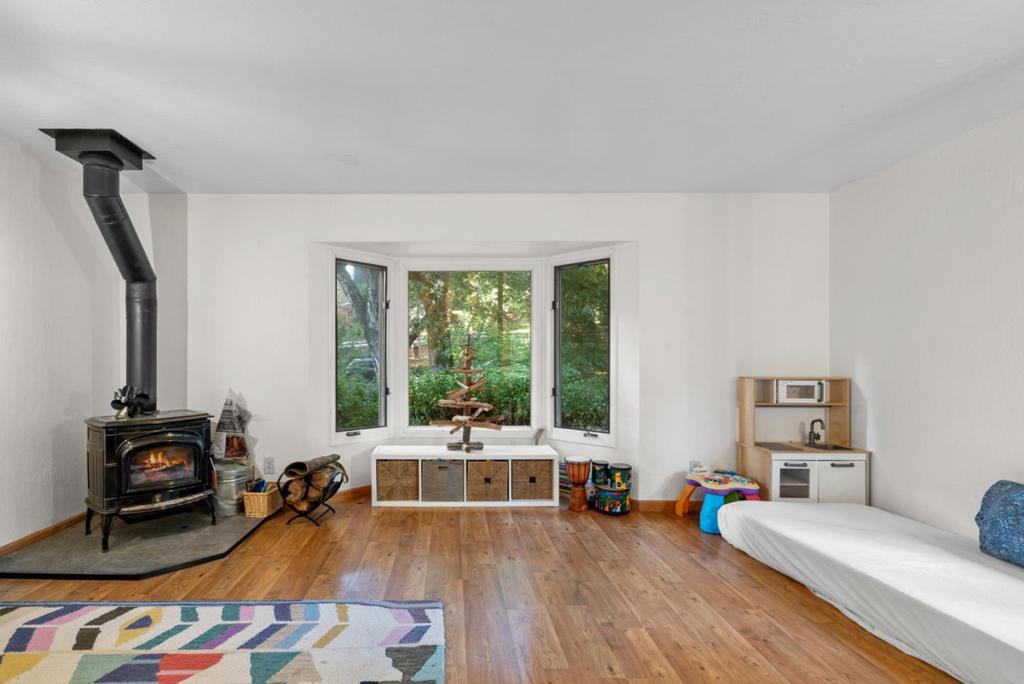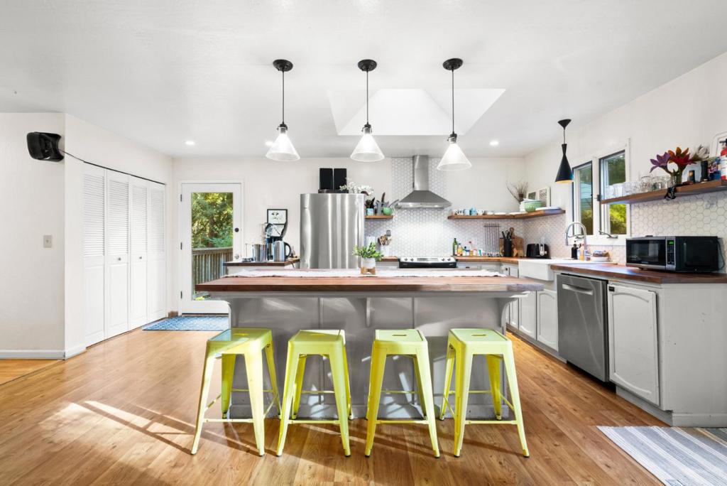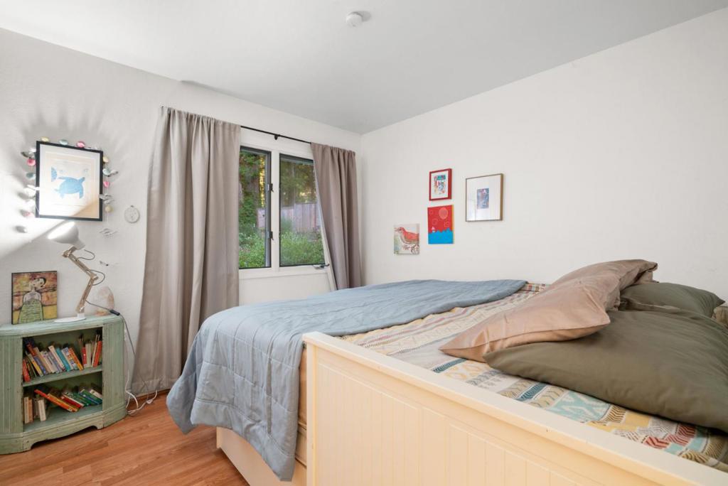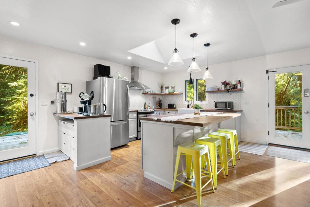 Welcome to this charming 2 BR, 2 BA single level home nestled in serene Bonny Doon. Spanning 1,329 ft, this delightful residence offers a cozy living experience set on a spacious 1.43 acre lot. The kitchen is a haven w/ butcher block counters, an island, & electric appliances including an oven range & cooktop. The family room and dining area seamlessly integrate with the kitchen, creating a warm and inviting space perfect for gatherings. Extensive wrap around decking allows for a delightful blend of outdoor living, grilling, soaking in the wood fired hot tub or strolling down to year round Mill Creek. North coast beaches are a short drive away! The home boasts a variety of flooring options such as laminate, carpet, and vinyl/linoleum, catering to diverse style preferences. A wood stove and electric heating ensure comfort during cooler months, while double pane windows enhance energy efficiency. Additional amenities include a walk-in closet and convenient inside laundry with a washer and dryer. The property includes miscellaneous structures such as a shed and workshop, offering ample storage and creative space. Located within the Bonny Doon Union Elementary School District, this home presents a wonderful opportunity for those seeking a peaceful retreat with abundant amenities.