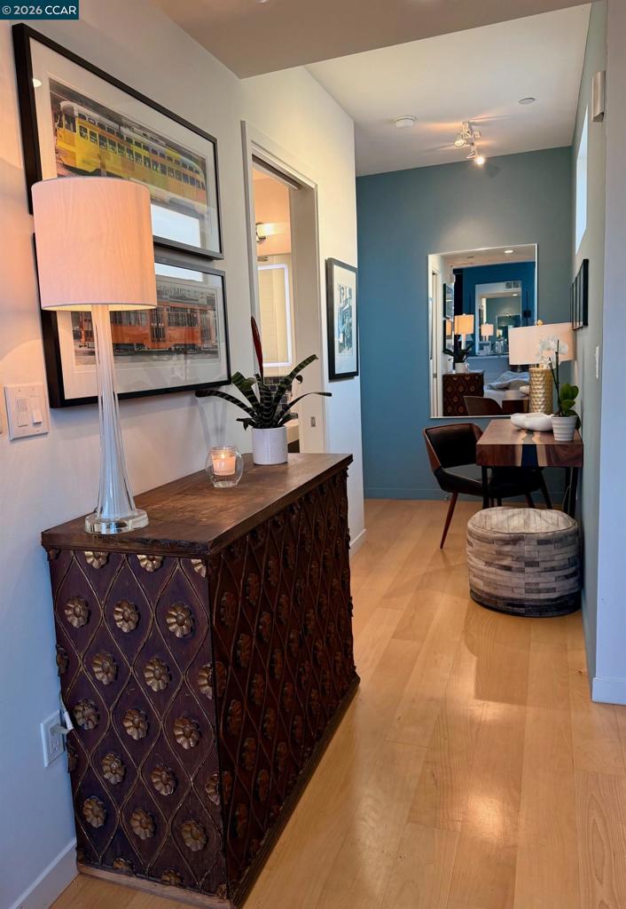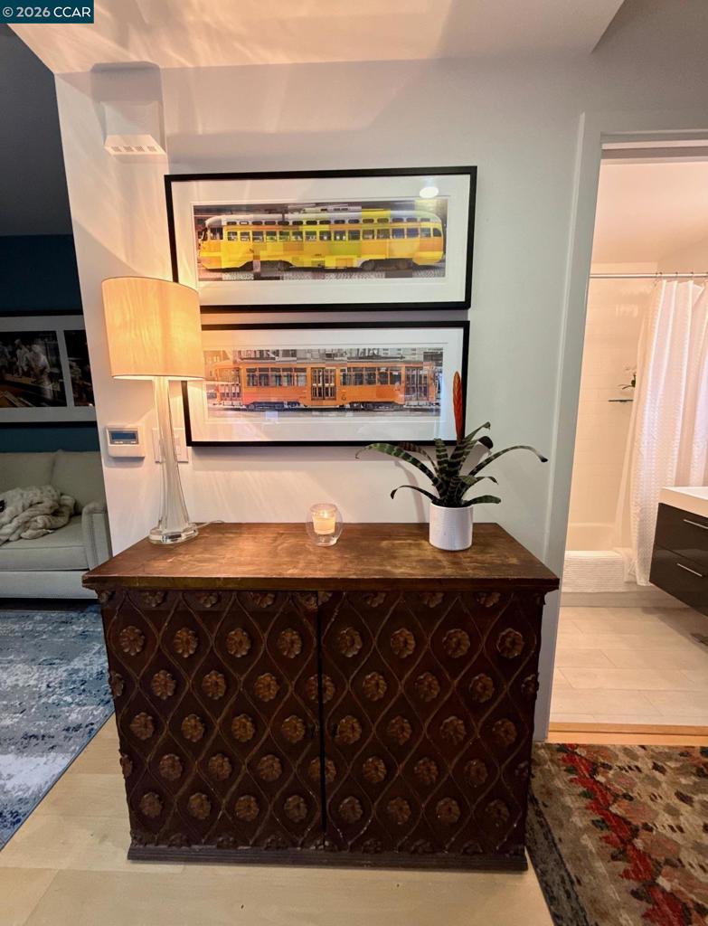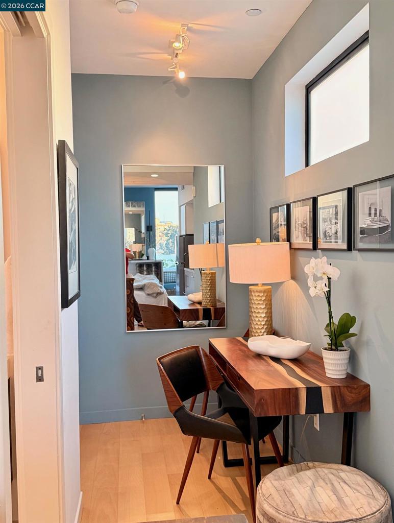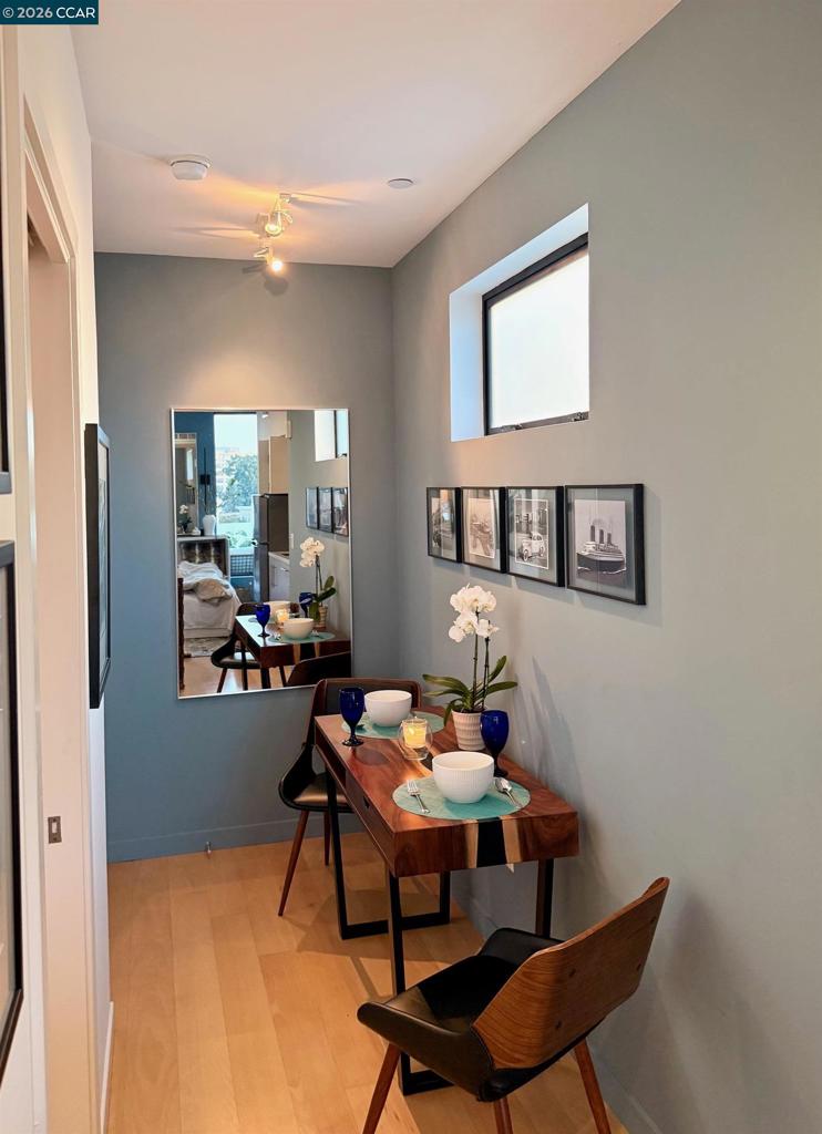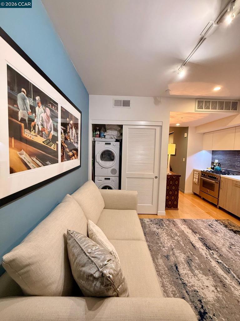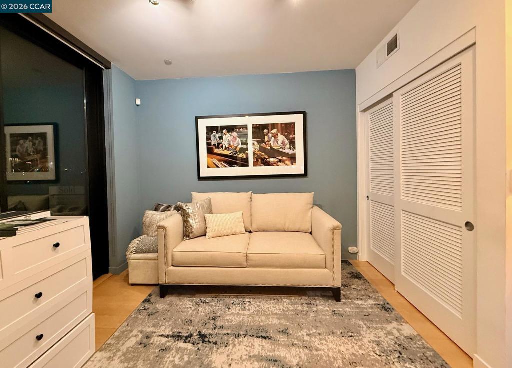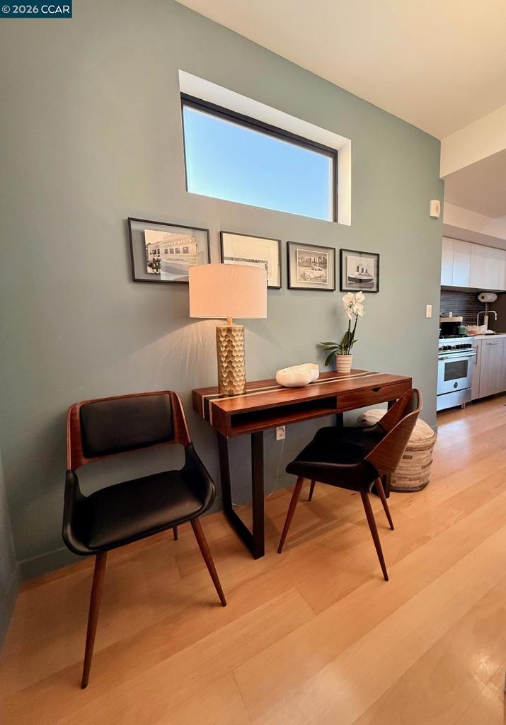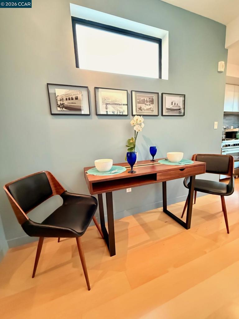 Enjoy sweeping Downtown, Bay, and Twin Peaks views from a VERY RARE private balcony (only 2 units in the building have their own terrace) for dining, drinks, game playing or simply just to relax. Fabulous modern top-floor studio at the "Fifteen Fifteen", designed by renowned architect Stanley Saitowitz. This stylish light-filled end unit features 9’ ceilings, wide-plank hardwood floors, Bosch/Thermador appliances, Caesarstone countertops, SOZO Studio cabinetry, and a spa-like bath with Grohe fixtures and Italian porcelain flooring. Additional highlights include central A/C, in-unit laundry, a large storage unit, and a secure, professionally managed building. Built in 2014. Prime Mission District location close to restaurants, cafés, shops, galleries, transit, and easy freeway access. Available fully furnished as shown including full kitchen set up, smart TV and dvd player, washer dryer, bed and bath. Views: Downtown