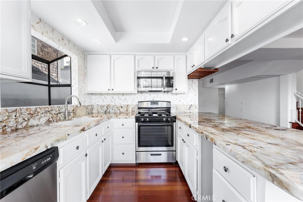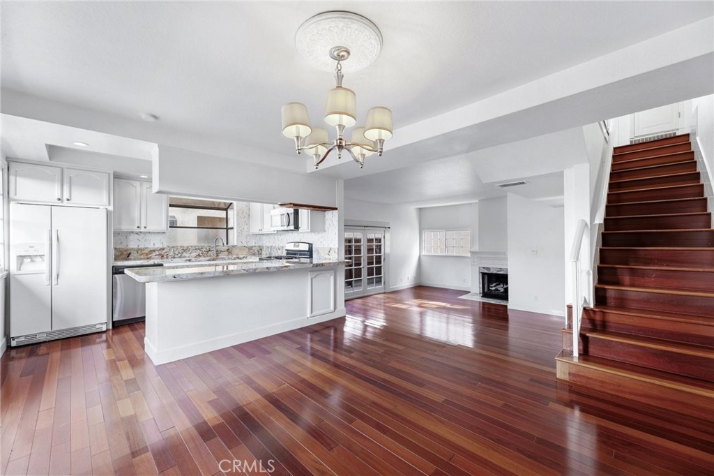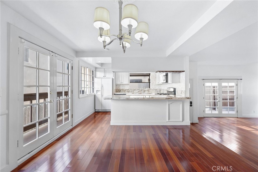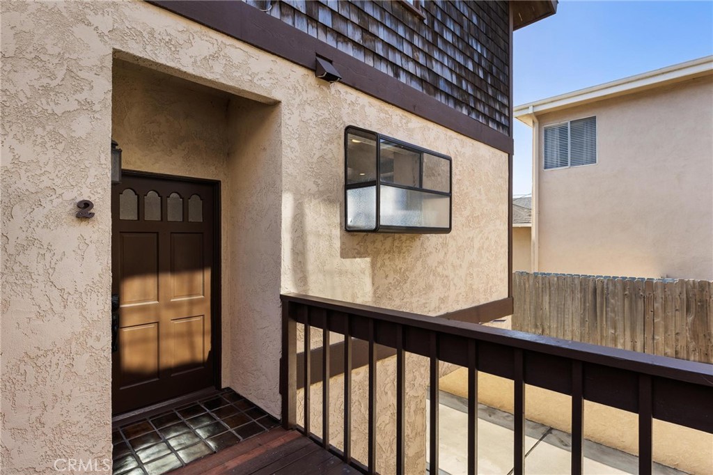 Quietly situated as a rear-unit townhome, 1515 Artesia Blvd Unit #2 is a charming retreat. Upon entry, the home is bathed in natural light and features hardwood floors throughout. The living room includes a fireplace and French doors that open to a private outdoor patio, creating indoor-outdoor flow. Just two steps up, the dining area features a second set of French doors leading to a private terrace and connecting to the adjacent kitchen, which offers ample storage and breakfast bar seating. A powder room and direct access to the two-car garage complete the main level. Upstairs, both bedrooms feature en-suite bathrooms. The primary suite offers vaulted ceilings, a private outdoor terrace, generous natural light, a large walk-in closet, and an en-suite bathroom with a glass-enclosed shower. The secondary bedroom features high ceilings, an en-suite bathroom, and ample storage. An upstairs laundry room with built-in storage and a skylight providing additional natural light completes the upper level. With easy access to downtown Manhattan Beach shops and dining, as well as LAX and major freeways just minutes away, 1515 Artesia Blvd Unit #2 presents convenience, charm, and everyday livability.