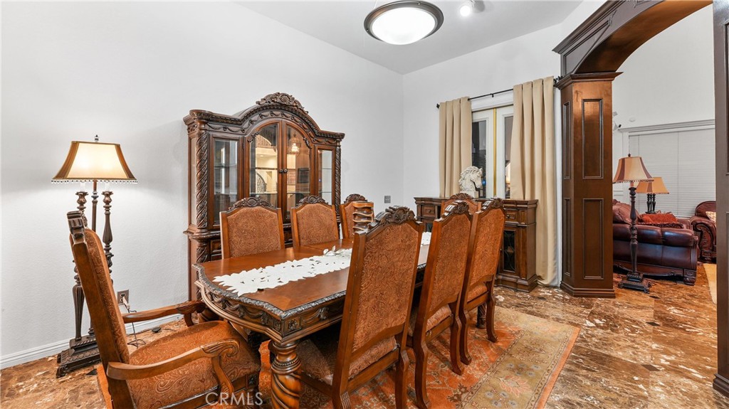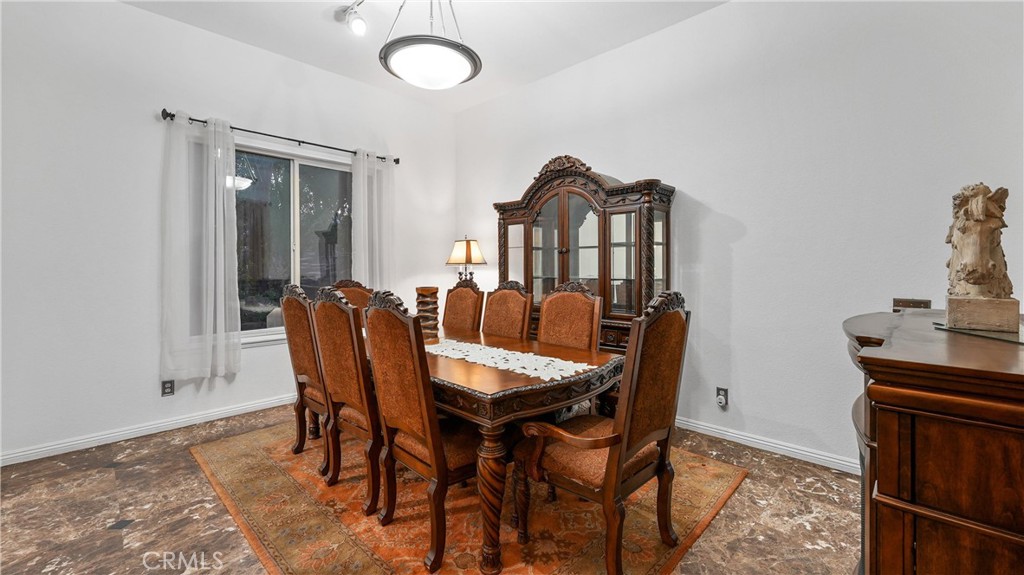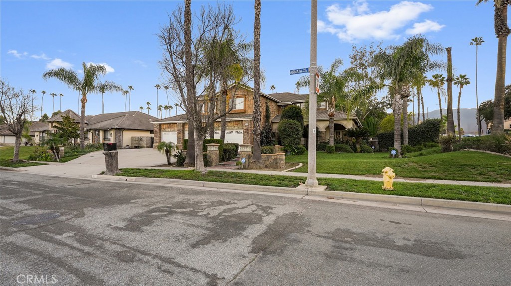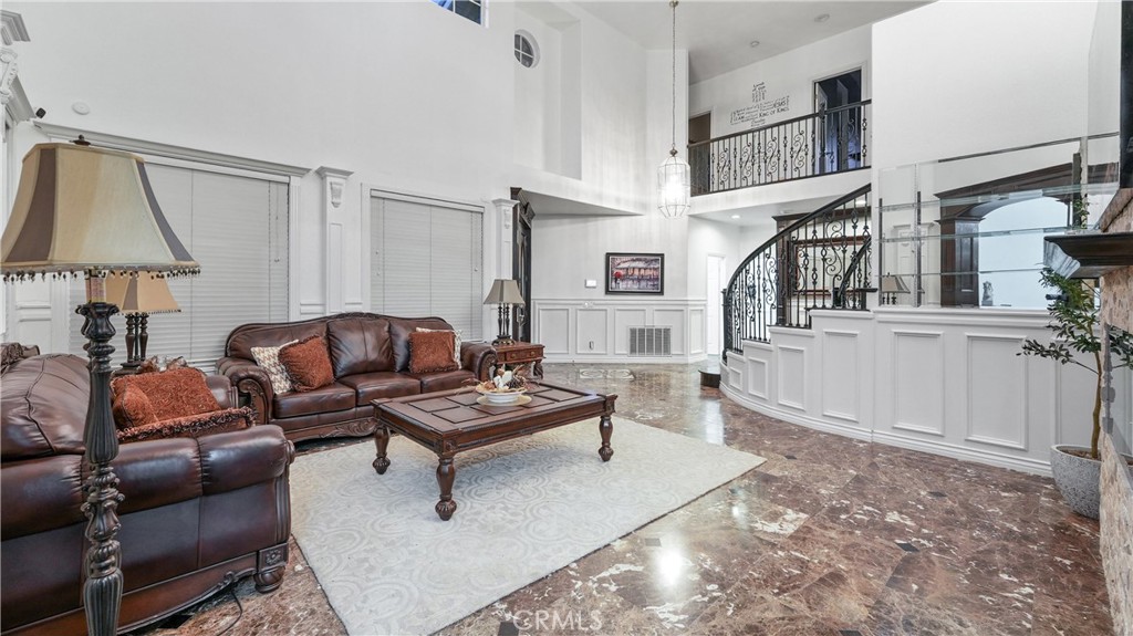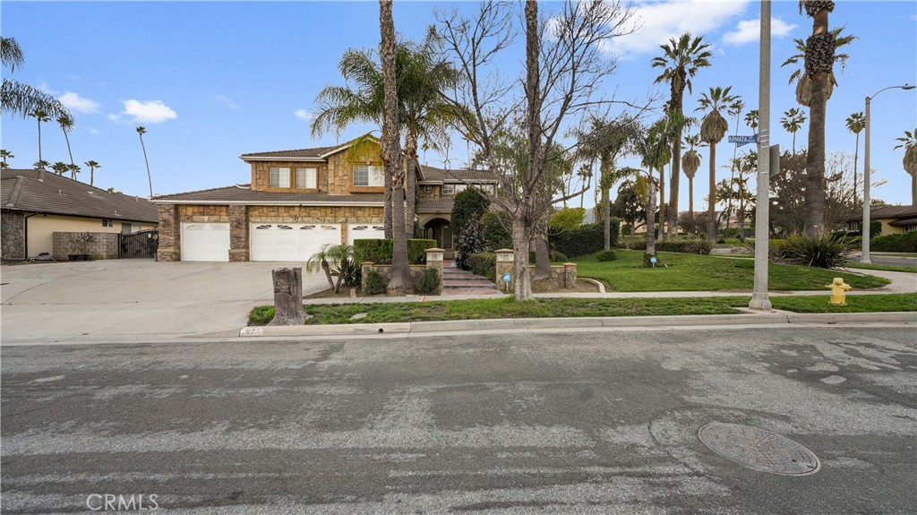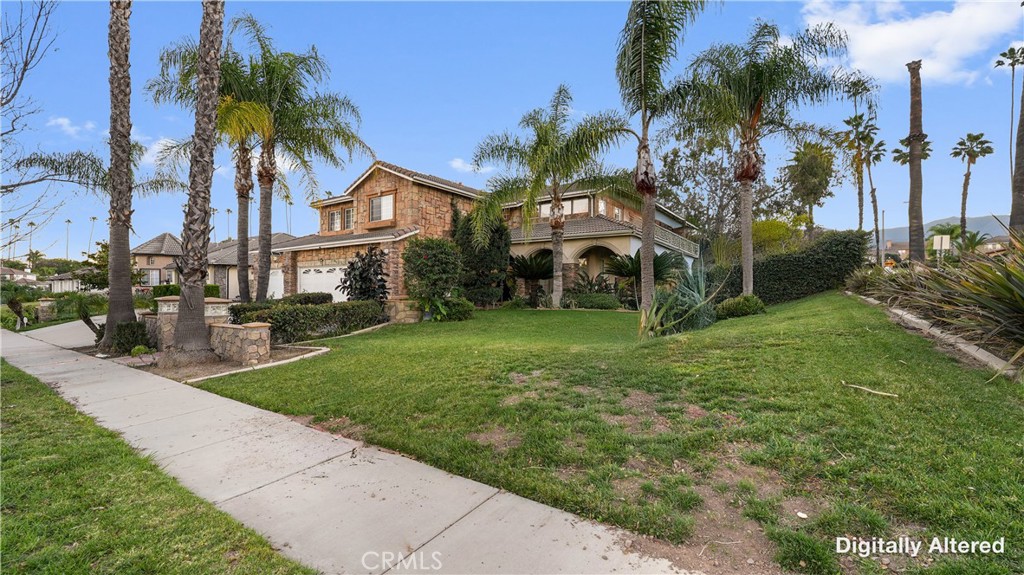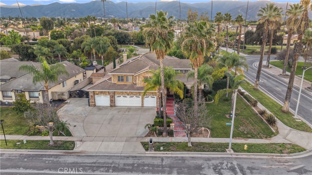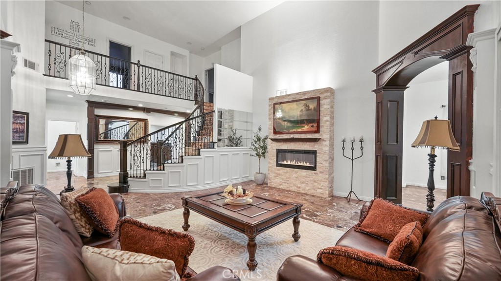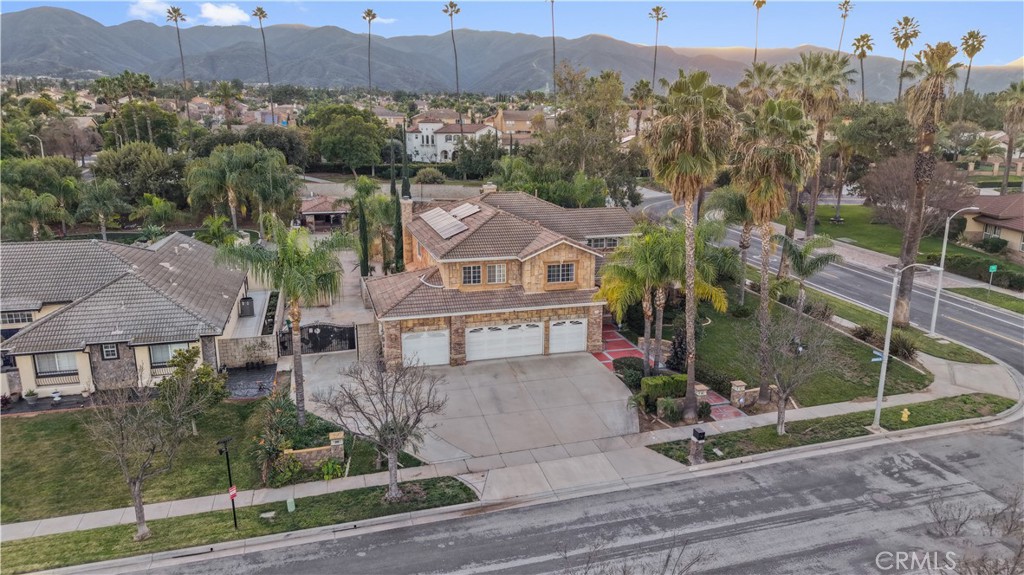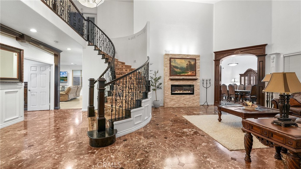 Welcome to this exceptional luxury estate in prestigious South Corona, where timeless elegance and resort-style living come together. Marble flooring spans the main level, and a custom iron staircase creates a grand first impression. A formal living room with fireplace opens to the formal dining room, both designed for elegant entertaining. A versatile main-floor flex room offers ideal space for a guest bedroom, office, or playroom. The fully renovated kitchen (2021) is the heart of the home, featuring a large center island, built-in refrigerator, custom cabinetry, walk-in pantry, and additional storage beneath the stairs. The kitchen opens to an expansive family room with a second fireplace, creating a warm and inviting setting for everyday living. An enclosed sunroom further expands the living space, offering year-round flexibility. Upstairs, the primary suite is a private retreat with its own fireplace, balcony, dual walk-in closets, and a spa-inspired bath with Jacuzzi tub, separate vanities, and custom crown molding. Three additional bedrooms include attached bathrooms, two with walk-in closets and one ideal as a secondary upstairs primary suite. Step outside to a true resort-style backyard. The heated pool features a waterfall, slide, grotto, and attached spa. A built-in outdoor kitchen with barbecue, covered patios, gas firepit, and full outdoor bathroom create seamless indoor-outdoor entertaining. The lighted sport court accommodates basketball and tennis, enhanced by newer LED lighting. Mature fruit trees including guava, pomegranate, lemon, and lime add charm to the landscape. Significant upgrades include 23 fully paid solar panels valued at approximately $65,000, helping reduce long-term utility costs, along with newer pool equipment. Additional highlights include a four-car garage with two storage or flex rooms, ample RV and boat parking, and a water softener system. Ideally located near top-rated schools, premier shopping, dining, and convenient freeway access, this home delivers luxury, functionality, and energy efficiency in one of South Corona’s most desirable neighborhoods.