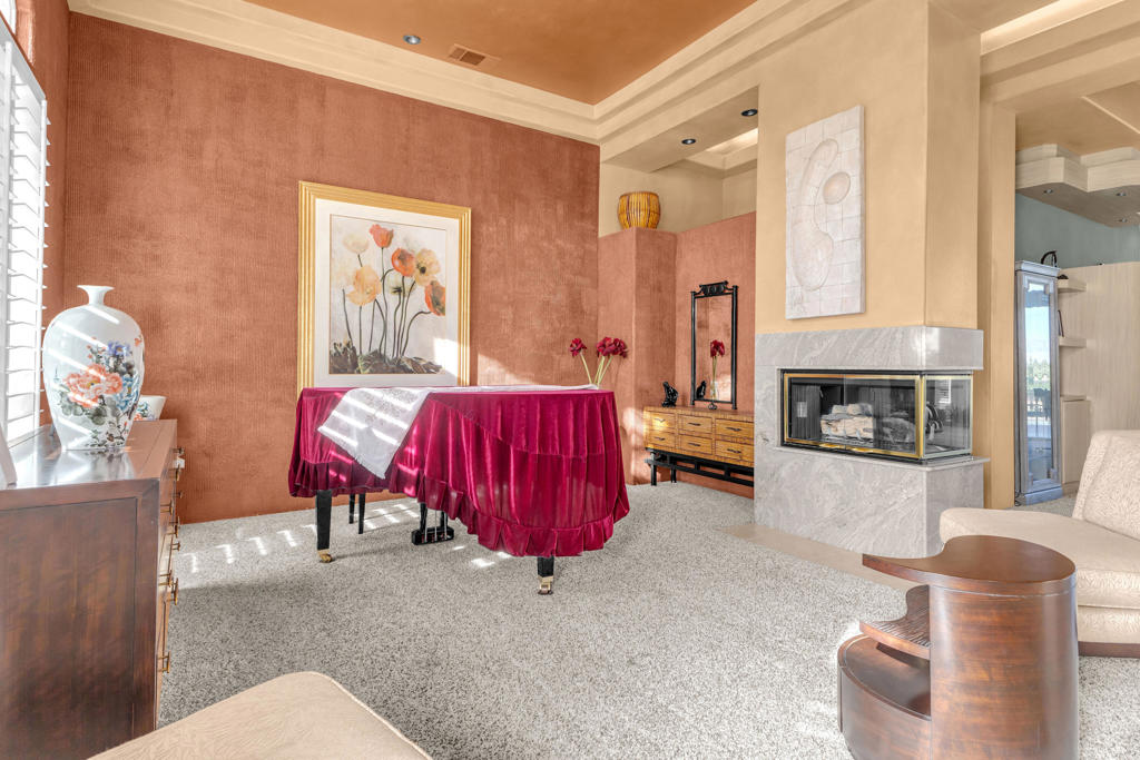 This home sits on an elevated lot with direct golf course access via private steps and offers sweeping views of the fairways. From the moment you enter, the thoughtful layout and tranquil orientation make this home feel like a private retreat.The floor plan features three bedrooms and four bathrooms, with each bedroom offering its own en suite bath, a rare and highly desirable feature. The spacious primary suite is privately located on one side of the home, while the two guest bedrooms are on the opposite wing, offering both comfort and privacy. A separate guest bathroom adds extra convenience.Upon entry, you're greeted by high ceilings, a formal dining room to your right, and a formal living room to your left. All designed to draw your eye toward the backyard, saltwater pool, and golf course beyond. The kitchen includes double ovens, ample counter space, a built-in refrigerator plus a bonus pull-out fridge, ideal for entertaining.Additional features include a newer HVAC system (installed less than 2 years ago), a built-in surround sound, windows for improved energy efficiency, which the seller says has helped reduce electricity costs by up to 30%, and beautiful flow throughout the home.This property offers more than just functionality. It radiates balance, privacy, and energy that make it feel like a true personal resort. Schedule a private showing and experience it for yourself.