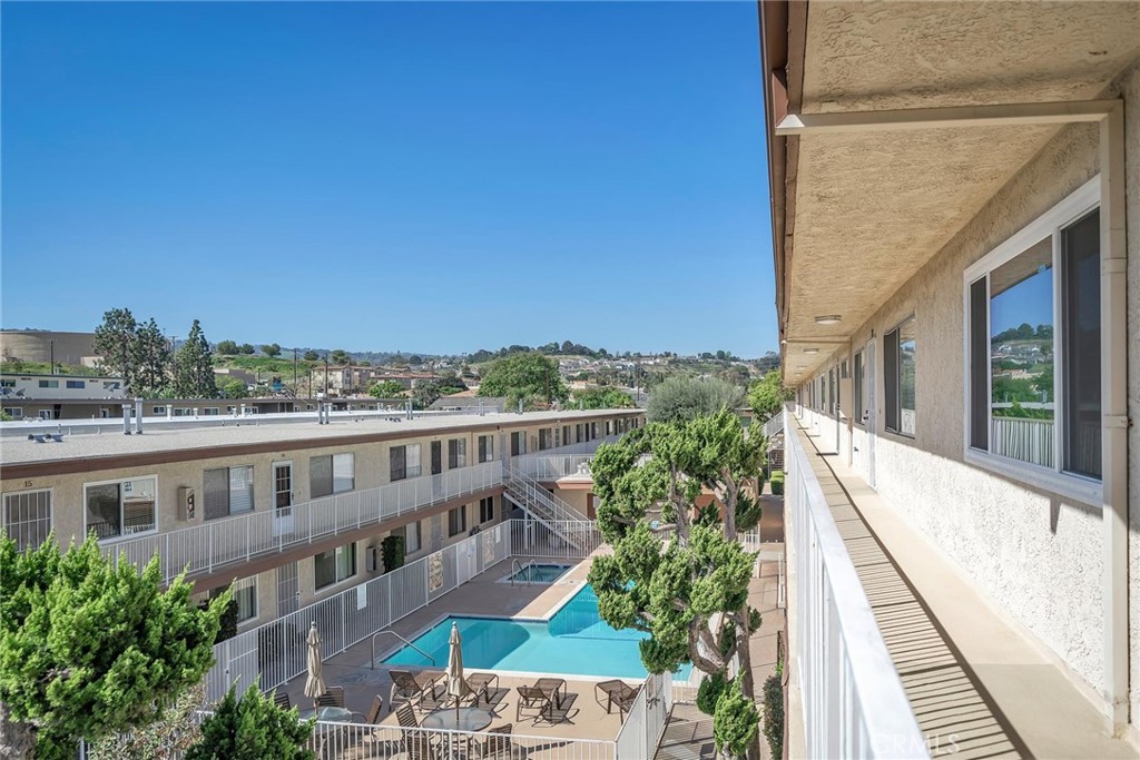 Bright and Open Top-Floor End Unit. This beautifully updated top-floor end unit offers exceptional natural light, thanks to windows on three sides and upgraded double-pane vinyl throughout. The remodeled kitchen adds a fresh, modern touch, making the main living space feel warm, open, and inviting. Enjoy sweeping views of the Palos Verdes hills from one side and mountain vistas from the other—an ideal backdrop for relaxing mornings or peaceful evenings at home. Both bedrooms are generously sized and feature good-sized closets. The unit includes two parking spaces, one equipped with storage lockers perfect for Costco runs, holiday décor, and everyday extras. HOA dues conveniently cover water, trash, gas, and basic cable. The building is meticulously maintained and offers a large pool and a clean, spacious laundry room. Even better, the complex is **FHA approved**, opening the door to more financing options for buyers.
