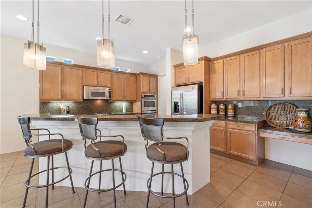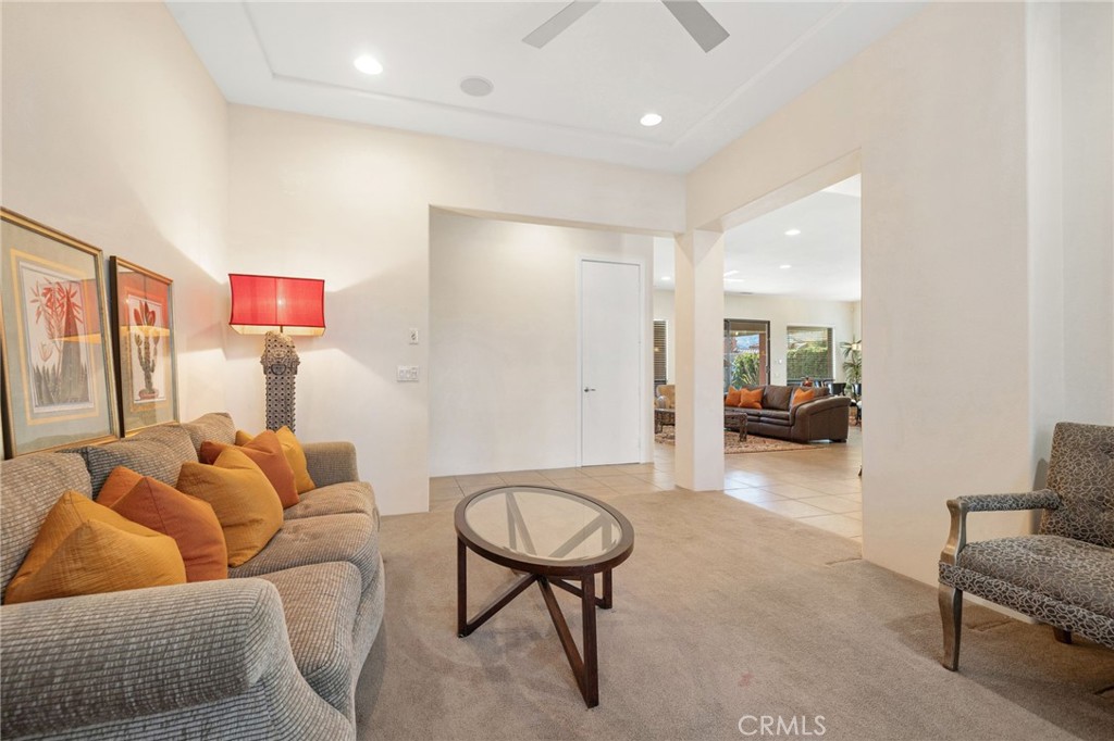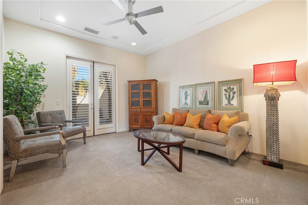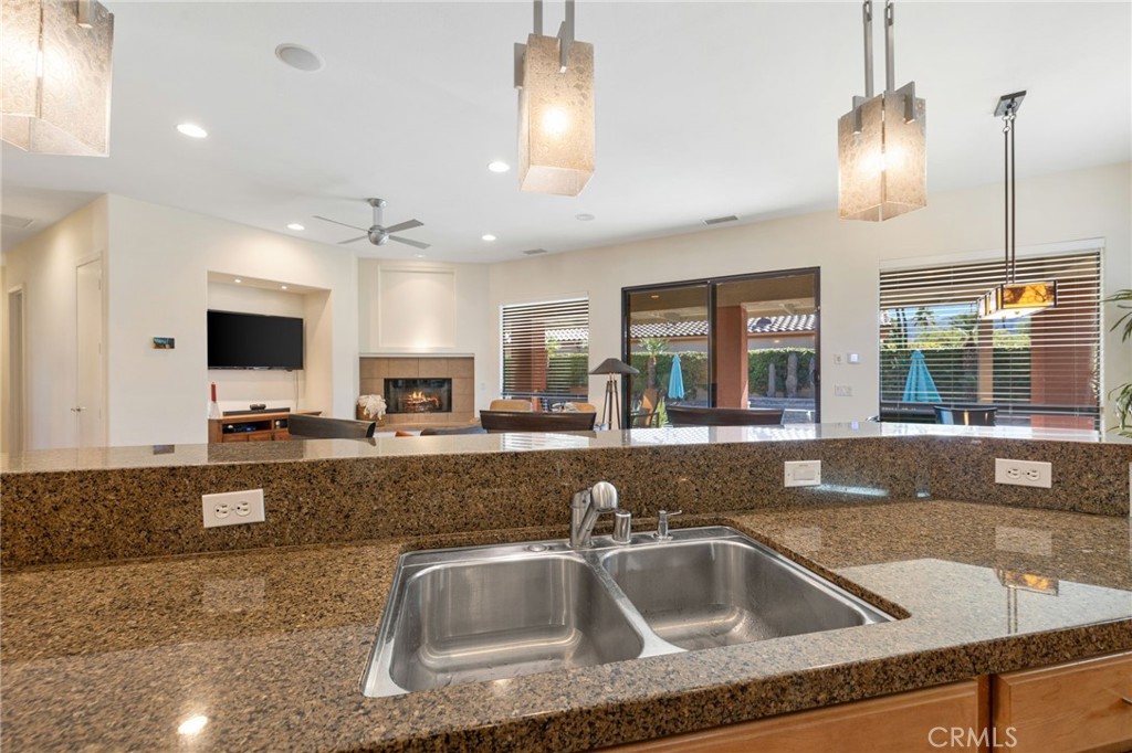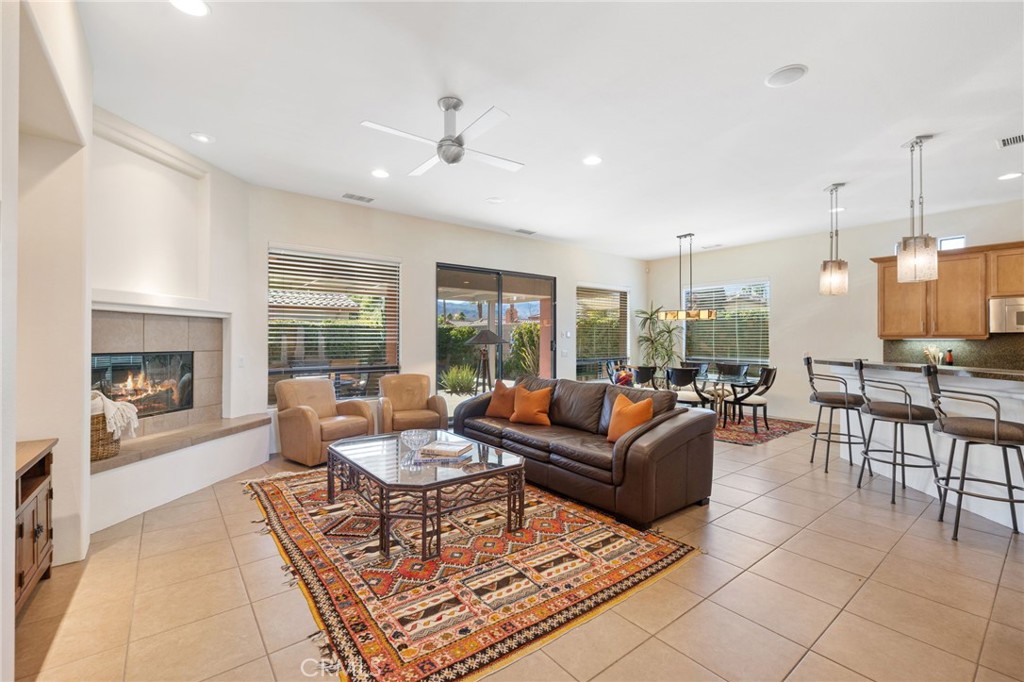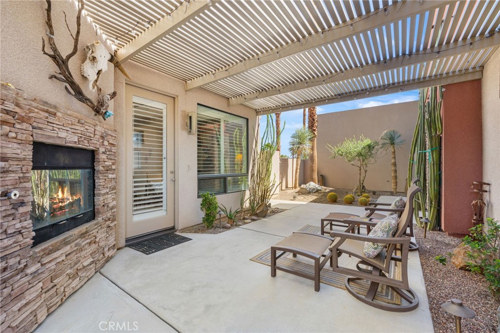 This upgraded contemporary home sits on an oversized interior corner lot and delivers the privacy, openness, and indoor/outdoor flow today’s buyers want. The main home offers 3 bedrooms, 3.5 baths, and a versatile den/office/flex room, plus a detached guest casita—perfect for visiting family, guests, or a private retreat. Entertain with ease in the open kitchen featuring slab granite countertops, dual ovens, and a large breakfast bar that opens to the great room and covered patio. The backyard is a professionally landscaped desert oasis with a saltwater pool and spa, fire pit, mountain views, mature citrus and fig trees, dramatic palms/cacti, and landscape lighting that transforms the space at night. Two fireplaces—including a courtyard fireplace by the casita and a poolside large fire pit add warmth and ambiance throughout. Enjoy modern comfort and efficiency with a whole-home speaker system, dual Lennox HVAC systems, and an assumable Vivint solar lease for lower monthly utility costs. HOA is just $340/month and includes a complimentary Social & Fitness Membership to Mission Hills Country Club. Minutes to golf, dining, and Palm Springs—luxury, comfort, and lifestyle all in one.