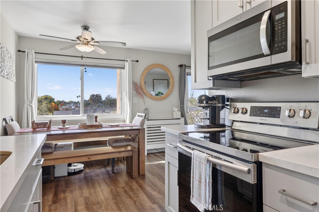 Welcome to this beach-inspired, top-floor corner condo located within the highly regarded Los Alamitos School District, just minutes from the coast. Set close to premier shopping and dining, this light-filled residence offers an ideal blend of privacy, comfort, and convenience, with refreshing ocean breezes and elevated city views. Inside, luxury vinyl plank flooring runs throughout the open living space, complementing a beautifully remodeled kitchen with gray cabinetry, quartz countertops, and stainless steel appliances. The dining and living area opens to a covered private balcony—perfect for morning coffee or unwinding while enjoying vibrant sunset skies. The spacious bedroom easily accommodates a king-size bed and includes custom closet organizers, while the spa-inspired bathroom features elegant tile and quartz finishes. Additional highlights include air conditioning, central heating, dual-pane windows with honeycomb shades, and updated lighting throughout. The community offers elevator access with a dedicated mail and package room, two pools, a spa and hot tub, a fully equipped fitness center, clubhouse, and community barbecues. Additional conveniences include a laundry room located on the same floor, one assigned parking space with a private storage box, and a car wash station. HOA dues cover water, trash, and landscaping