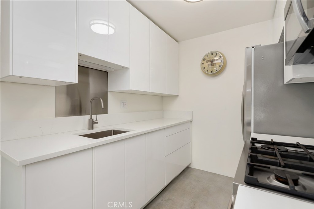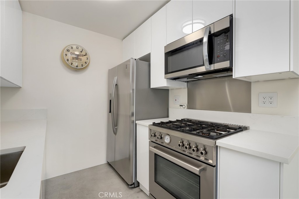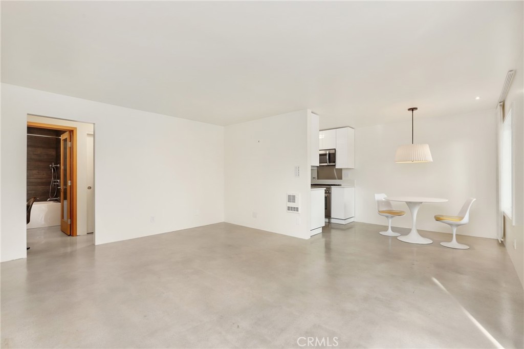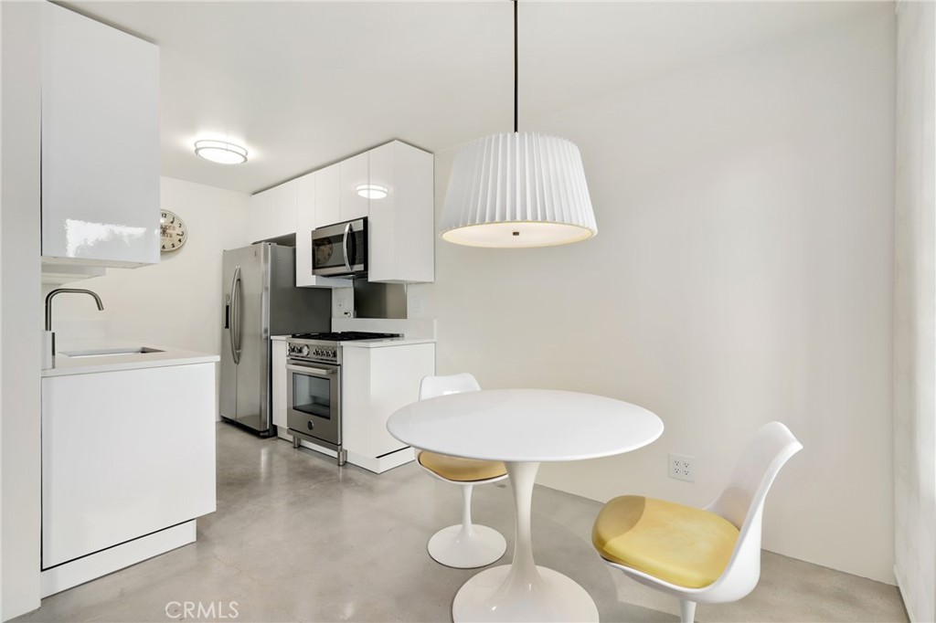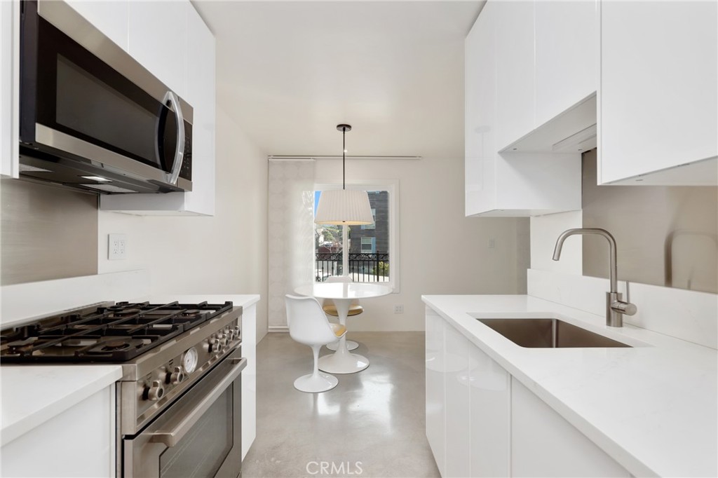Welcome to this beautifully updated 1 bedroom 1 bath condo at 1125 Pico Blvd 109 offering modern comfort, thoughtful upgrades, and an ideal Santa Monica lifestyle. This residence has been completely remodeled with fully insulated walls for improved energy efficiency and sound reduction, newer vinyl windows, and a newer vinyl sliding glass door that fills the home with natural light and opens to the oversized balcony. Polished concrete floors deliver a clean, contemporary look that is both stylish and easy to maintain. The remodeled kitchen features modern cabinetry and stainless steel appliances including a Bertazzoni Professional series gas range, microwave hood combo, and refrigerator, and flows seamlessly into the dining area where the Saarinen table and iconic Tulip chairs are included in the sale, complemented by a Rejuvenation light fixture that beautifully anchors the space. The spacious living room opens directly to the balcony facing Pico Boulevard with a peek-a-boo ocean view through the palm trees, creating the perfect spot to enjoy morning coffee, evening drinks, or relaxed people watching. A short hallway leads to a flexible work-station that can be converted to a stackable in unit washer and dryer, recently approved by the HOA, and for those who choose not to install in unit laundry, the community laundry room is conveniently located immediately adjacent to the unit and is accessible without climbing any stairs. The luxurious full bathroom is appointed with Kohler fixtures and a deep 60 gallon soaking tub and shower combo highlighted by a ceiling mounted rain style shower head. Storage is abundant with a hallway closet and a walk-in closet in the bedroom, which is tucked privately at the end of the hall. The unit offers step free access with a gated ramped entrance from quaint 12th Street that leads directly to the condo without climbing a single stair. Additional features include one dedicated underground parking space and a private lockable storage area nearby. Located less than a mile from the beach and just a short stroll to restaurants, parks, schools, and shops, this home delivers the best of Santa Monica living while offering outstanding value in a highly desirable coastal community.