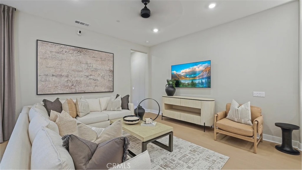 This three-story townhome is host to an open floorplan shared between the kitchen, living and dining rooms, with direct access to an outdoor room through sliding glass doors. A secondary bedroom at the back is ideal for overnight guests or a home office. A loft and three bedrooms occupy the second floor, while the top level has a spacious bonus room and outdoor terrace.