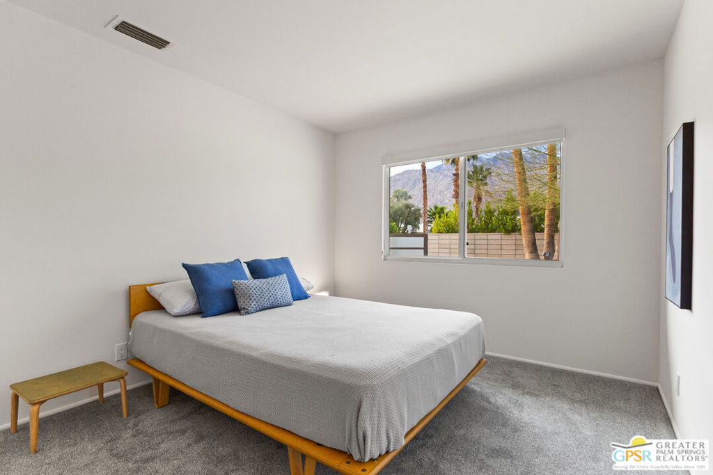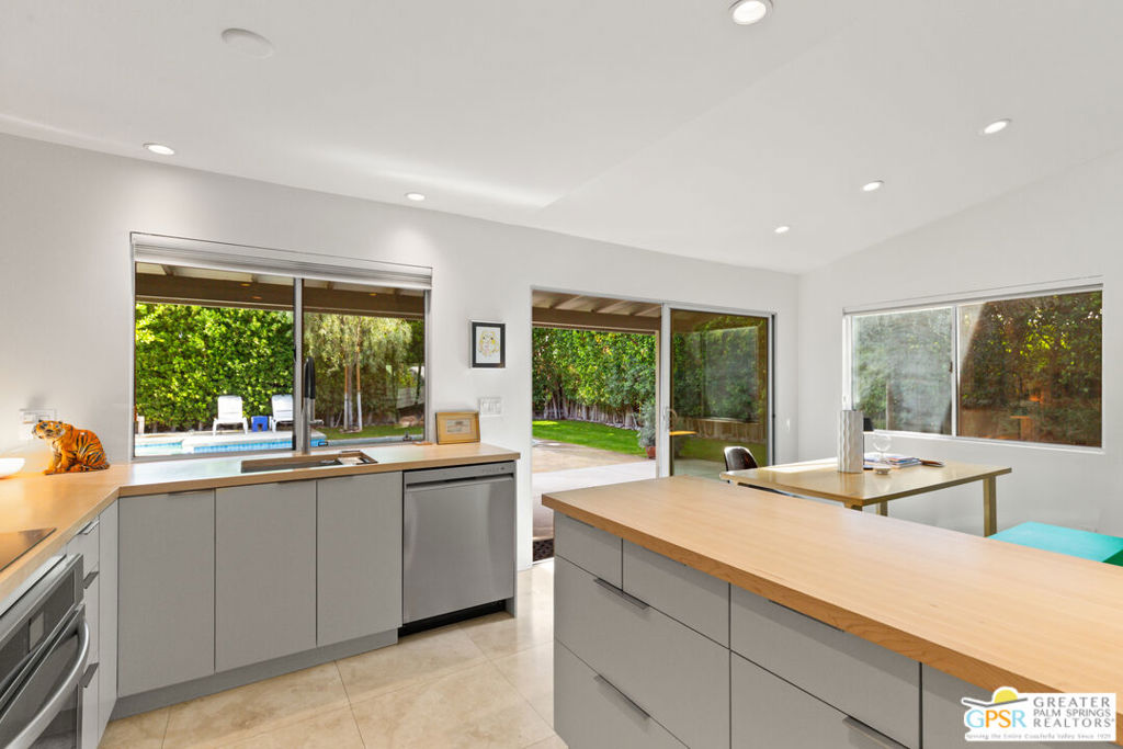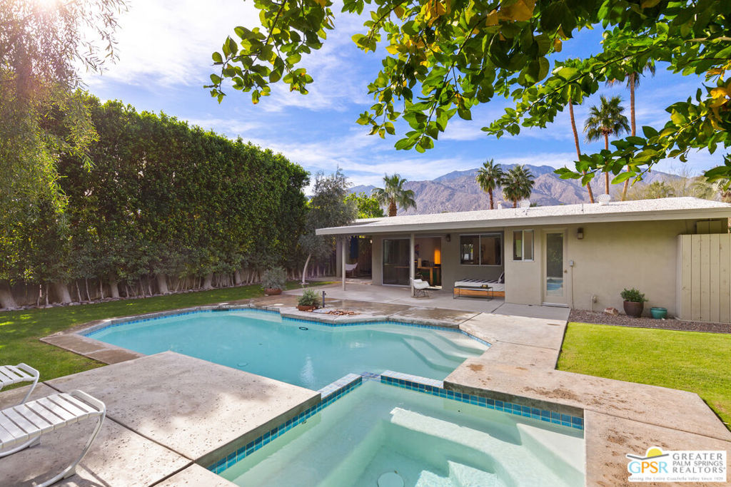 Tucked behind private gates in the sought-after Movie Colony East neighborhood of Palm Springs, this mid-century ranch offers the perfect blend of style, comfort, and indoor/outdoor living. A mature ficus hedge surrounds the property, creating complete privacy in the serene backyard oasis featuring a sparkling pool and spa, mountain views, and a covered lounge area designed for relaxation and entertaining. Inside, the home showcases vaulted ceilings and an open floor plan filled with abundant natural light. The newly updated kitchen is a standout, featuring custom cabinetry, stylish countertops, and modern appliances ideal for both everyday living and hosting guests. Updated lighting enhances the home's clean, contemporary feel. Freshly painted inside and out, the residence also offers new carpet in the bedrooms and beautiful travertine flooring throughout the main living areas. Every detail has been thoughtfully updated, making this a truly move-in-ready opportunity in one of Palm Springs' most desirable neighborhoods.