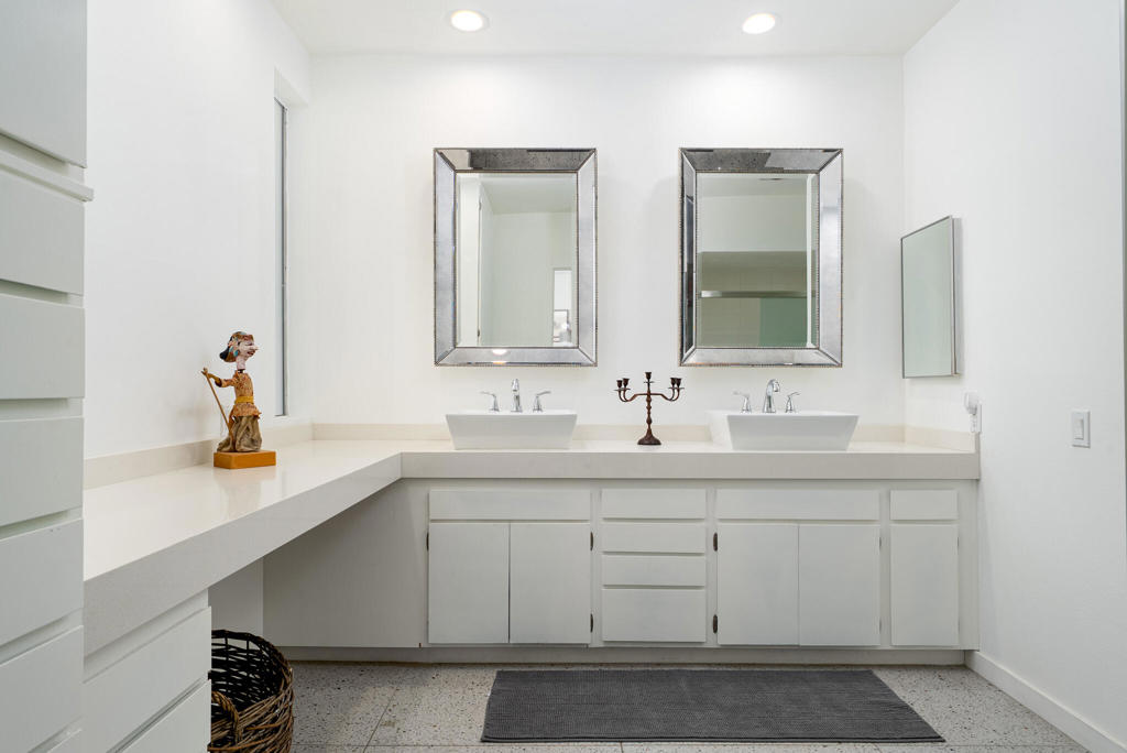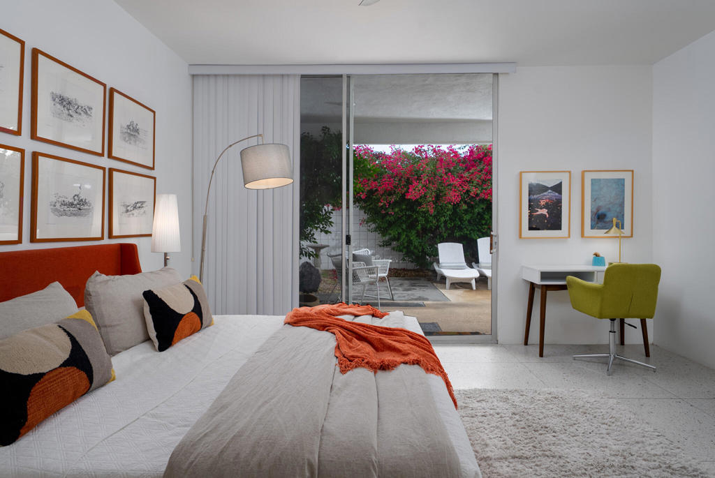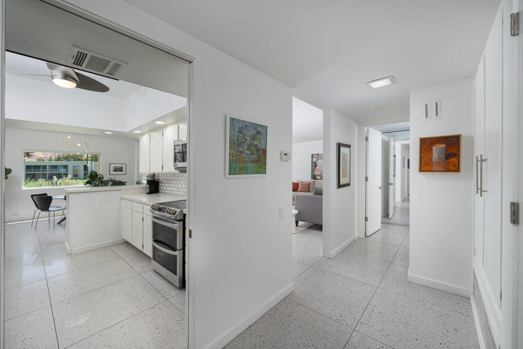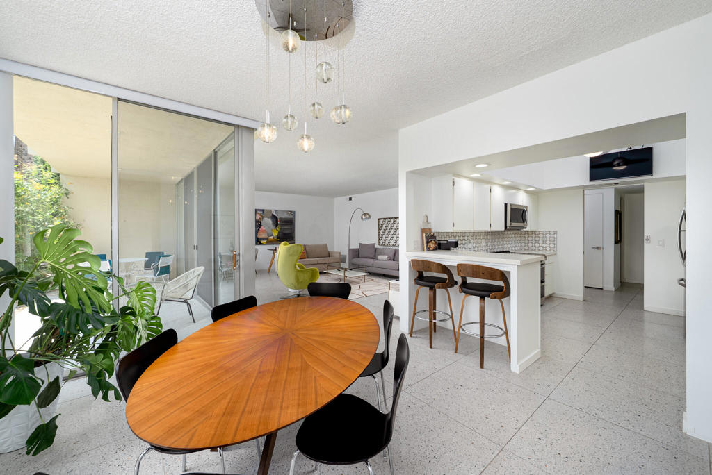 Set within the architecturally significant community of Seven Lakes Golf & Country Club in South Palm Springs, 519 Desert Lakes Drive is a rare offering. Designed in 1972 by architect Richard E. Harrison, this south facing mountain residence features one of the community's most uncommon floor plans--seldom available and highly sought after. This residence could be a wonderful weekend pied-a-terre--or a full-time statement--in one of Palm Springs' most legendary communities.This downstairs home offers the ease of single-level living along with a private one-car garage, a true luxury in Seven Lakes. Thoughtfully renovated, this architect owned home showcases high ceilings and dramatic floor-to-ceiling glass, creating a seamless connection between indoors and out while flooding the space with natural light.The home opens directly to the golf course, overlooking the 13th hole, famously known as the site of President Dwight D. Eisenhower's only hole-in-one. The view is expansive yet tranquil, and the property's location within a quiet enclave of the community ensures exceptional peace and privacy.A large, private courtyard provides an additional outdoor living space--ideal for entertaining, relaxing, or enjoying the desert climate in complete seclusion.With a proven and successful rental history, this property offers flexibility as an income-producing investment, a stylish desert retreat, or a wonderful full-time residence for those who appreciate midcentury architecture, golf course living, and the timeless appeal of Seven Lakes.An exceptional opportunity to own a distinctive piece of Palm Springs architectural history. The Seven Lakes Golf & Country Club community also known as the 'Gem of the Desert' situated along the Ted Robinson designed golf course. Community amenities include: 24-hour guard at gate, 15 pools/spas all heated at season, pickleball court, onsite HOA and sales office, electric car charging stations and famous William Cody designed clubhouse with restaurant/bar.