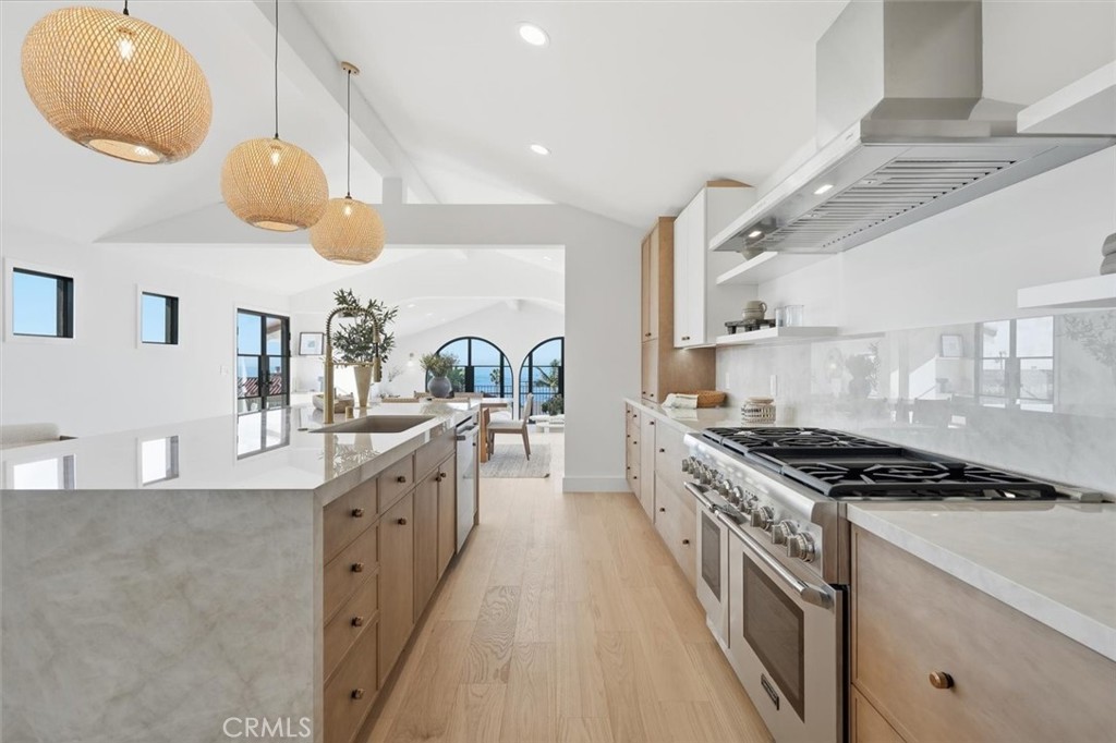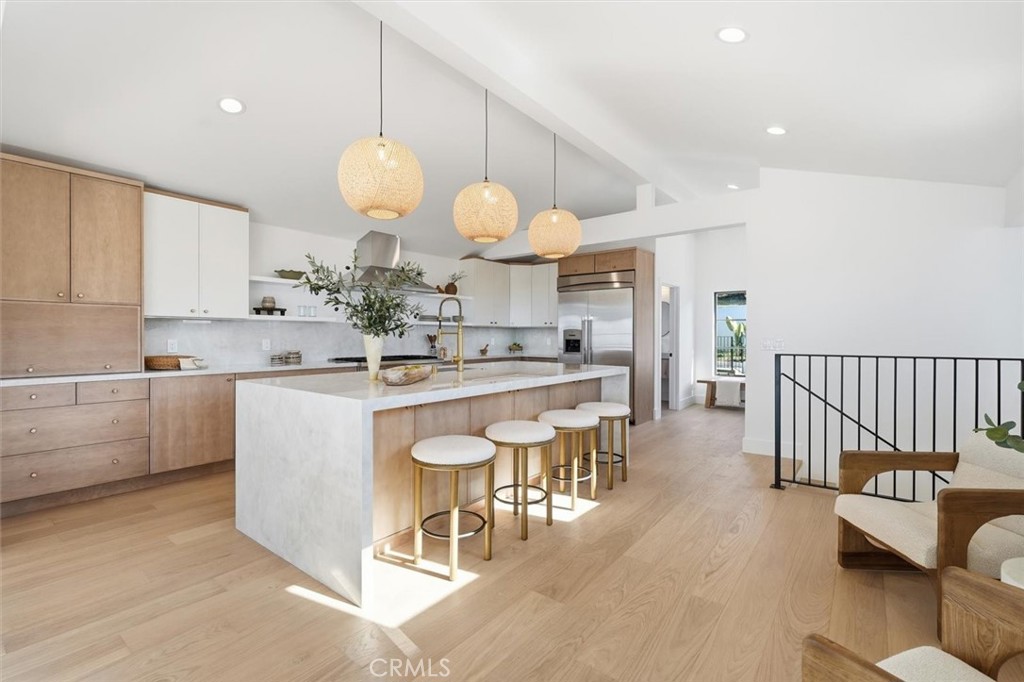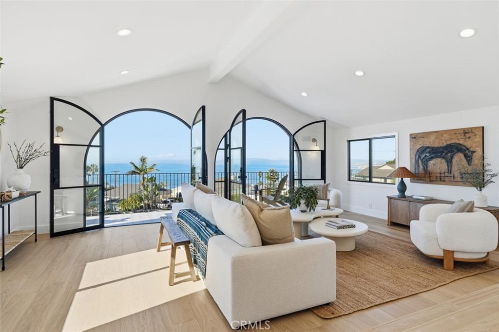 Perched above the coast, this beautifully reimagined Spanish Montecito residence commands sweeping ocean views, city views and mountain views stretching from Catalina to Malibu, to Culver City, to downtown LA and beyond. Every inch of this residence was redesigned with intention, vision, and unapologetic confidence. Classic Montecito proportions meet Tulum’s raw natural elegance, warm woods, and hand-selected stone. Spanning approximately 3,000 SQFT (BTV), this home offers 4 bedrooms plus an Office and 3.5 bathrooms on a generous 7,910-SQFT lot (BTV). A reversed OPEN floor plan elevates daily living, placing the kitchen, dining, and living spaces upstairs, where iron-arched doors open to a wrap-around ocean-view balcony—framing the horizon like a live painting. Natural light pours in from sunrise to sunset, and city twinkling lights at night. The kitchen is refined, elegant and functional, featuring custom cabinetry, a substantial center island, Taj Mahal porcelain counters, high-end appliances and a walk in pantry. The primary suite is a private retreat, opening to its own patio—quiet, serene, and removed from the world. The spa-like bath features hand trowel concrete, a soaking tub, a walk-in shower, a double vanity, and a spacious walk-in closet. A second ensuite bedroom on the same level offers comfort and privacy for guests. Two additional bedrooms, a full bath, a laundry closet, and a flexible living or office space with its own bar opening seamlessly to the backyard ideal for work, rest, or hosting extended stays. The landscaped backyard is tiered and intentional, designed for both gathering and solitude. Fire pit, lawn, and multiple seating areas create moments throughout the day, while upper tiers capture ocean views. Moments from the beach, Riviera Village, dining, shopping, and scenic coastal paths this is a home that understands how people actually live. Meticulously finished. Deeply comfortable. A rare balance of soul, view, and livability.
