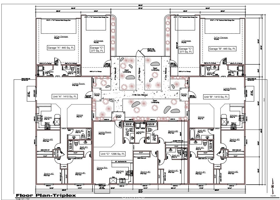 Fantastic investment opportunity! This modern, energy efficient triplex was built to California Title 24 standards and is designed to keep utility costs low while supporting long term tenant satisfaction. Each unit features its own solar panels, an attached garage with an EV ready charging outlet, all electric appliances, and individual water meters—helping minimize operating expenses for the owner. Units A and B offer approximately 1,400 sq ft each, with 3 bedrooms, 3 bathrooms, in unit laundry, and direct access to an attached 2 car garage. Unit C provides approximately 1,300 sq ft with a similar 3 bedroom, 3 bathroom layout and two individually assigned garage spaces attached to the building. All units enjoy a private patio with roughly 800 sq ft of finished concrete, plus curbs, gutters, and professional landscaping with sprinklers. The property is fully enclosed with a block wall, and common areas are equipped with security cameras for added peace of mind. Inside, each unit is finished with durable 20mm LVT luxury vinyl flooring throughout—ideal for reducing maintenance and turnover costs. With strong rental appeal, modern amenities, and energy efficient construction, this triplex offers stable income potential and long term appreciation. A standout addition to any investment portfolio.
