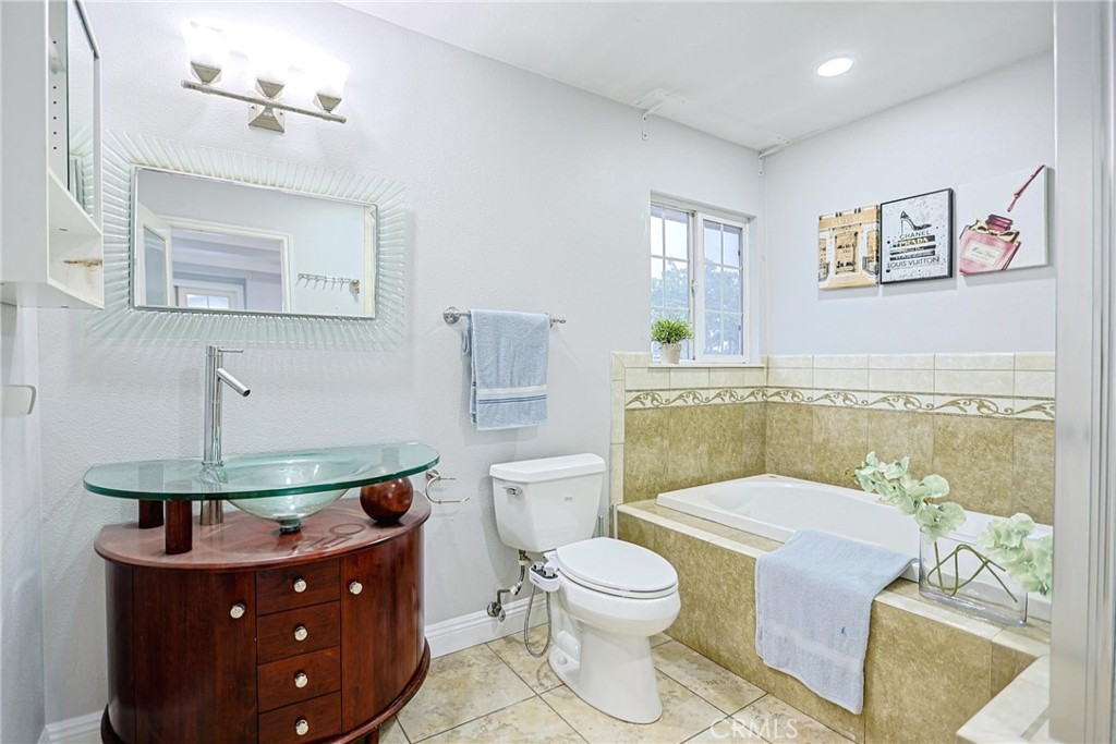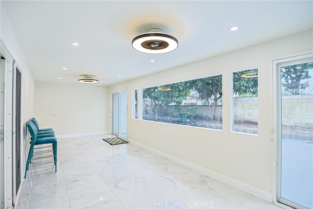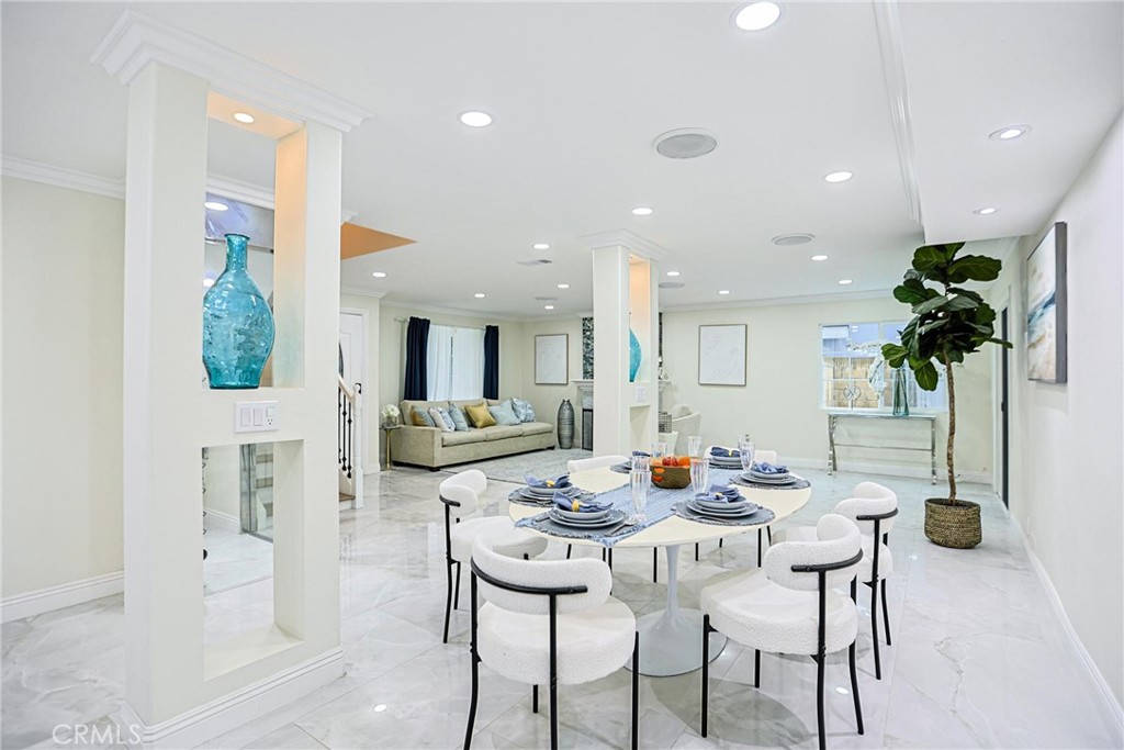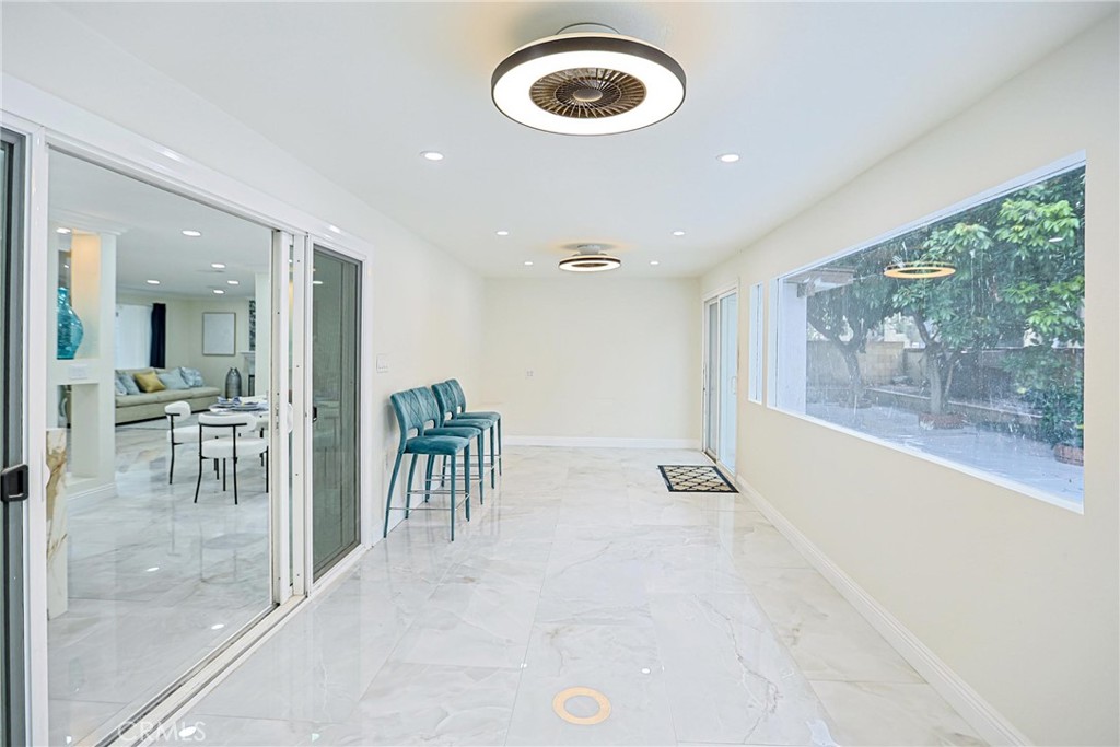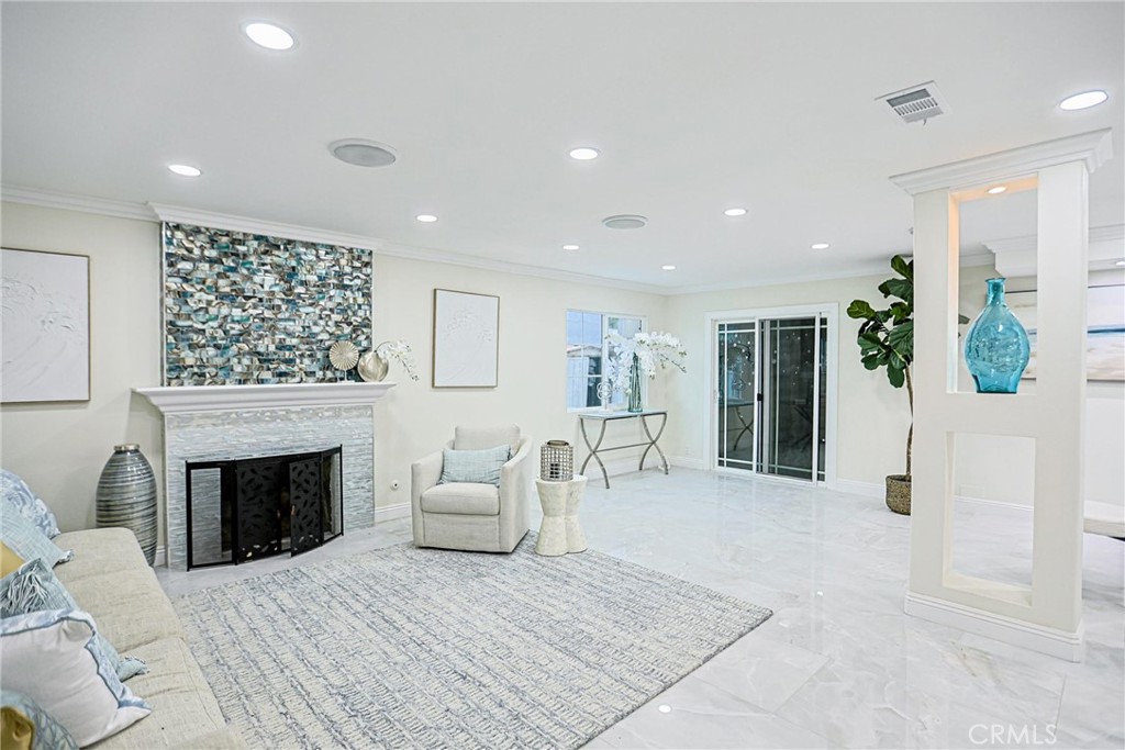 Welcome to 17230 San Lorenzo Circle, set within the coveted Green Valley neighborhood of Fountain Valley. This fully renovated home offers 4 bedrooms, 3 bathrooms, and a versatile bonus room across approximately 2,288 square feet on a 5,400 sq ft lot. Designed with modern living in mind, the open-concept layout is filled with natural light and enhanced by custom recessed lighting. The chef’s kitchen impresses with a dramatic waterfall island and seamlessly integrated appliances, while the living room is an entertainer’s dream—highlighted by a striking illuminated wine cellar and thoughtfully designed feature wall. Upstairs, you’ll find all bedrooms, including a luxurious primary suite featuring a private balcony, expansive walk-in closets, and a spa-inspired bath. Indoor-outdoor living is redefined with an enclosed glass patio that opens to a beautifully landscaped tropical retreat with mature longan trees. Additional highlights include solar panels, a low $45/month HOA with access to pools and clubhouse, and a prime location within walking distance of Mile Square Park and top-rated schools. Blending luxury, comfort, and community, this Fountain Valley gem is truly one-of-a-kind.