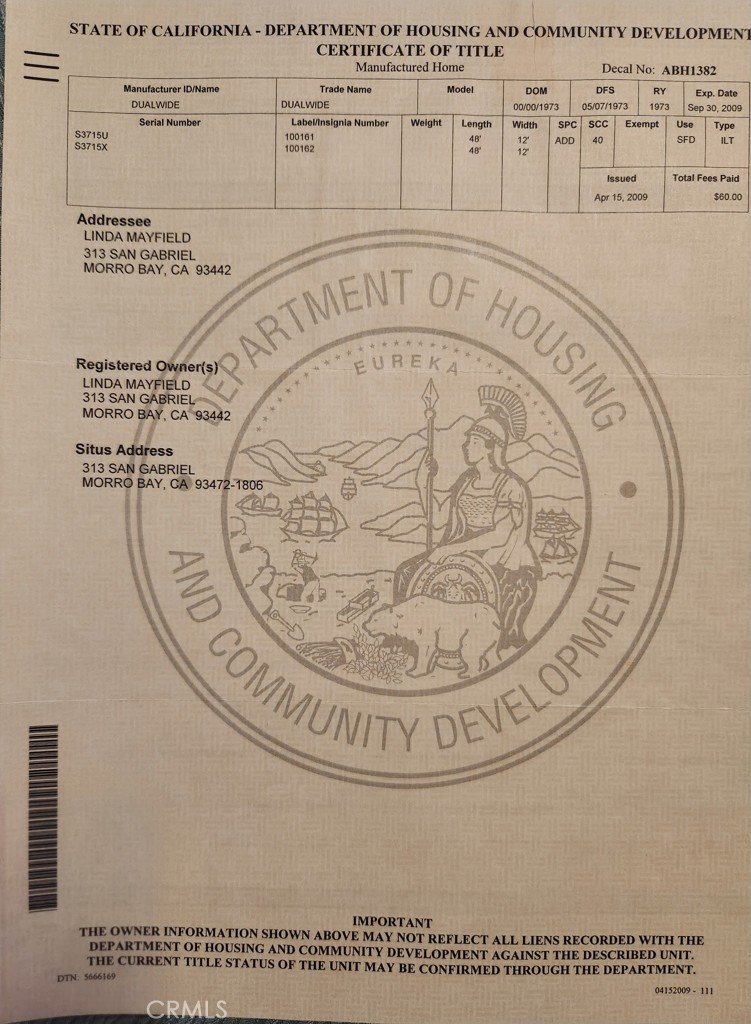 313 San Gabriel is a very rare purchase opportunity! This is in the Rancho Colina Mobile home park is for ALL AGES, not age restricted. Situated a mere 2 miles to the beach, where you own the land, thus your monthly fees are aprox. $200 a month. Enjoy fantastic valley views from the living room or your porch while you bask in the lovely weather provided living by the coast but outside of the fog and wind zone! This is a 2 Bedroom, 2 full bathroom home with large open living room situated on a good sized lot. The yard space offers ample areas for some gardening, as this is an excellent "grow" zone. Plenty of space to Park two cars in the driveway. Well maintained with past improvements in Dual pane windows, upgraded electrical panel, on demand water heater. Purchase as a wonderful full time residence or Coastal getaway. Live by the Beach for only $500,000, incredible these days!