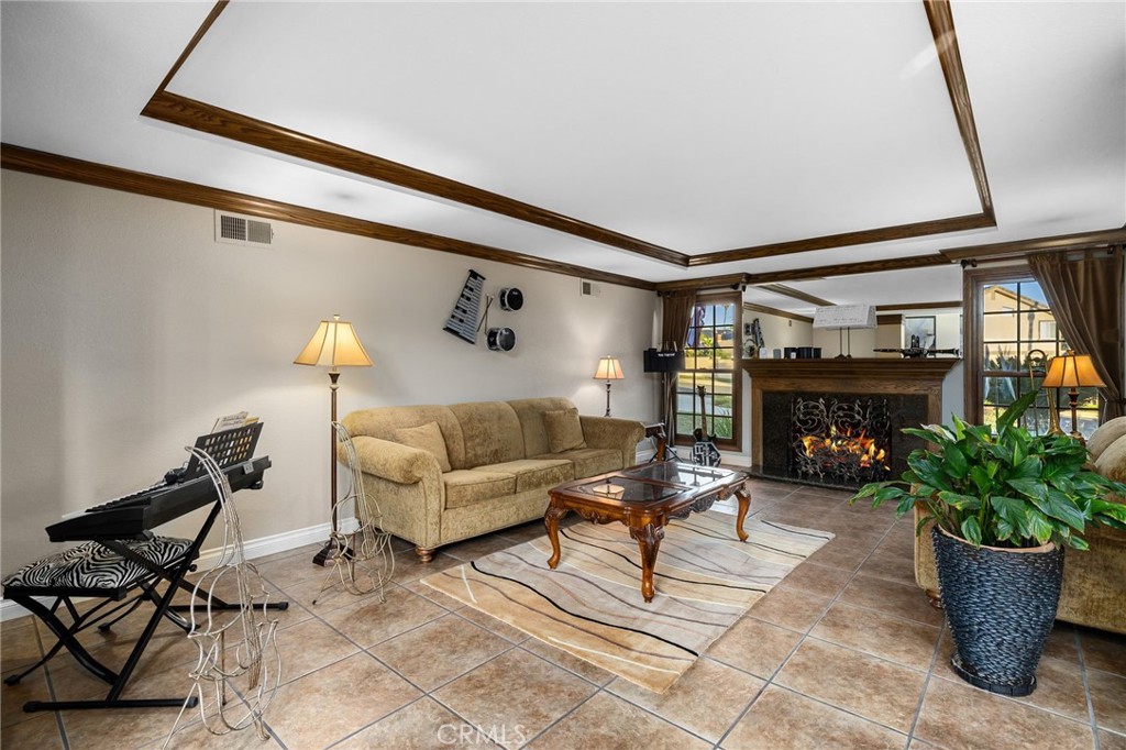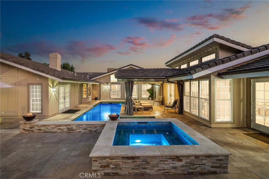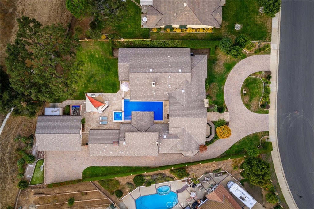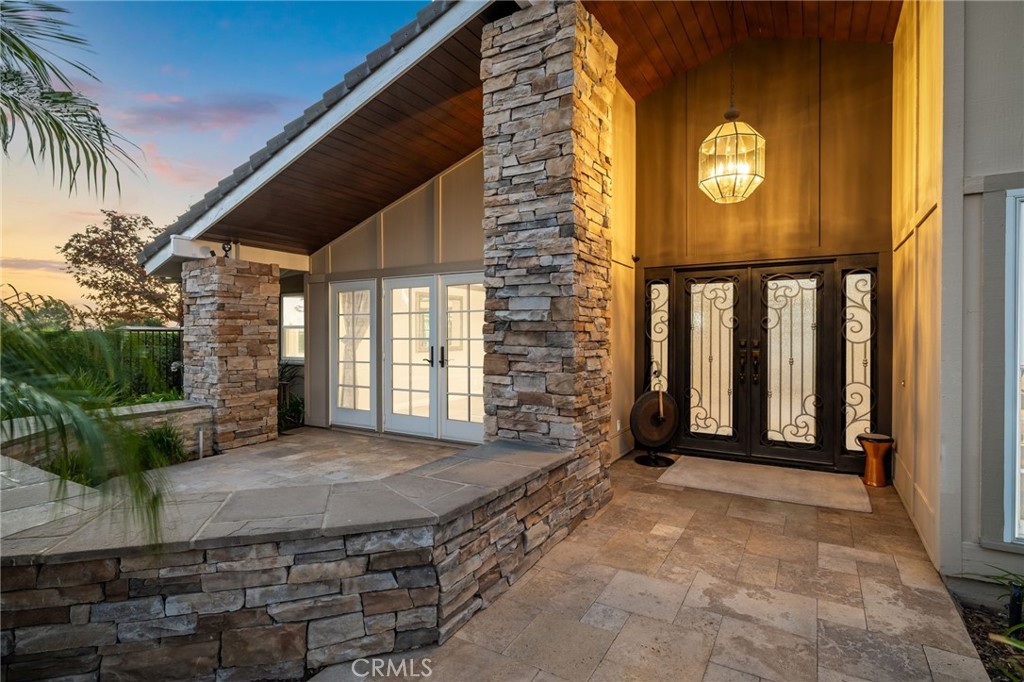 Custom California Ranch-Style Estate featuring a symmetrical façade, circular paver driveway, stacked-stone accents, and meticulous landscaping. Double iron-and-glass entry doors opens to a light-filled interior framed by floor-to-ceiling windows and wood-trimmed architectural columns, leading seamlessly into the formal living and dining rooms. The living room offers a tray ceiling with crown molding, a fireplace, and windows overlooking the front yard. The dining room offers a mirrored coffered ceiling and French doors that open to a front sitting area. The kitchen features custom wood cabinetry, granite countertops, stainless steel appliances, bar-top seating, and a breakfast nook with a built-in desk area. The adjacent family room offers a dramatic fireplace framed in granite, exposed white trusses, and wood-plank ceiling that blends architectural character. French doors and wood-framed, grid-style casement windows provide views and a seamless transition to the backyard. This wing also includes a bathroom with shower, a laundry room, and access to the three-car garage. On the opposite wing, an executive-style office showcases millwork, coffered ceilings, floor-to-ceiling built-ins, and richly stained cabinetry. The luxurious primary suite is a sanctuary–oversized and appointed with tray ceilings, dual sets of French doors, tall windows, and dual walk-in closets. The spa-inspired en suite bath features a jetted tub set beneath stained-glass windows, a walk-in shower, dual vanities with granite counters, and a double-sided fireplace shared with the bedroom. Additional bedrooms include one with an angled tongue-and-groove plank ceiling, and another with a tray ceiling. The hall bathroom features granite countertops, a frameless walk-in shower, and a jetted tub. The private, resort-style backyard is designed for elevated living–an expansive outdoor retreat ideal for entertaining or everyday luxury. A sleek PebbleTec pool is the centerpiece, paired with a stacked-stone spa, dramatic fire bowls, and cascading water features. A covered cabana lounge with vaulted wood ceiling, recessed lighting, heaters, and drapery offers a year-round outdoor living experience. A built-in BBQ island with stainless appliances, a fire table, sail shades, and paver decking sits beneath a majestic oak tree with views of hillside vistas. The detached three-car garage sits beyond a private gated driveway, where a putting green adds the final touch to this extraordinary estate.