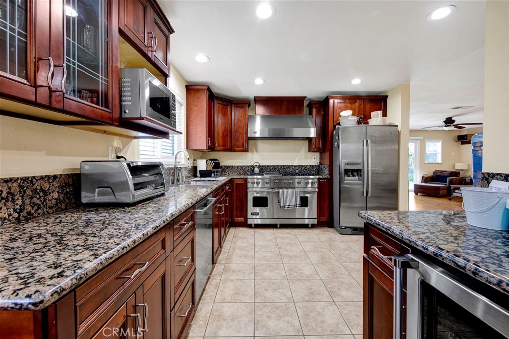 Welcome to this West Hills 5-bedroom, 3-bathroom pool home, with 2,375 square feet of living space. This inviting residence features a beautiful open-concept layout, with seamless flow between the kitchen, dining area, and living room. Perfect for relaxing and entertaining. Enjoy wood floors throughout, recessed lighting, ceiling fans, and wiring for surround sound. The gourmet kitchen boasts granite countertops, and premium Viking appliances, plus the refrigerator stays. A separate laundry room comes complete with a new washer and dryer for you. Stay comfortable year-round with a newer central A/C system, dual-pane windows and sliders, and copper plumbing. The luxurious master suite has, 2 large closets, its own sliding door to the backyard, and includes a relaxing Jacuzzi tub, and dual sinks in the master bathroom. A step-down bedroom on the other side of the home, currently serves as a flexible workout room, with direct access to the pool as well. Once outside to your private backyard oasis, you’ll be able to enjoy a sparkling pool with its own heater, which was recently re-plastered with fresh tile and coping — ideal for year-round enjoyment. Additionally you have security cameras, an alarm system, and a detached 2 car garage. Walking distance to the Fallbrook Mall, restaurants, shopping, and parks. Close proximity to Ventura Blvd, and local hiking trails. Shown by appointment only