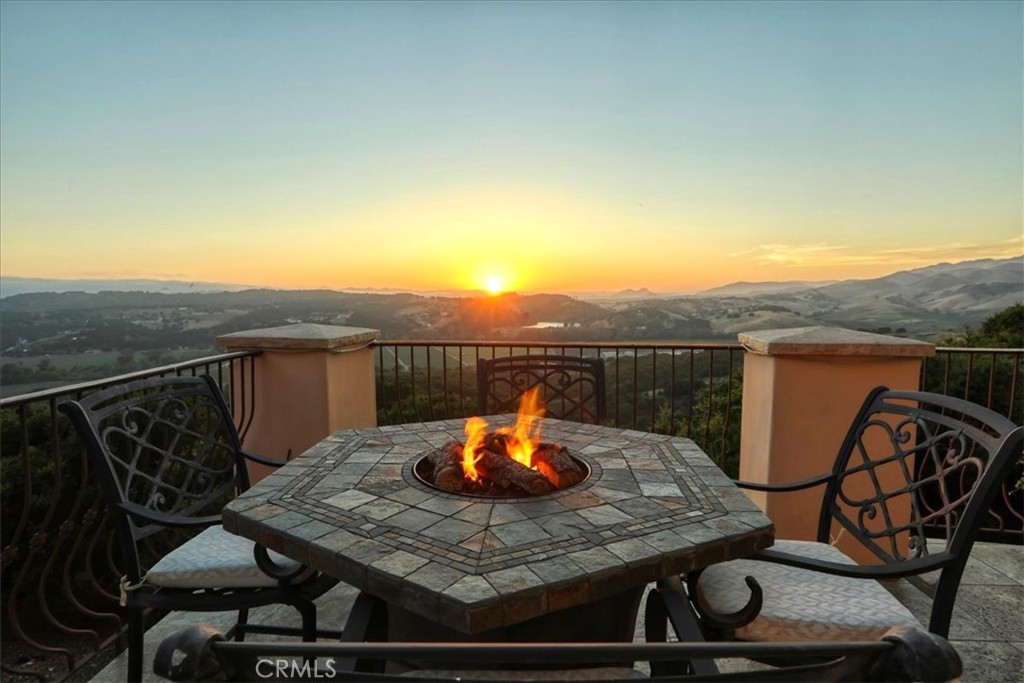 Perched to capture sweeping coastal and valley vistas, this magnificent Tuscan-inspired villa creates a sophisticated yet relaxing atmosphere. Absolutely incredible panoramic views extend to the Pacific Ocean, the Edna Valley, and beyond to the peaks of San Luis Obispo. A welcoming foyer features an elevated beamed ceiling and a beautiful custom wood and iron staircase. The thoughtfully designed floor plan offers elegant engineered wood flooring throughout the main level, complemented by natural wood-beamed ceilings. Five fireplaces throughout the home create a warm and intimate ambiance, while numerous Jeld-Wen windows provide abundant natural light and showcase the surrounding views. The main level includes a gourmet kitchen featuring custom cabinetry with sliding pull-out drawers, a Wolf cooktop with hand-crafted vent hood, built-in refrigerator, wine fridge, spacious granite countertops, and walk-in pantry. The adjoining great room with a wood-burning fireplace offers access on both sides to outdoor living spaces, making it ideal for entertaining. One side opens to a view deck over 50 feet in length, where picturesque vistas of the valley, vineyards, and ocean await. The opposite side leads to a protected courtyard with its own fireplace, creating a relaxed setting to enjoy sunsets and sweeping views. An additional south-facing courtyard is the perfect spot for morning coffee or breakfast as the sun rises above the oak trees. The owner’s suite is a tranquil retreat featuring an elevated ceiling, fireplace, and private view deck. The en-suite bathroom includes a separate soaking tub, walk-in closet, and a spacious step-in shower with valley and ocean views. Two additional guest suites each offer their own bathrooms, with one featuring a private view deck. Additional spaces include a library, gym, and office, each offering flexibility for a variety of uses or potential conversion to additional bedrooms. The home also features abundant storage throughout, including two closets intentionally designed for a future elevator if desired. On the lower level is a approximately 500 sq ft guest studio complete with kitchenette, full bathroom, private access, and private patio. A hobby room is conveniently located near the oversized three-car garage. Surrounded by over 4,500 acres of protected open space, Las Ventanas Ranch is a highly sought-after, exclusive custom home community, located just minutes from the Village of Arroyo Grande and San Luis Obispo.