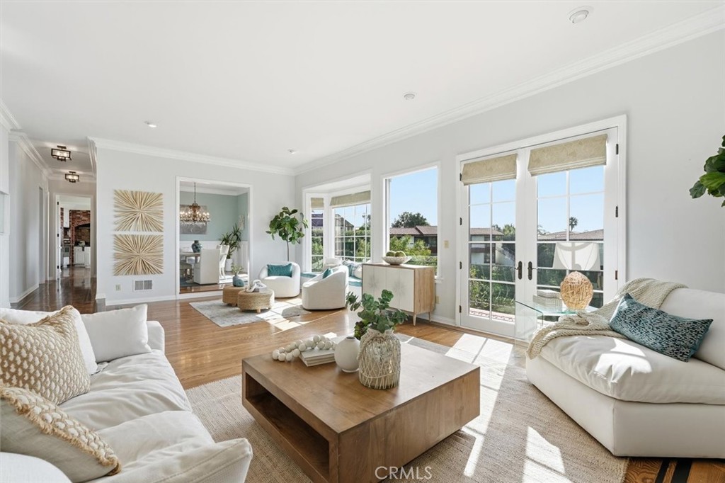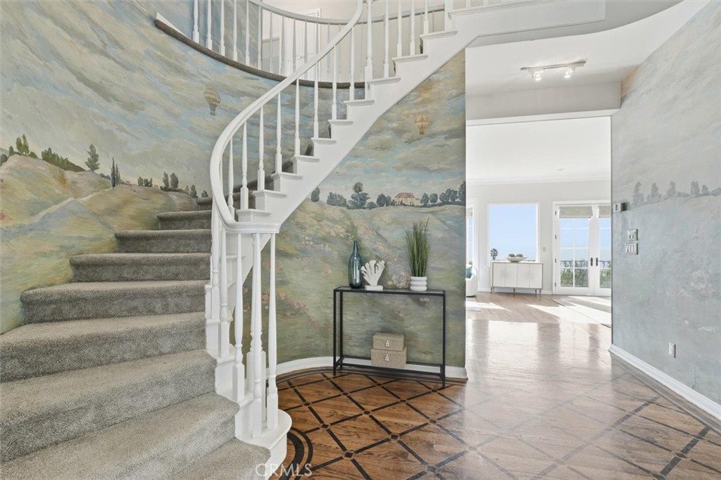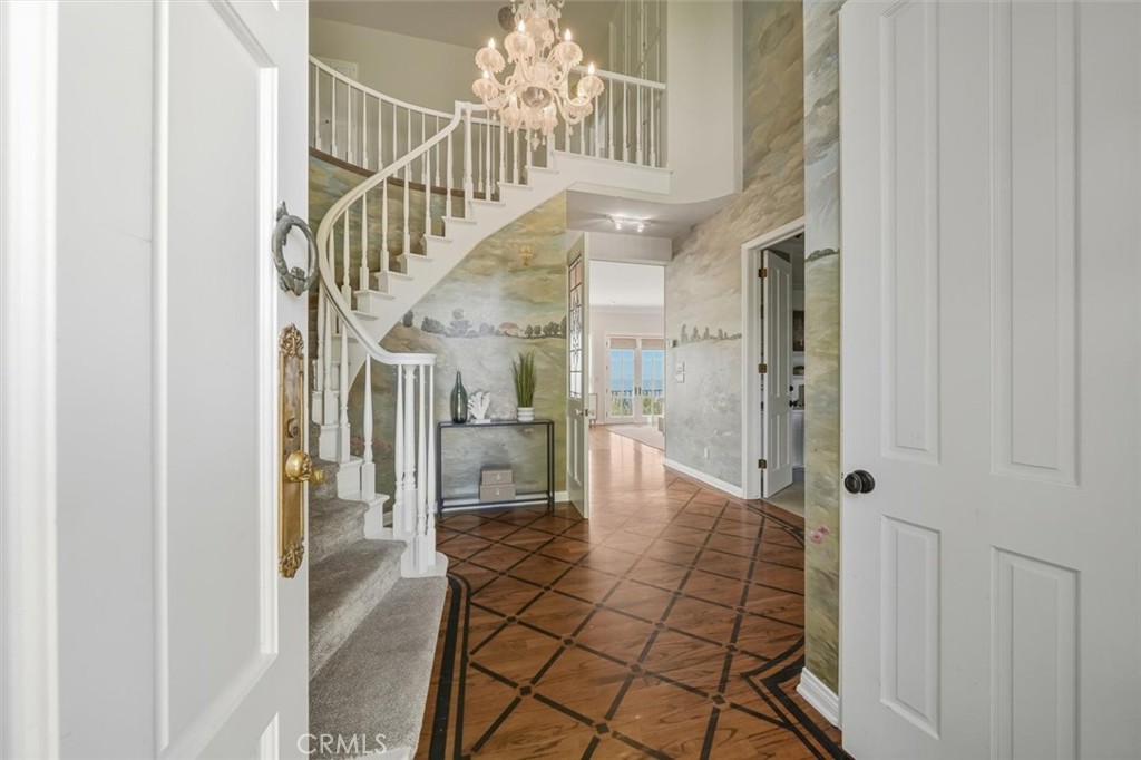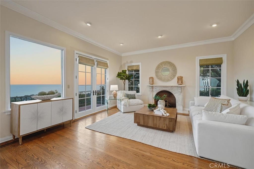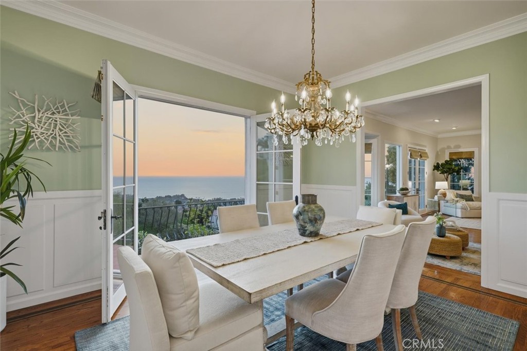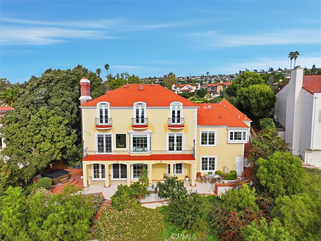 Peeking above lush landscaping and custom wrought-iron gates, this one-of-a-kind Elegant French Château captures breathtaking ocean and sunset views from all levels and nearly every room, creating a constant connection to the Pacific. As the automatic gate opens, you arrive through manicured hedges and colorful stonework to a residence that immediately impresses with its timeless French architecture, beautifully curated grounds, and three-car garage. Gray brick pavers lead to a dramatic double-door entry where soaring ceilings and a striking spiral staircase set the tone for the home’s grand scale and light-filled interiors. Just off the entry is a formal study with its own private entrance. Beyond, the living room opens to a full-width balcony framing expansive ocean and sunset views—an unforgettable focal point and a backdrop enjoyed throughout the day. The main level also features a formal dining room, a chef’s kitchen with high-end appliances, walk-in pantry, and eat in kitchen, a spacious laundry room with extensive storage, direct access to the three-car garage, and a guest bedroom adjacent to a newly updated bathroom—all enhanced by elevated ceiling heights and sweeping coastal vistas. Upstairs, the primary suite is a serene retreat with French doors and two Juliet balconies showcasing spectacular ocean and sunset views. The luxurious en-suite bath includes dual sinks, a large walk-in shower, soaking tub, water closet, and separate his-and-hers closets. Two additional bedrooms and a full bathroom complete this level, each enjoying the home’s signature light, volume, and views. Designed to comfortably accommodate multi-generational living, the lower level functions as a private living space of its own. This level includes a generous family room with 12' beamed ceilings, wood-burning fireplace, wet bar, hobby or workout room, and French doors opening directly to the brick backyard. Outdoors, enjoy an above-ground spa and built-in BBQ—perfect for relaxed coastal entertaining. Two bedrooms and two bathrooms complete this level, offering flexibility for extended family, guests, or long-term living arrangements. A rare opportunity to experience true joie de vivre in an exceptional ocean- and sunset-view residence where space, views, and architectural elegance converge.
