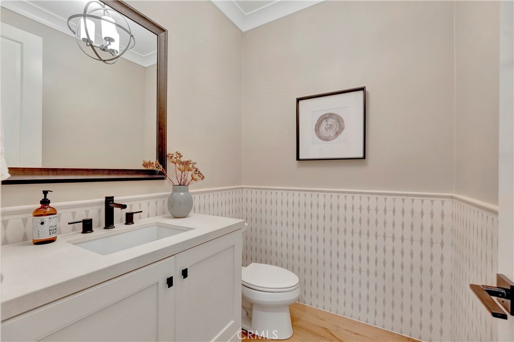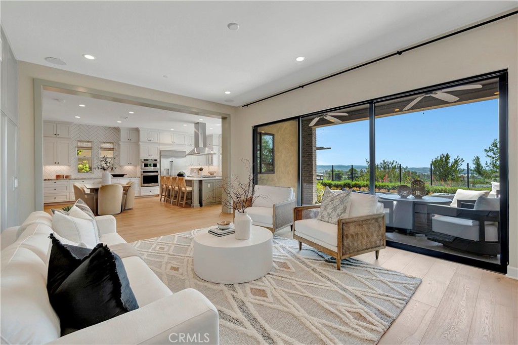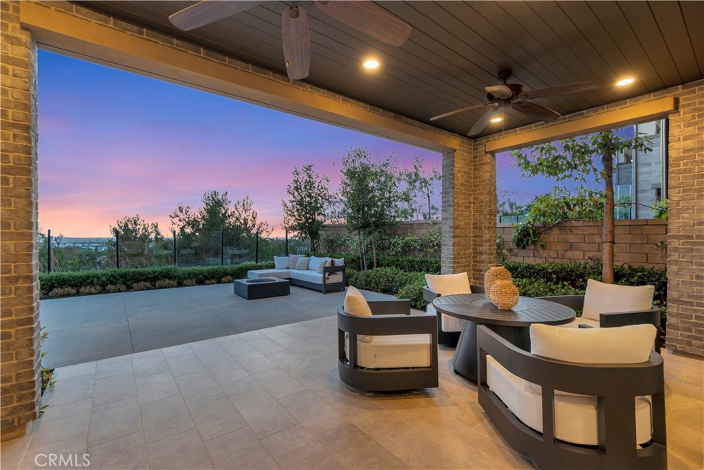 Originally built as a Teresina model home, this residence was designed as a showcase, capturing breathtaking panoramic views with luxurious upgrades throughout. Enter through the grand entryway with vaulted ceilings, setting the tone for refined, showcase-level living. Upgraded hardwood flooring and LED lighting flow seamlessly throughout the home. The gourmet kitchen features granite and quartz countertops, full-height tile backsplash, and top-of-the-line GE Monogram appliances, along with a spacious pantry featuring built-in open storage shelving. The great room showcases elegant wall paneling, a limestone fireplace, and stacking sliding doors that open to reveal sweeping views. The outdoor room, complete with ceiling fans and tongue and groove ceiling detail, is the perfect setting for outdoor dining and relaxation. The backyard features a pergola with a built-in BBQ island, perfect for hosting unforgettable gatherings. The first floor also includes an open-layout dining room, powder room with a limestone countertop, a den with built-in lighted cabinets and shelving, and a convenient bedroom with an attached bathroom featuring a quartz countertop. The second floor is home to a refined primary suite, offering expansive views and a private covered terrace with equally captivating vistas. The primary suite features a quartzite countertop, tile backsplash, and a GE Monogram wine chiller. Indulge in the primary bathroom, complete with quartzite countertops, floor-to-ceiling shower tiling, and a soothing rain can shower head. A large walk-in closet provides ample storage. The laundry room boasts white shaker cabinets and quartz countertops. The versatile loft space includes a wall-mounted TV pre-wire and charming tongue and groove wall detail. Two additional bedrooms, each with an attached upgraded bathroom, complete the second level. Ascend to the third story bonus room featuring a convenient kitchenette, white shaker cabinets, a granite countertop with waterfall edge, and a powder room. From here, step out onto the incredible roof terrace, where expansive panoramic views take center stage. The two-car garage offers a tankless water heater, epoxy flooring, and conduit for EV charging. This model home is a true showcase of refined design, premium upgrades, and breathtaking views.
