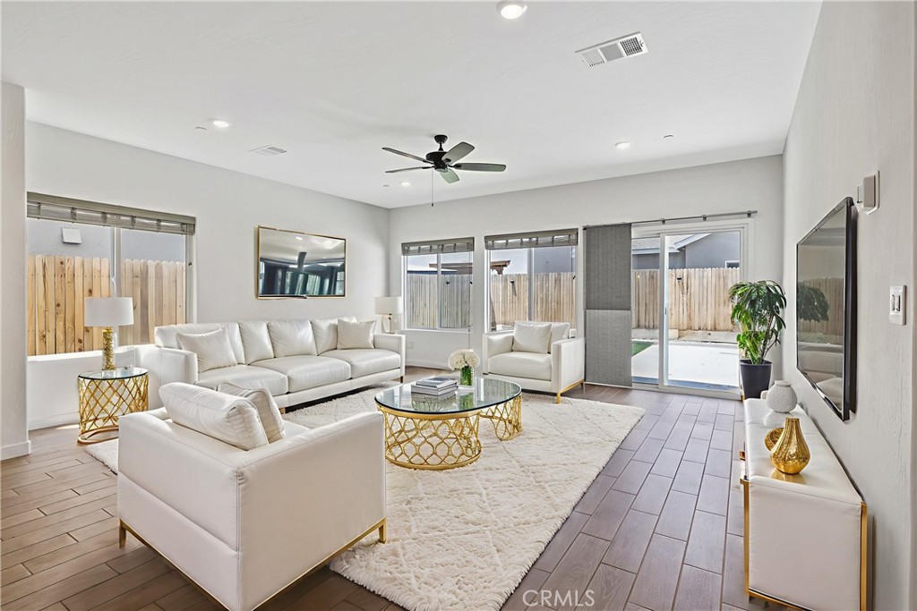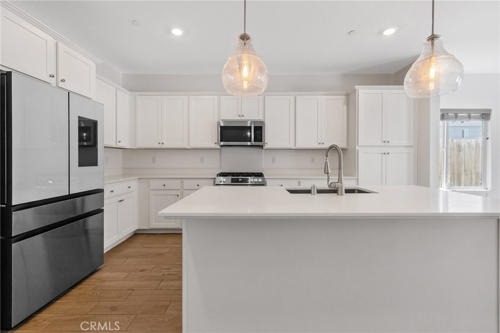 Welcome to this beautifully upgraded two-story home in NW Hanford, offering 5 spacious bedrooms and 3.5 bathrooms, including a guest suite with its own private bath conveniently located on the main floor. Enjoy an open-concept layout and modern touches throughout. The kitchen features Samsung smart refrigerator, stainless steel appliances, which will remain with the home. Additional highlights include zero blackout blinds, smart exterior lighting controlled via app, and a low-maintenance backyard with pet turf. The garage is EV-ready with hookups, and solar (owned) is included for energy efficiency. Bonus: Gym equipment can be included with the sale! Walking distance from Frontier Elementary School.