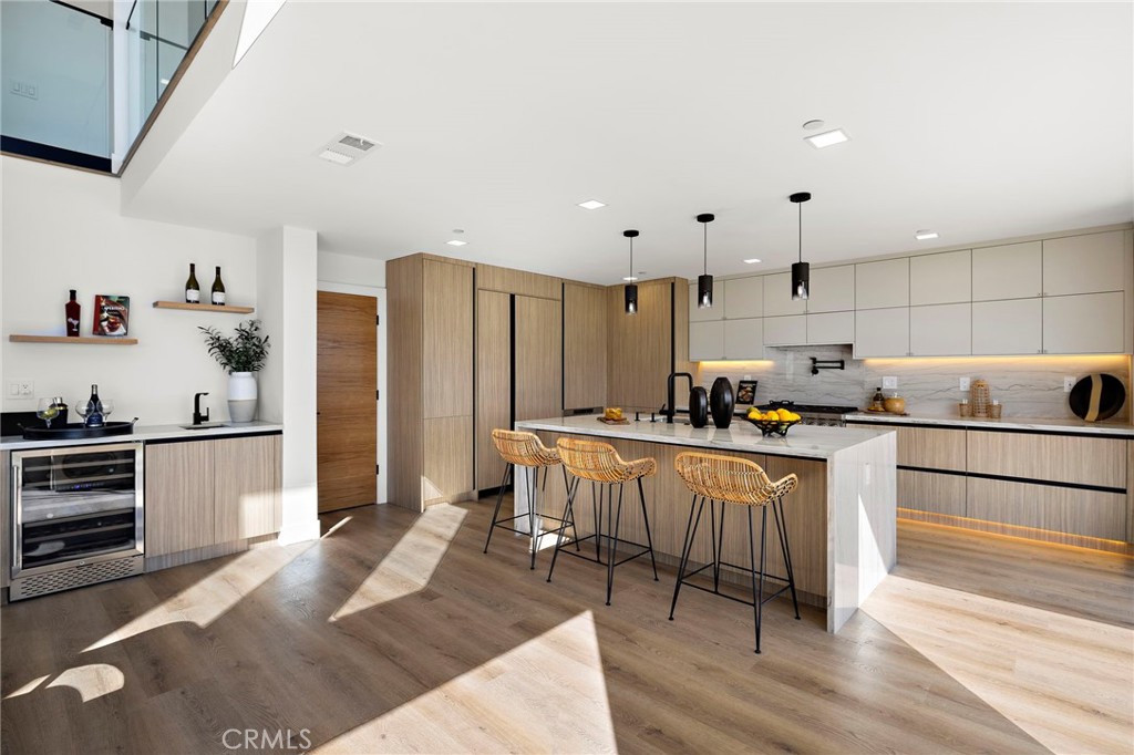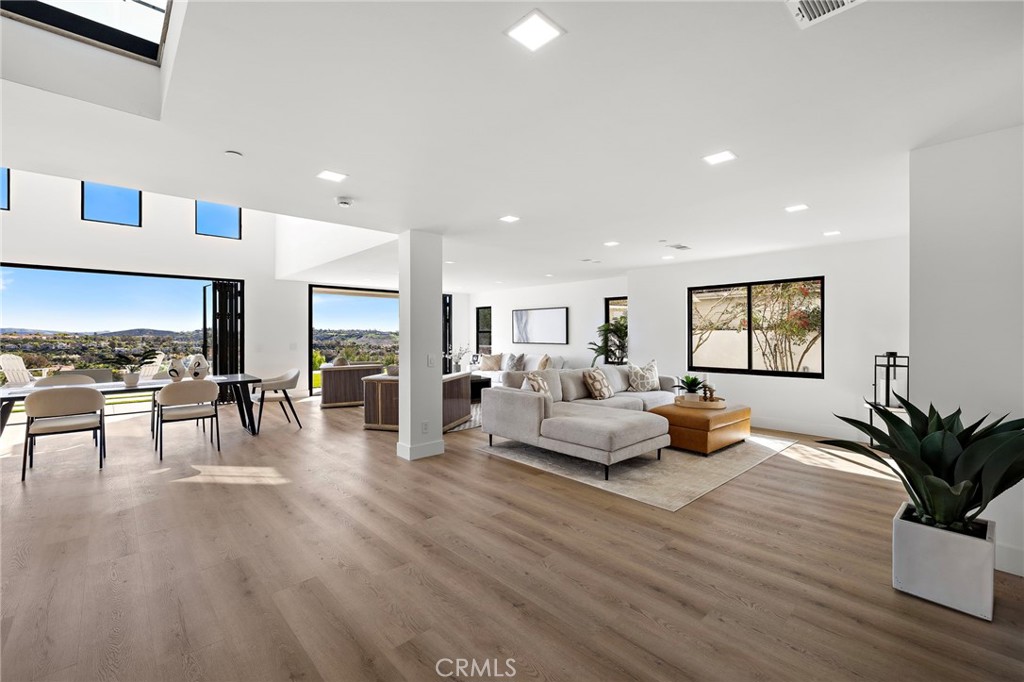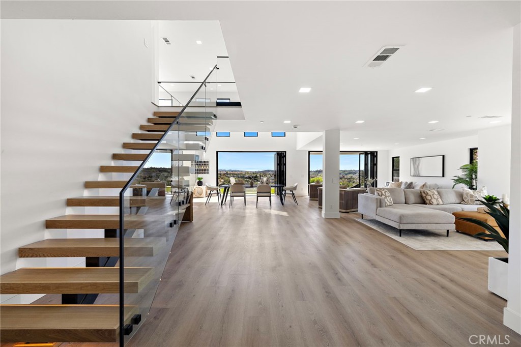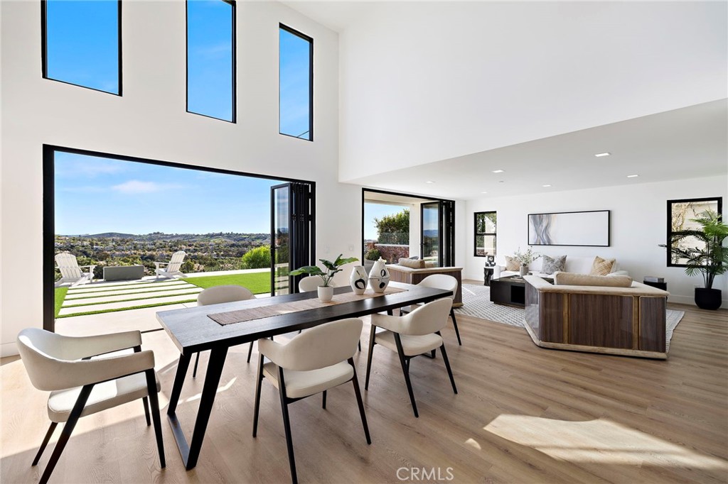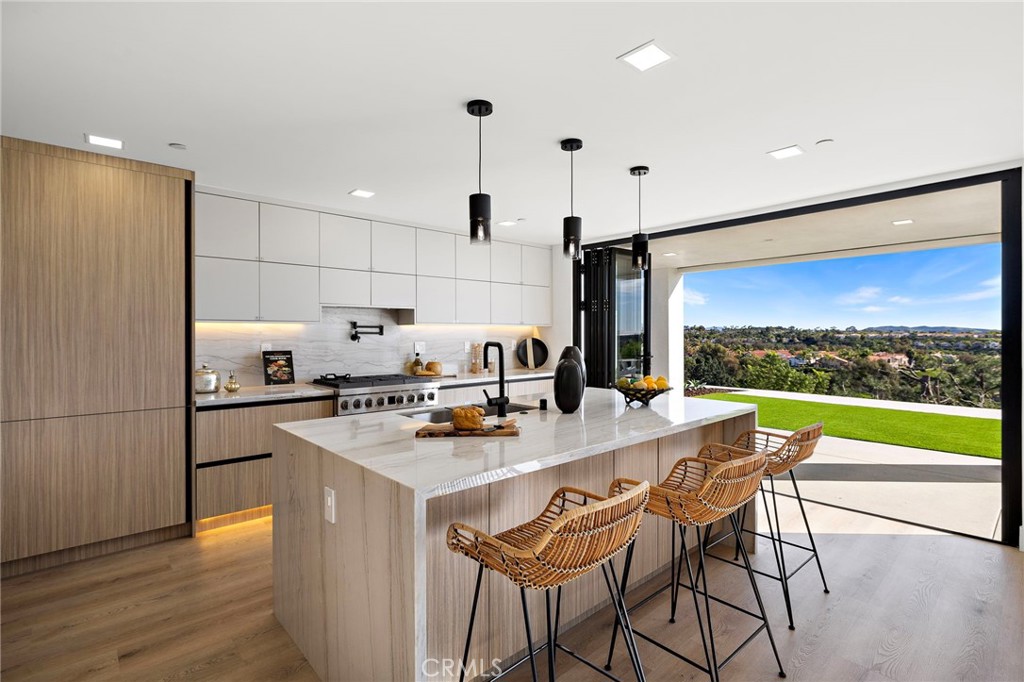 A striking modern retreat in Laguna Niguel, thoughtfully rebuilt down to the studs with dramatic architecture and effortless indoor-outdoor flow. Folding glass walls, private balconies, and expansive view decks frame ocean, canyon, and mountain vistas. Designed for elevated California living, the home features soaring ceilings, abundant natural light, and refreshing ocean breezes throughout. Architectural details include a sculptural floating staircase and sleek glass railings, creating a refined yet inviting aesthetic. Multiple patios and outdoor entertaining areas extend the living spaces, offering an ideal setting for both everyday enjoyment and hosting. The chef’s kitchen serves as the heart of the home, showcasing custom cabinetry, luxurious Macaba stone countertops, and a full suite of Dacor smart appliances. An oversized den with wet bar opens to a dramatic ocean-view deck, perfect for relaxed evenings or entertaining at scale. The well-considered floor plan includes dual primary suites on the upper level, along with a full bedroom on the main level with a private entrance—ideal for guests, extended family, or a dedicated office. Additional highlights include a standing seam metal roof and an integrated smart lighting system with tablet control. This exceptional residence offers modern luxury and thoughtful design in a premier coastal setting.