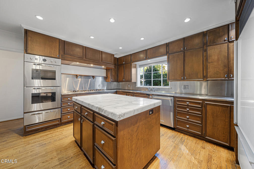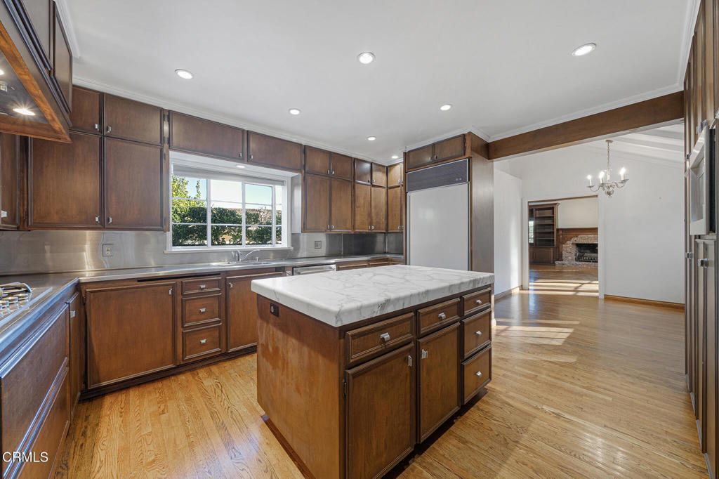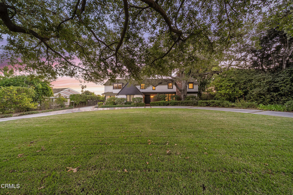 Discover timeless elegance in this beautiful English Tudor-style 4 bedroom, 5 bathroom residence, nestled on a quiet, tree-lined street in one of San Marino's most sought-after neighborhoods. Situated near the Huntington Library and Botanical Gardens, on a spacious, flat 0.39-acre lot, this 4,475 SF home presents a classic grand circular driveway and a professionally landscaped front yard, offering ample parking and a stately approach. Enter through the spacious foyer, where beautiful windows immediately draw your gaze to the expansive rear yard. The main level is designed for gracious entertaining. The elegant living room features a gas fireplace and French doors to the covered brick patio and rear yard. The spacious formal dining room, complete with a crystal chandelier, offers captivating views of the rear yard. The heart of the home lies in the kitchen, appointed with Viking stainless steel appliances, including a double oven and warming drawer, complemented by a marble-topped island and sleek stainless steel countertops. A charming breakfast room offers access to a brick entertainment patio and opens to a generous family room boasting high-beamed ceilings, a gas fireplace, and French doors to the rear yard. A separate laundry room features a sink, built-in hampers, and a service porch with a charming Dutch door. Completing the main floor is a bedroom, a 3/4 bath with a shower, plus a study with built-ins and leaded glass windows, ideal as a home office. Upstairs, there are 3 bedrooms, including the primary suite, a luxurious sanctuary with ample storage and an en-suite full bath, a walk-in closet/dressing room, plus an additional half bath. Two other generously sized en-suite bedrooms ensure comfort and privacy. The property's exterior is equally impressive, with a private rear yard. Mature Japanese magnolia trees are ready to burst into vibrant bloom, and numerous mature rose bushes add fragrance and color to the professionally landscaped surroundings. The 2-car garage includes an unfinished bonus room, offering potential use as a gym or home office. Owned by the second owner, this truly elegant home offers a rare combination of timeless architectural beauty, modern amenities, and a superb location. This property is located in the award-winning San Marino School District, near CalTech, and less than 2 miles from the shops and restaurants on South Lake Avenue in Pasadena.