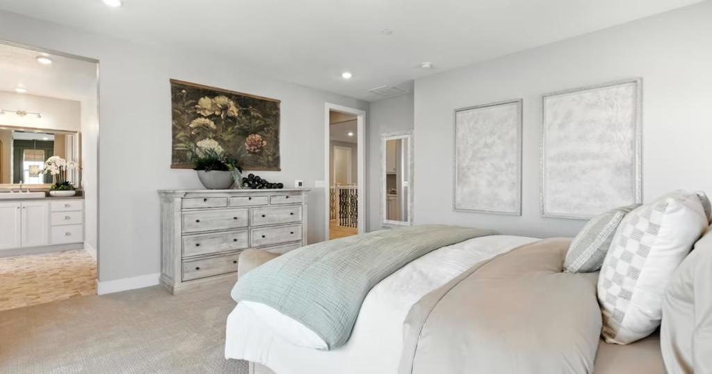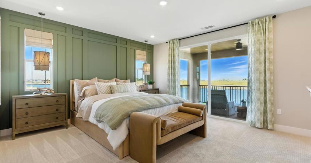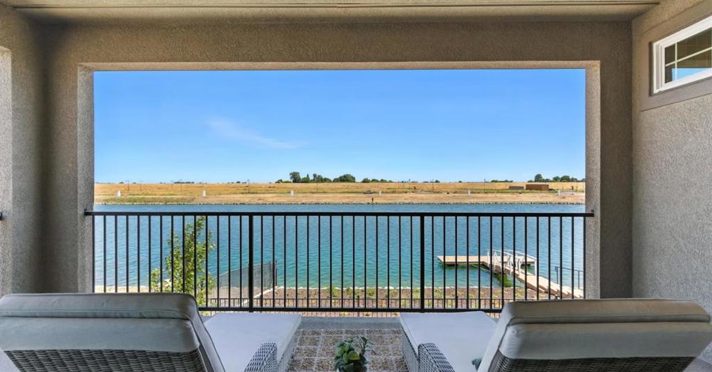 New construction at The Tides at River Islands by Tri Pointe Homes, Plan 5 at homesite 152 is a thoughtfully designed two-story lakefront residence offering 5 bedrooms and 4.5 bathrooms. Set along the water, this home showcases expansive lake views and stunning sunset vistas, best enjoyed from the covered deck off the primary suite. The open-concept layout features a gourmet chefs kitchen with walk-in pantry, ideal for entertaining and everyday living, along with an upstairs loft and conveniently located laundry room. A GenSmart Suite with kitchenette provides flexible living options for guests or multigenerational needs. The 3-car garage is equipped with 220V/50A copper wiring and a 4-prong receptacle, adding modern functionality. Located within the planned River Islands community, residents enjoy a scenic, resort-style lifestyle with water features, trails, and parks, along with convenient access to regional commute routes connecting to the greater Bay Area. Photos are of the Plan 5 furnished model home.