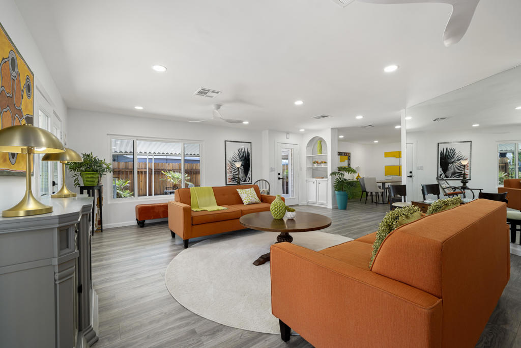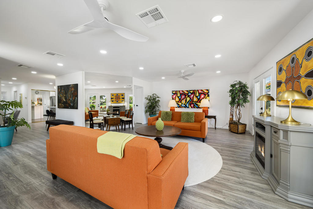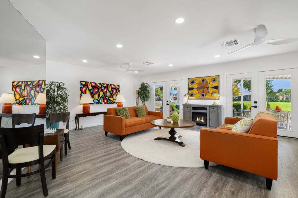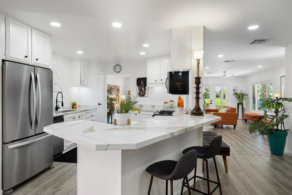 Welcome to 427 Calle Madrigal, a stunning mid-century inspired home located in the highly desirable Date Palm Country Club of Cathedral City. Offered turn-Key furnished, this beautifully updated 3-bedroom, 3-bathroom residence spans approximately 2,200 square feet and offers a rare combination of style, function, and breathtaking views of the golf course and tranquil pond. The main house features two spacious bedrooms and two fully renovated bathrooms, while the attached private casita includes one bedroom, one bathroom, its own updated kitchen, private entrance, and a separate mini-split HVAC system--perfect for guests, extended stays, or as a private rental. The casita presents a fantastic opportunity to generate additional income, helping to offset the land lease cost and increasing overall affordability.Both the main residence and casita enjoy expansive fairway and water views, and each boasts its own private covered patio for relaxing or entertaining. Inside, the home is flooded with natural light thanks to all-new windows and doors, enhancing the clean lines and modern feel throughout. The main house kitchen has been refreshed with quartz countertops and updated appliances while keeping the original cabinetry, maintaining its character and charm. The casita kitchen also features quartz counters, complemented by classic white appliances for a bright, clean look. All bathrooms throughout the property have been tastefully renovated, and the entire home is offered fully furnished with stylish, comfortable pieces, making it move-in ready. A detached garage provides additional convenience and storage.Whether you're looking for a full-time residence, seasonal escape, or an income-producing opportunity, 427 Calle Madrigal offers it all with timeless mid-century flair, modern updates, and one of the best views in the community.
