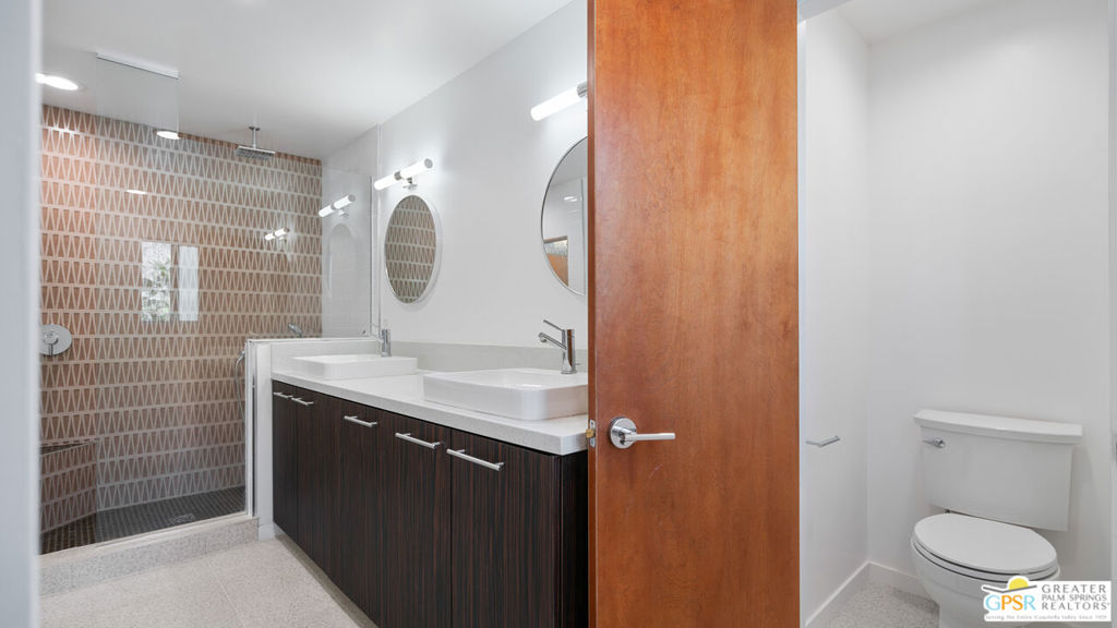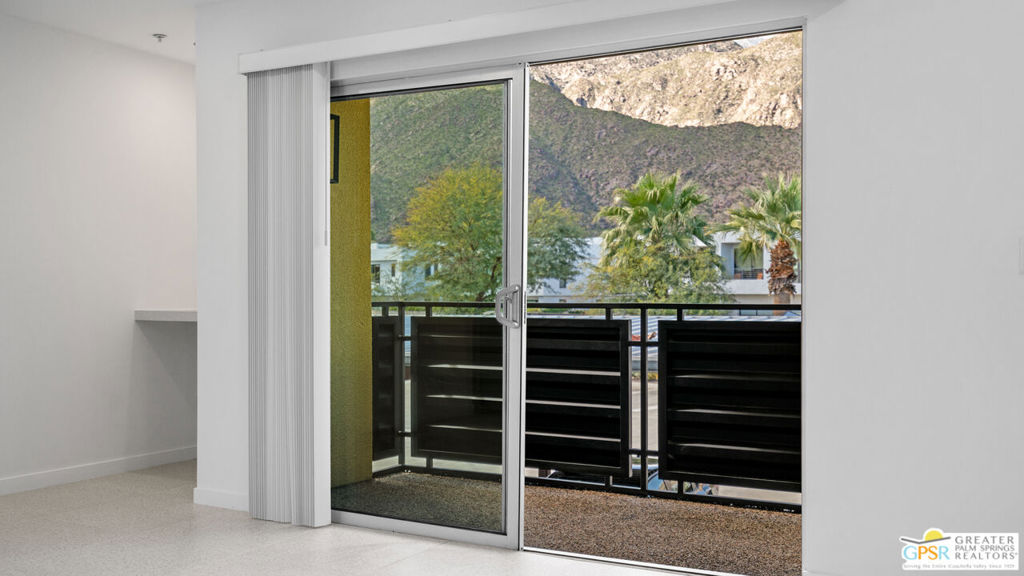 Perched on the second floor at Querencia Palms, this fully renovated 2-bedroom, 2-bath retreat captures sweeping San Jacinto mountain views - from your private balcony overlooking the koi pond and from the primary bedroom. Mid-century inspired style shines with terrazzo-look tile and fresh carpet, plus a personalized touch: the buyer can select the living room wallpaper, professionally installed to match their style. The kitchen features sleek finishes with WiFi-enabled appliances and an air-fryer oven, along with keyless fingerprint entry and in-unit laundry. Resort amenities include a beach-entry pool & spa, fire pits, BBQ/event space, gated access, and covered parking - just minutes to downtown Palm Springs, the CV Link, hiking trails, dining, and shopping.
